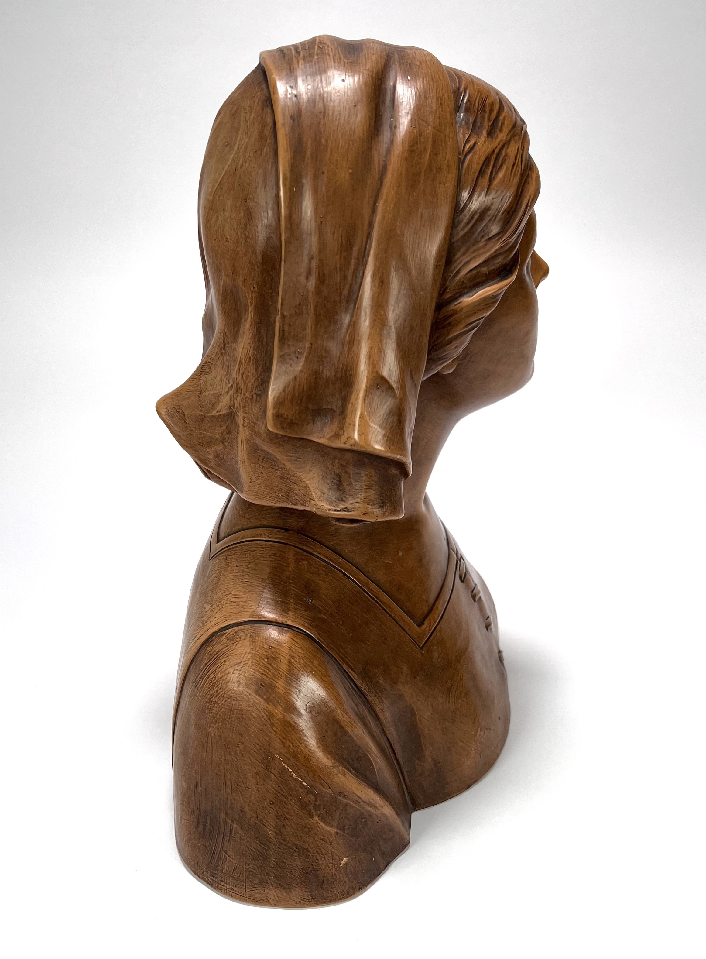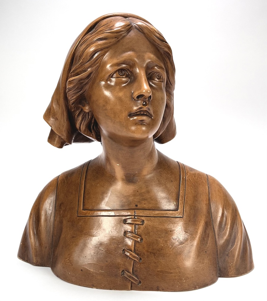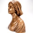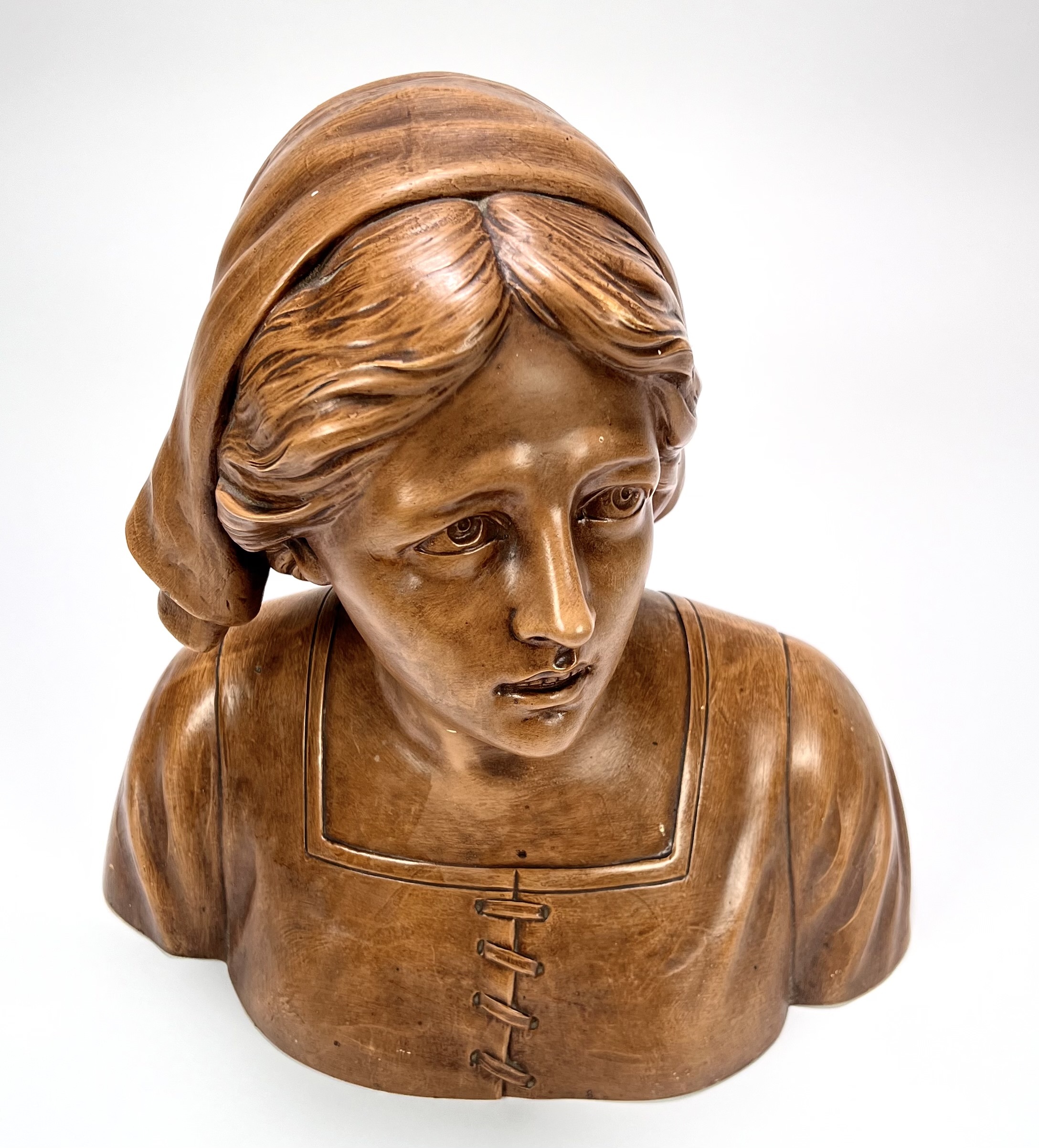 Keramieken bruin gepatineerd Art Nouveau buste van jonge vrouw in devotie op een marmeren basement, door Gustave van Vaerenbergh (1873-1927). Aan de achterzijde gesigneerd met vermelding van modelnummer 1117. België, begin 1900. |