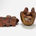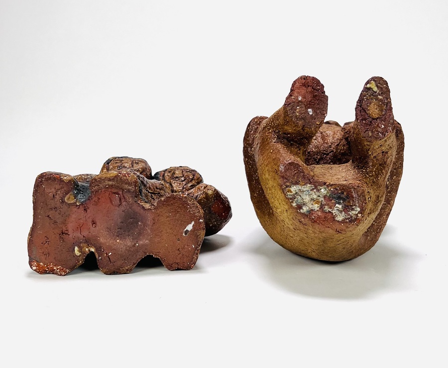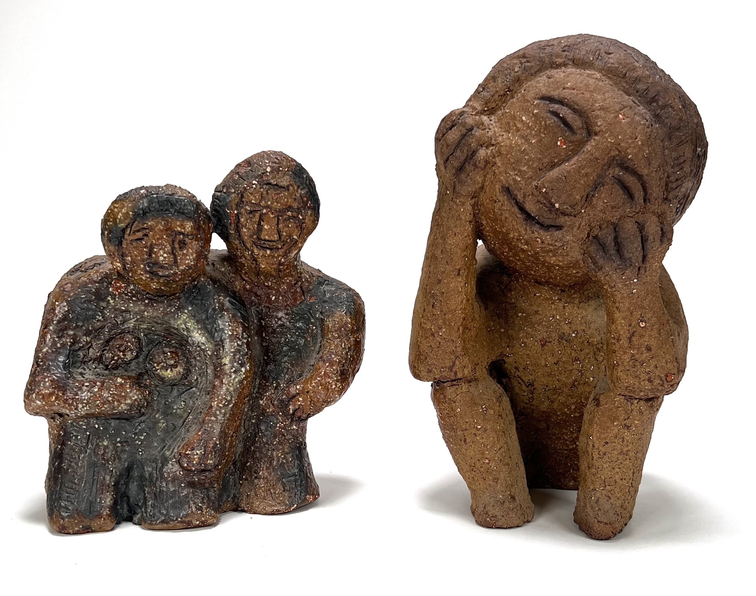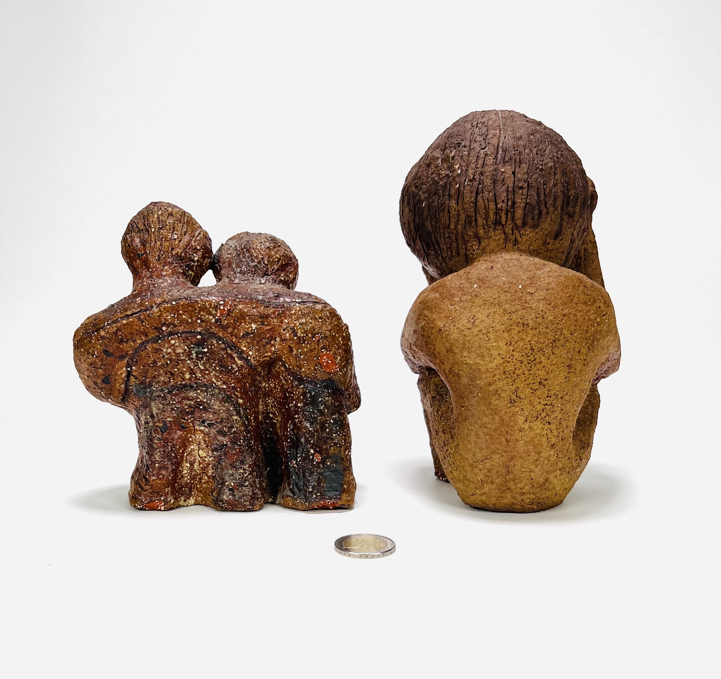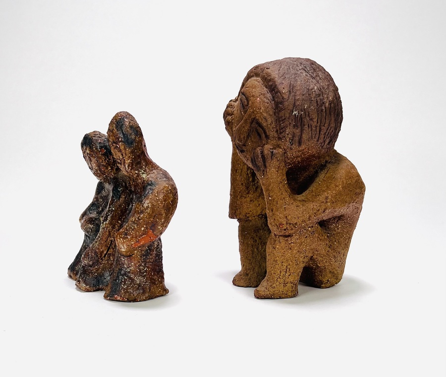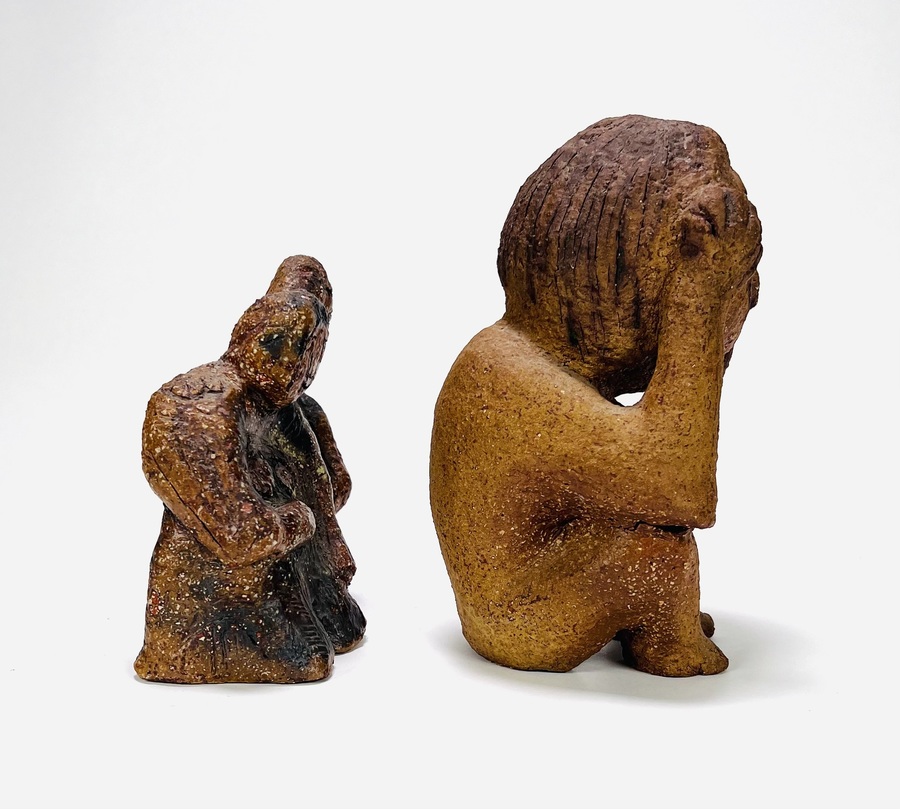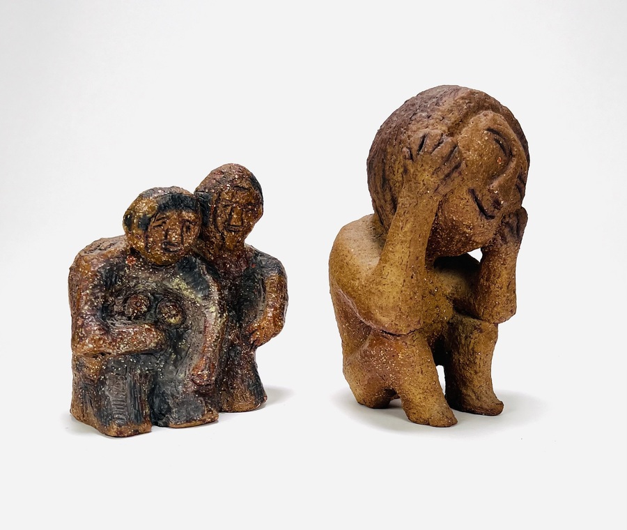 Twee aardewerken beelden van een zittende persoon en een paartje. Anoniem, 20e eeuw. |