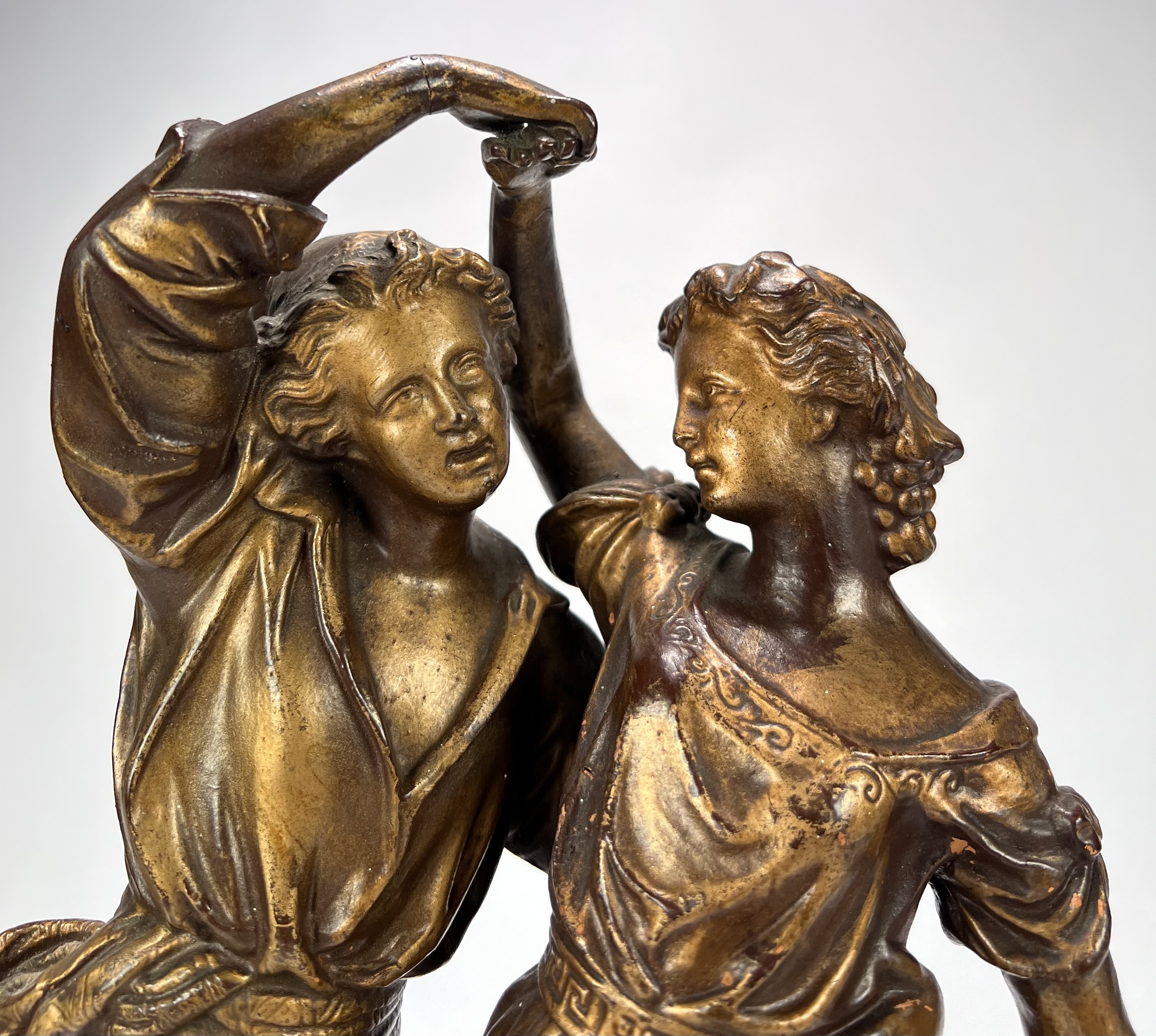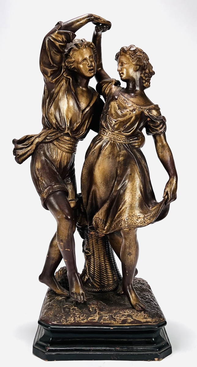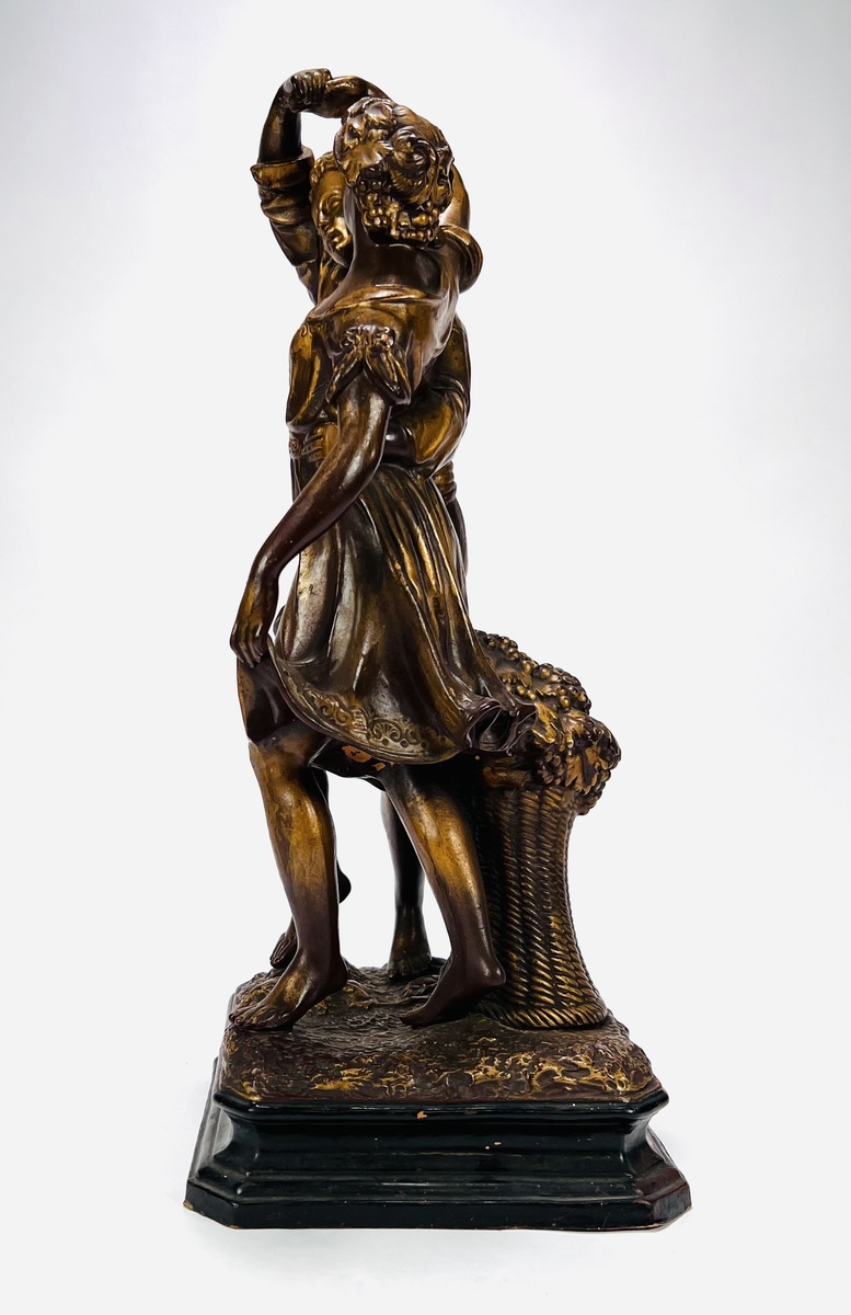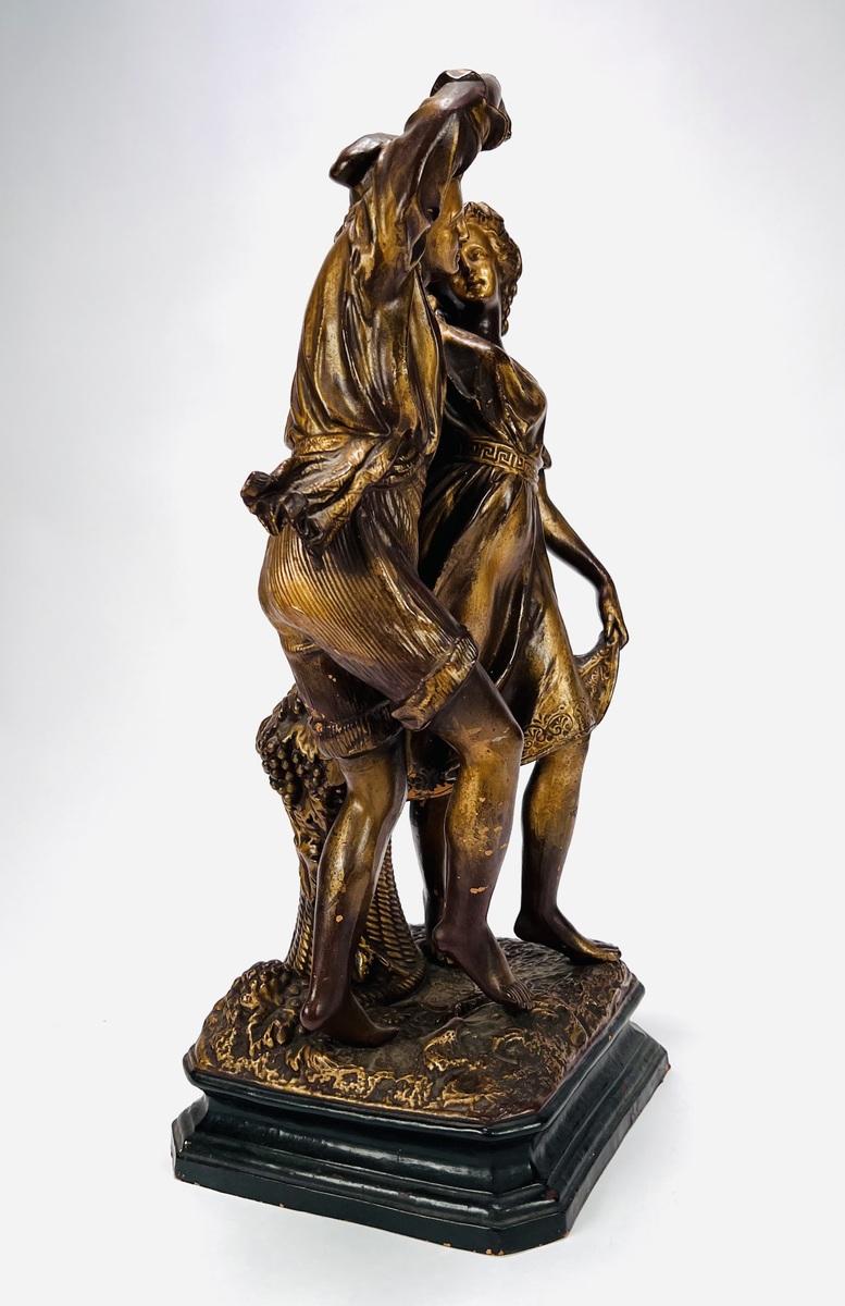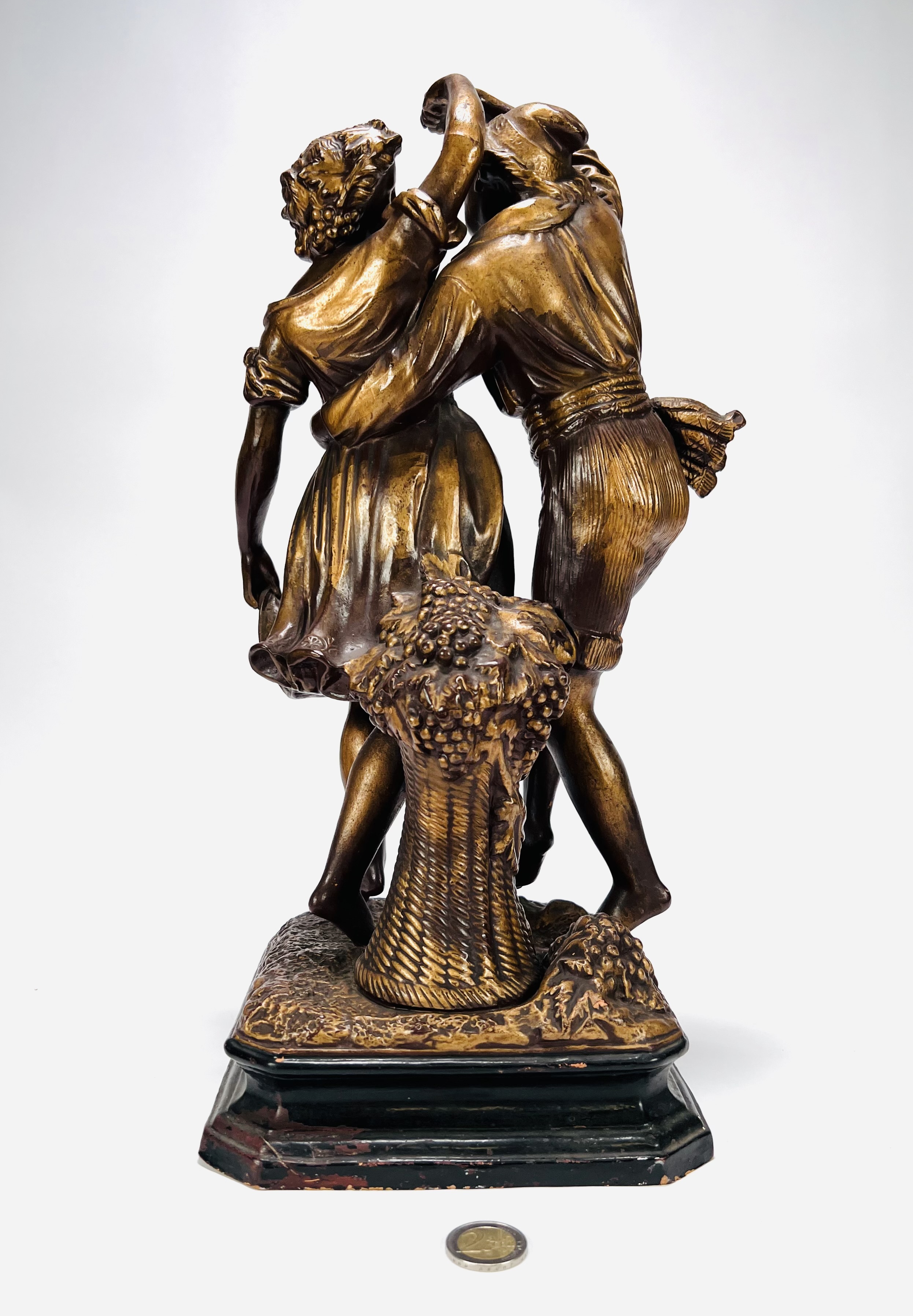 Terracotta bruin-goudkleurig gepatineerd beeld van een dansend koppel in de stijl van Bruchon en Moreau. Frankrijk, omstreeks 1900. |