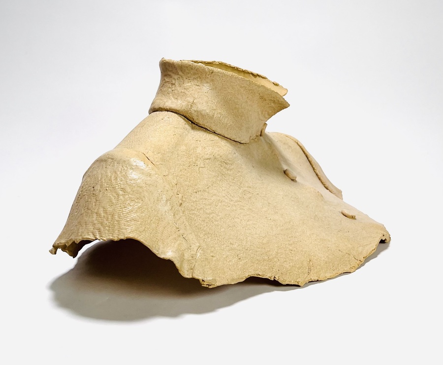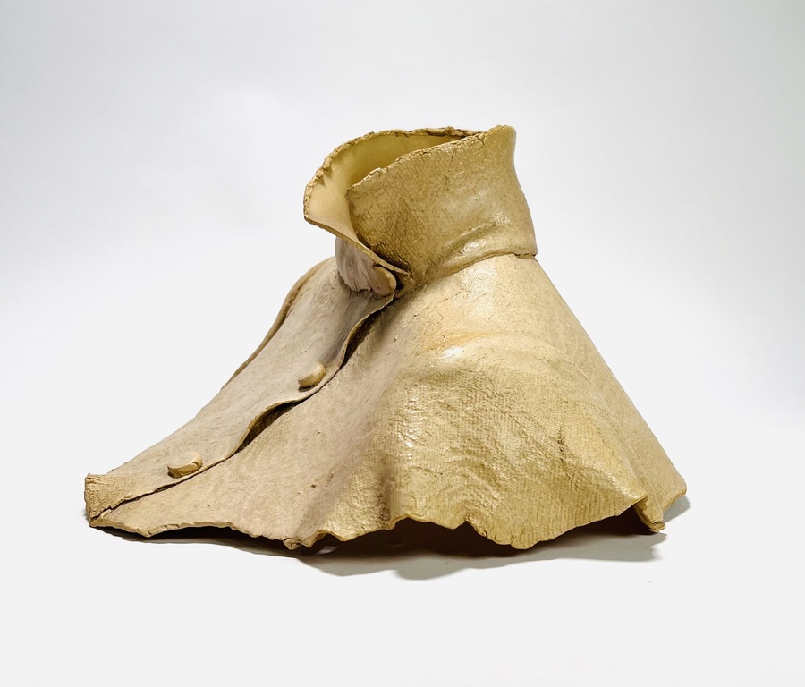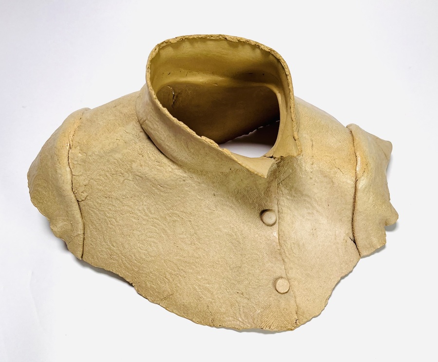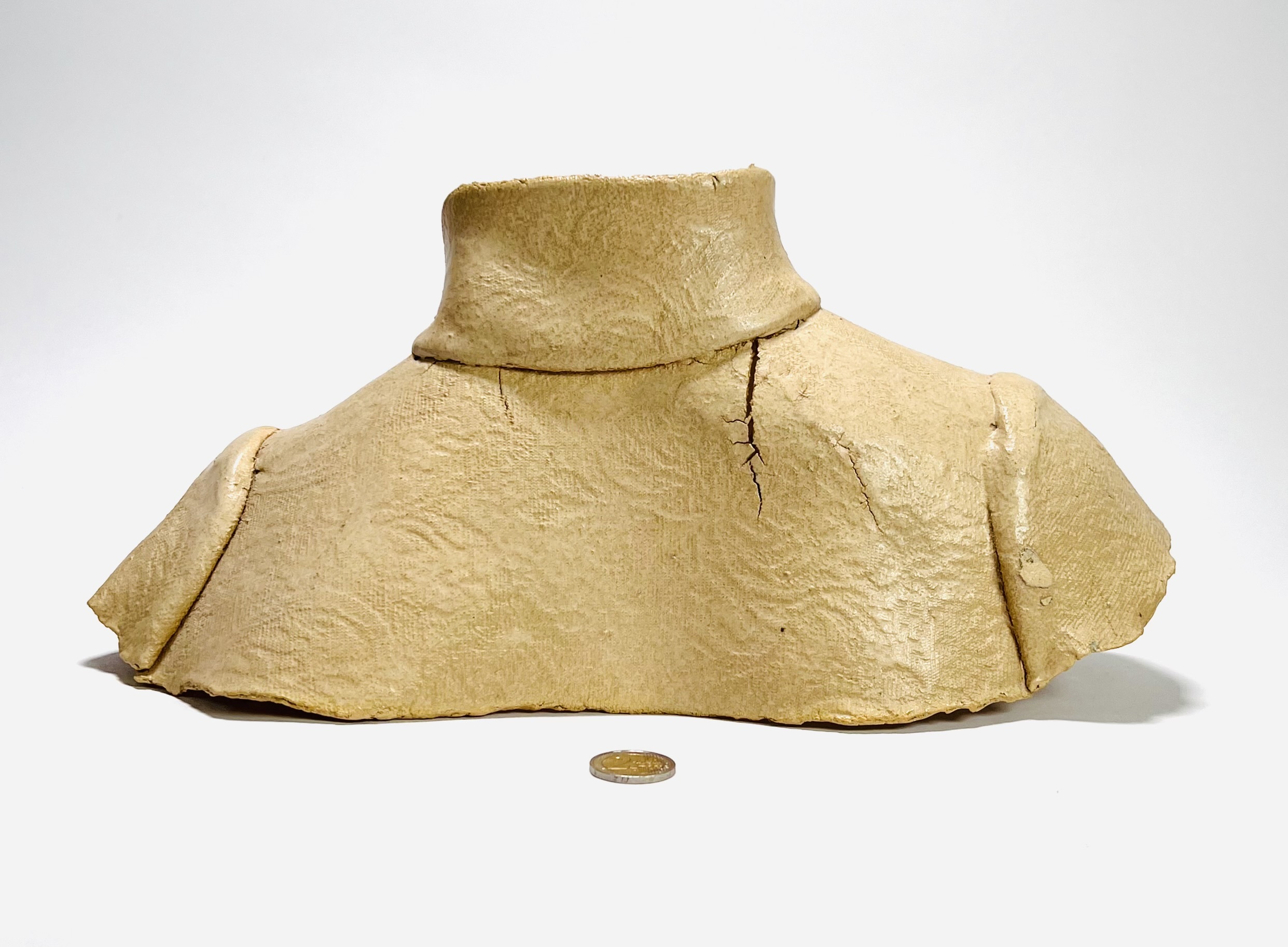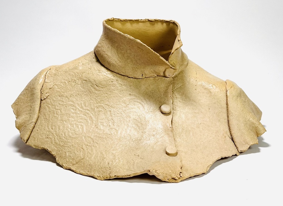 Keramieken crèmekleurig beeld van klassiek dameskledingstuk met opstaande kraag. Anoniem, vierde kwart 20e eeuw. |