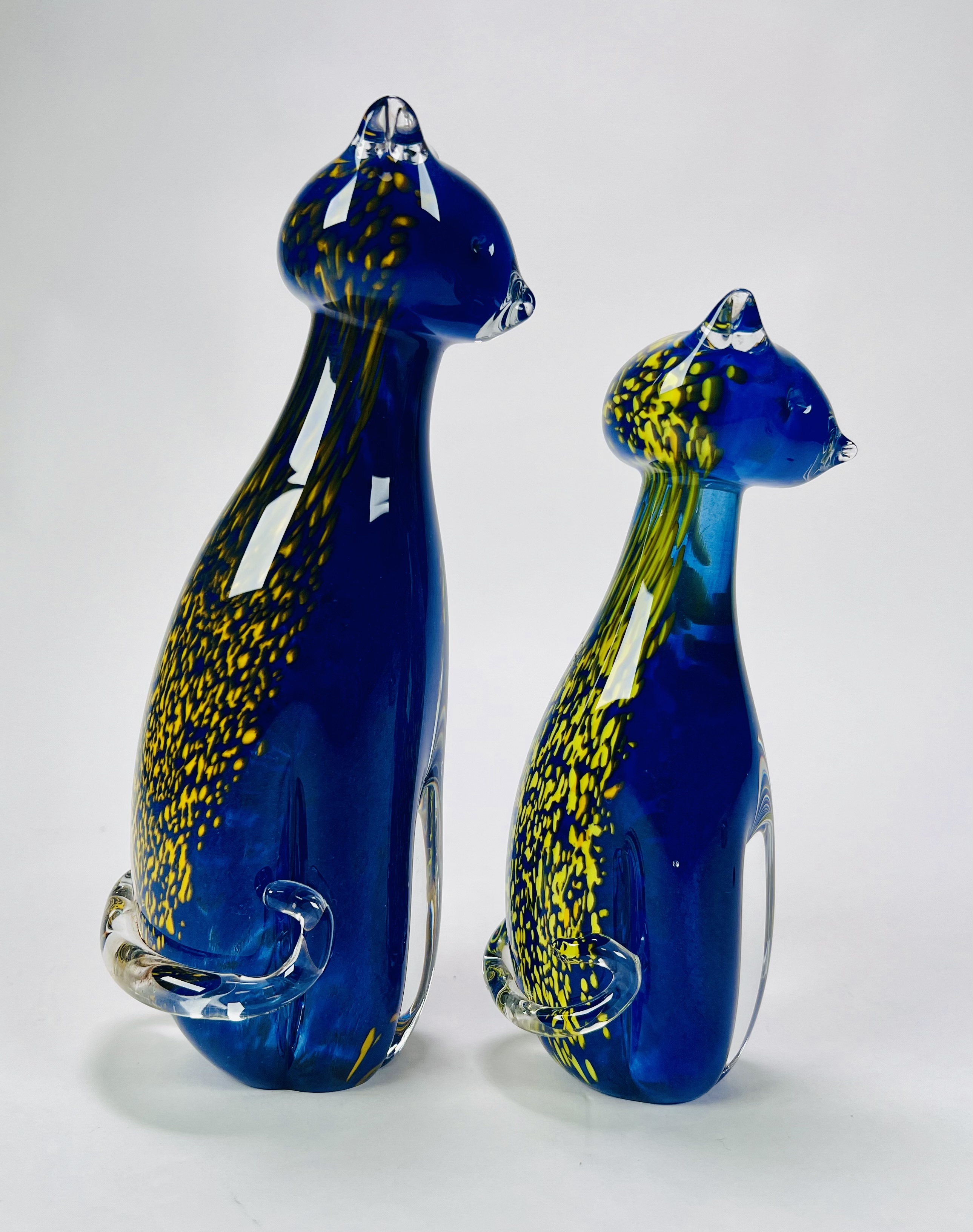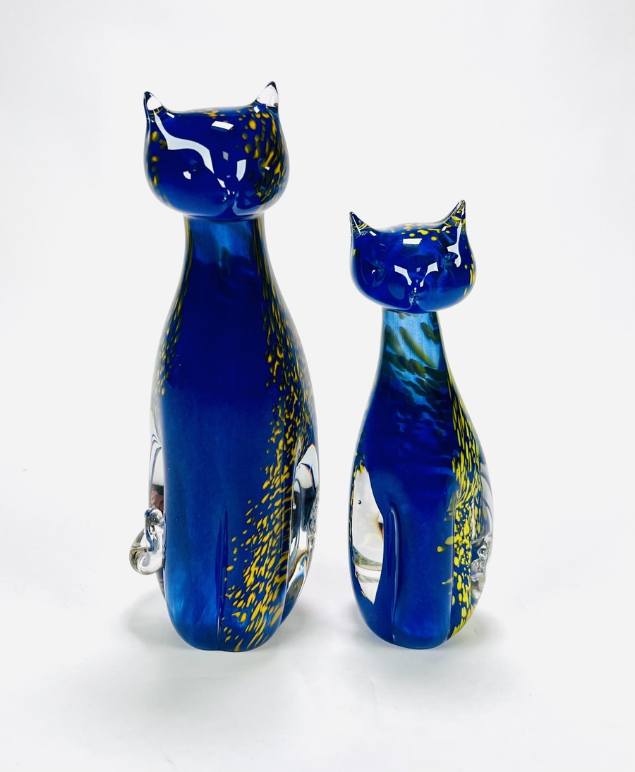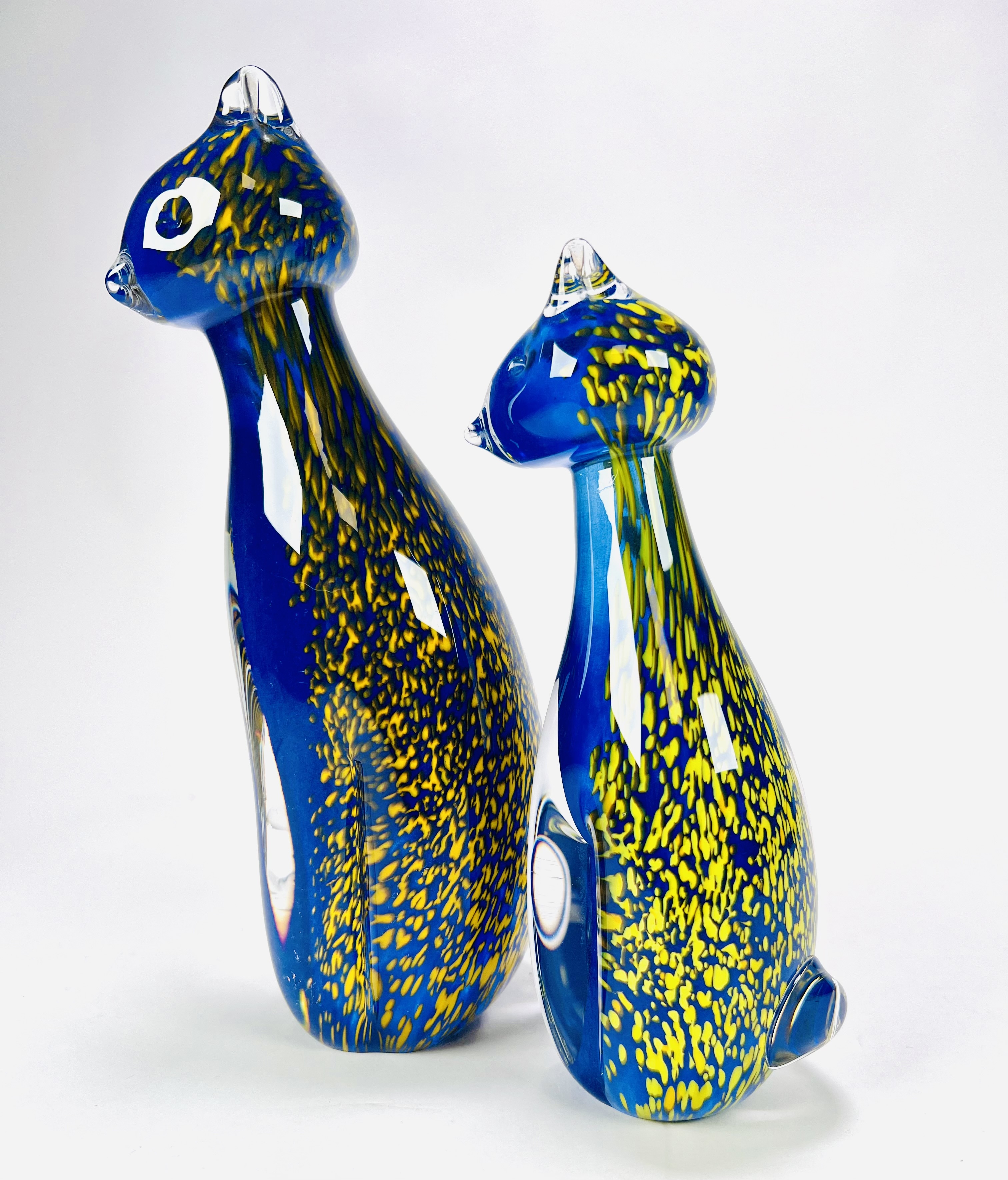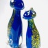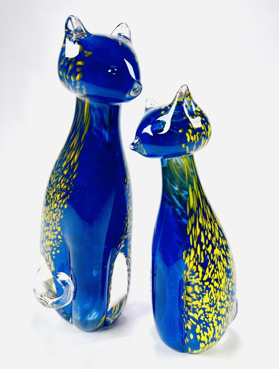 Twee kristallen katten in blauw-geel gespikkelde kleurslag door glasblazerij Pfeiffer. Musselkanaal, vierde kwart 20e eeuw. |