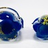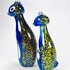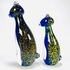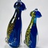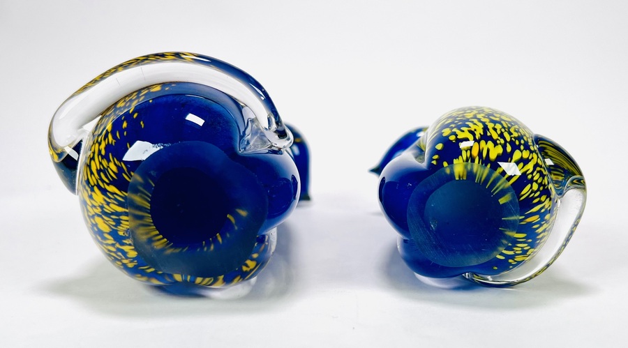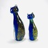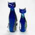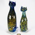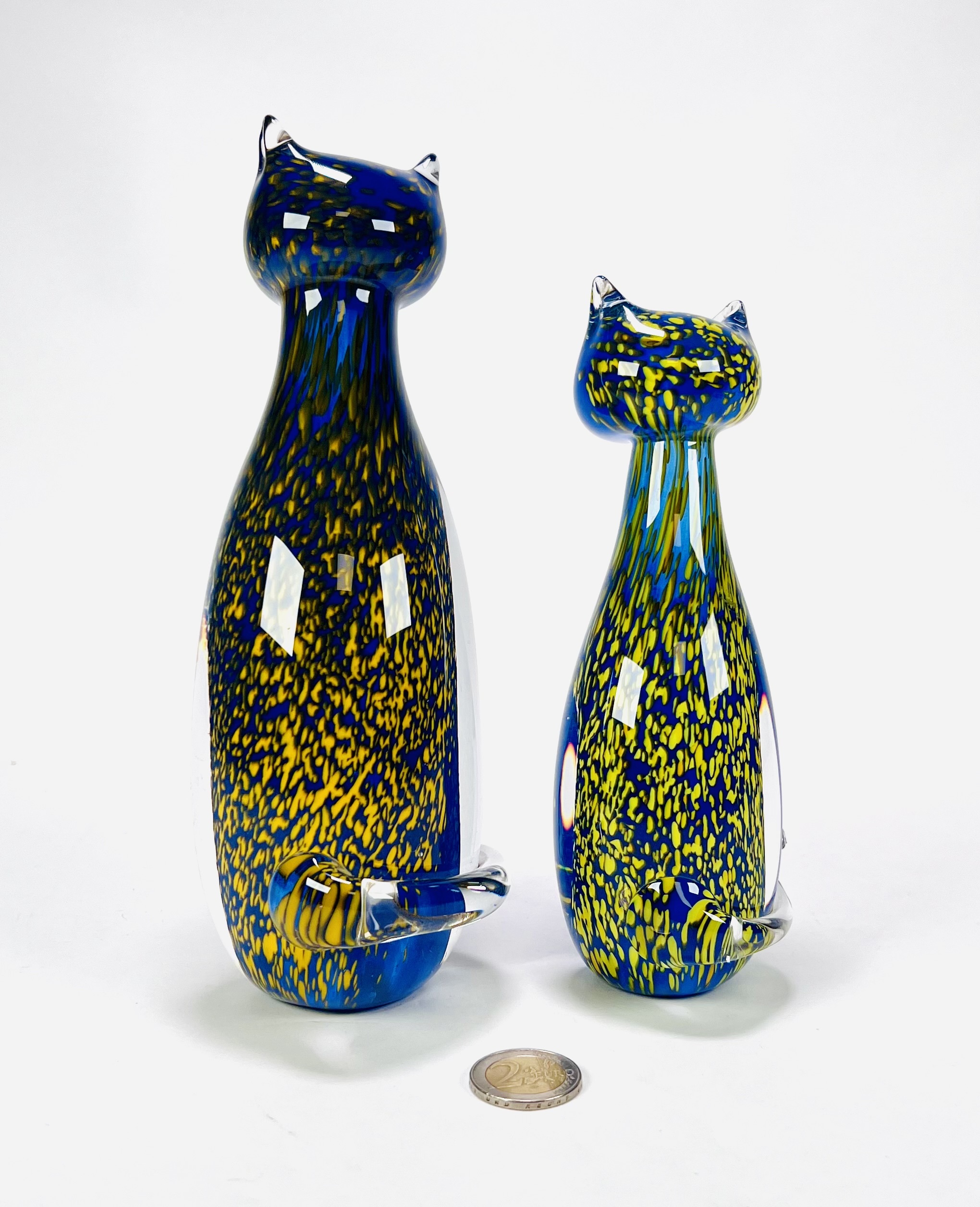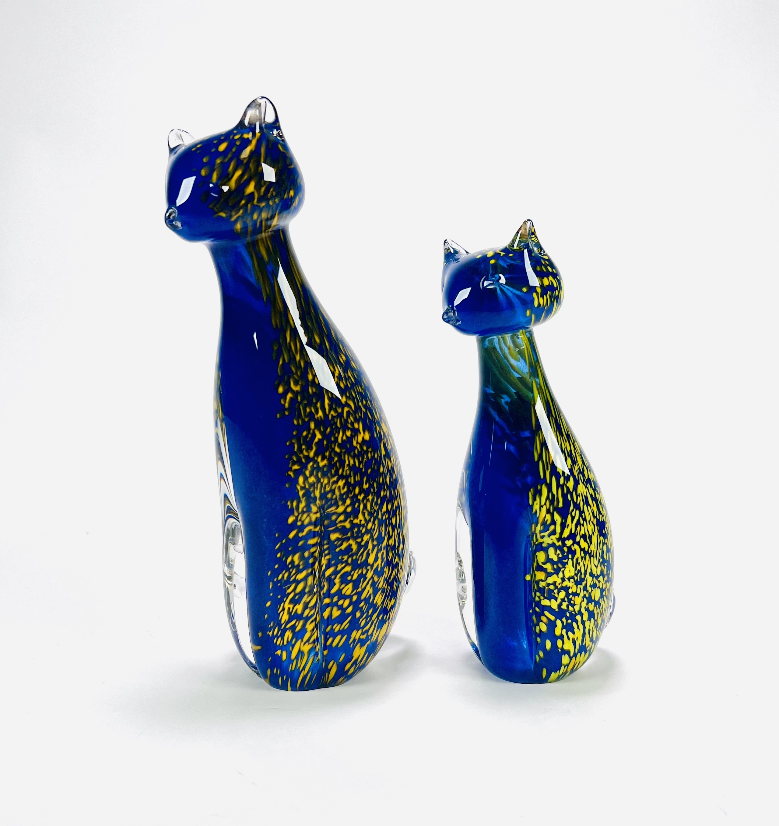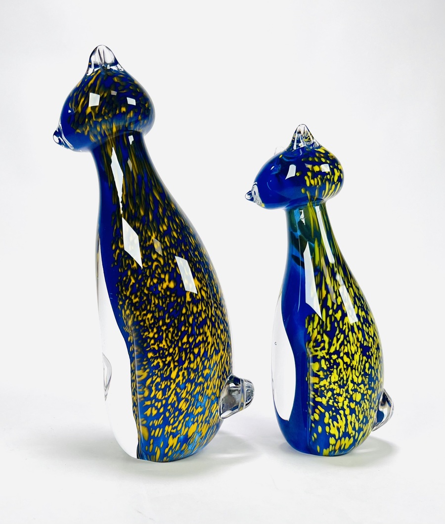 Twee kristallen katten in blauw-geel gespikkelde kleurslag door glasblazerij Pfeiffer. Musselkanaal, vierde kwart 20e eeuw. |