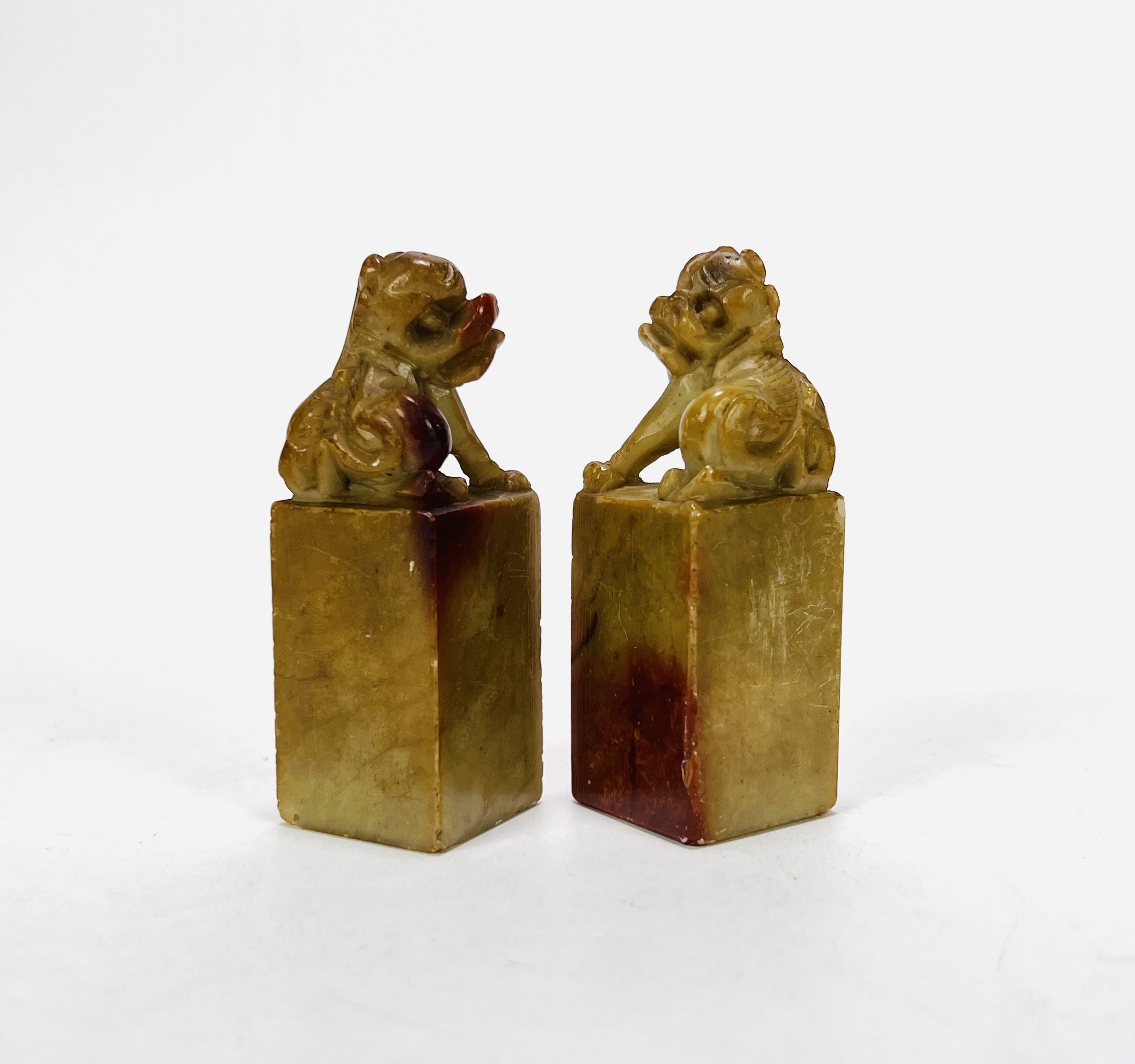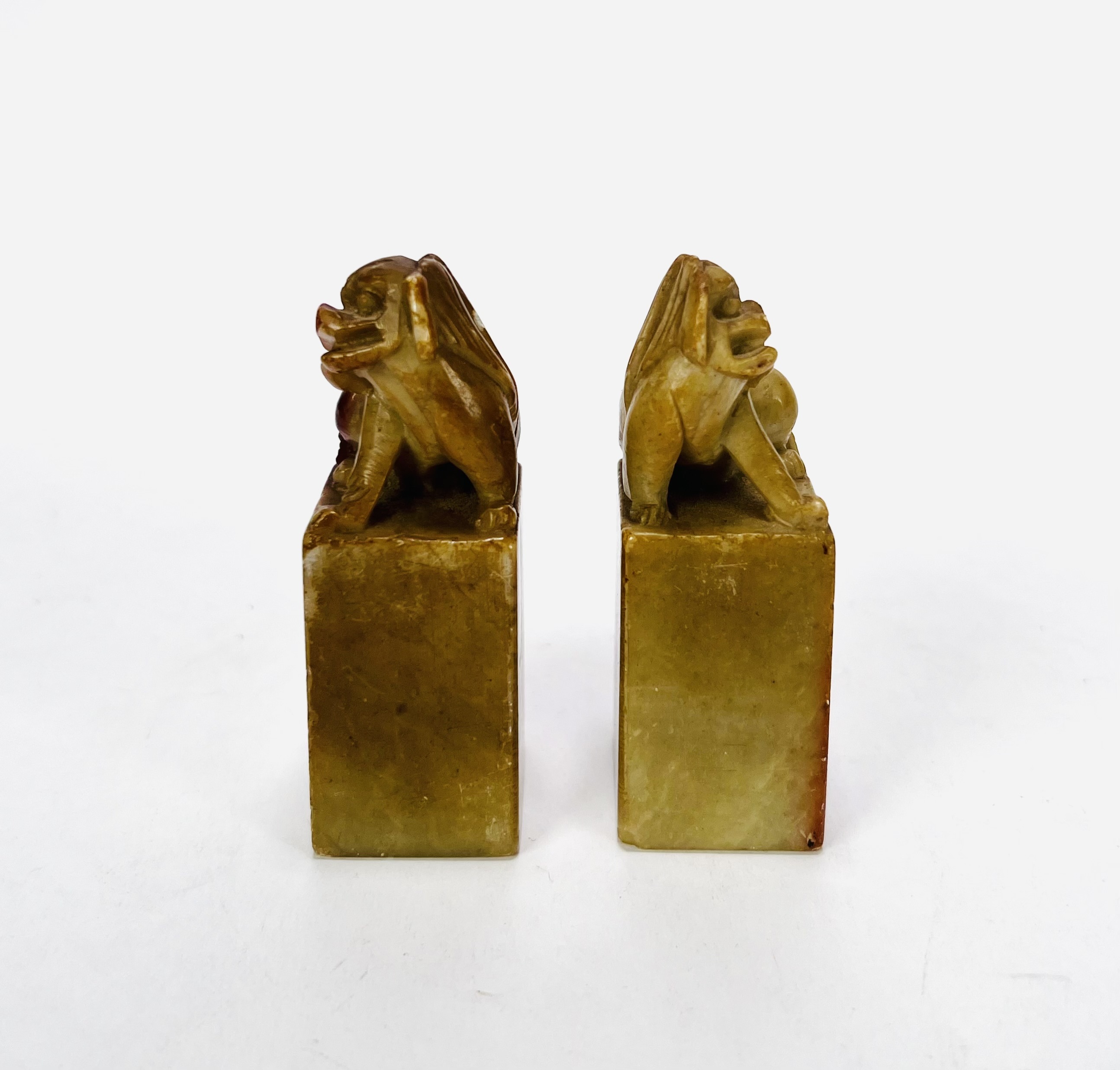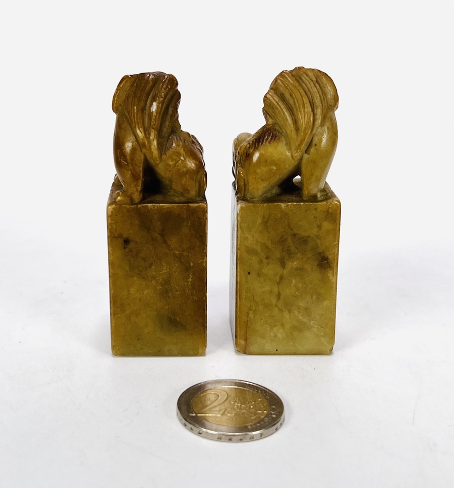 Twee marmeren Foo Dog beeldjes op rechthoekig basement, 20e eeuw. |