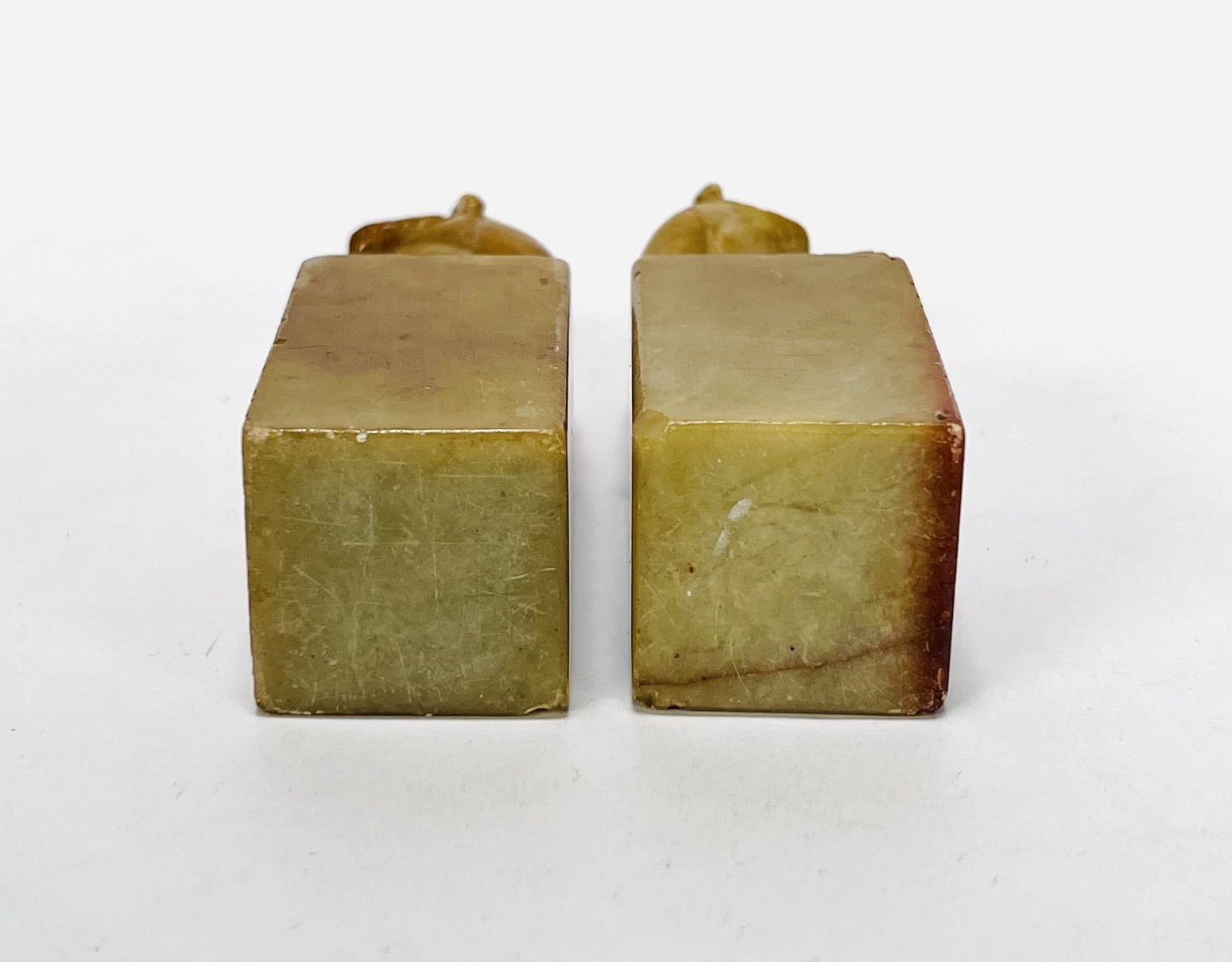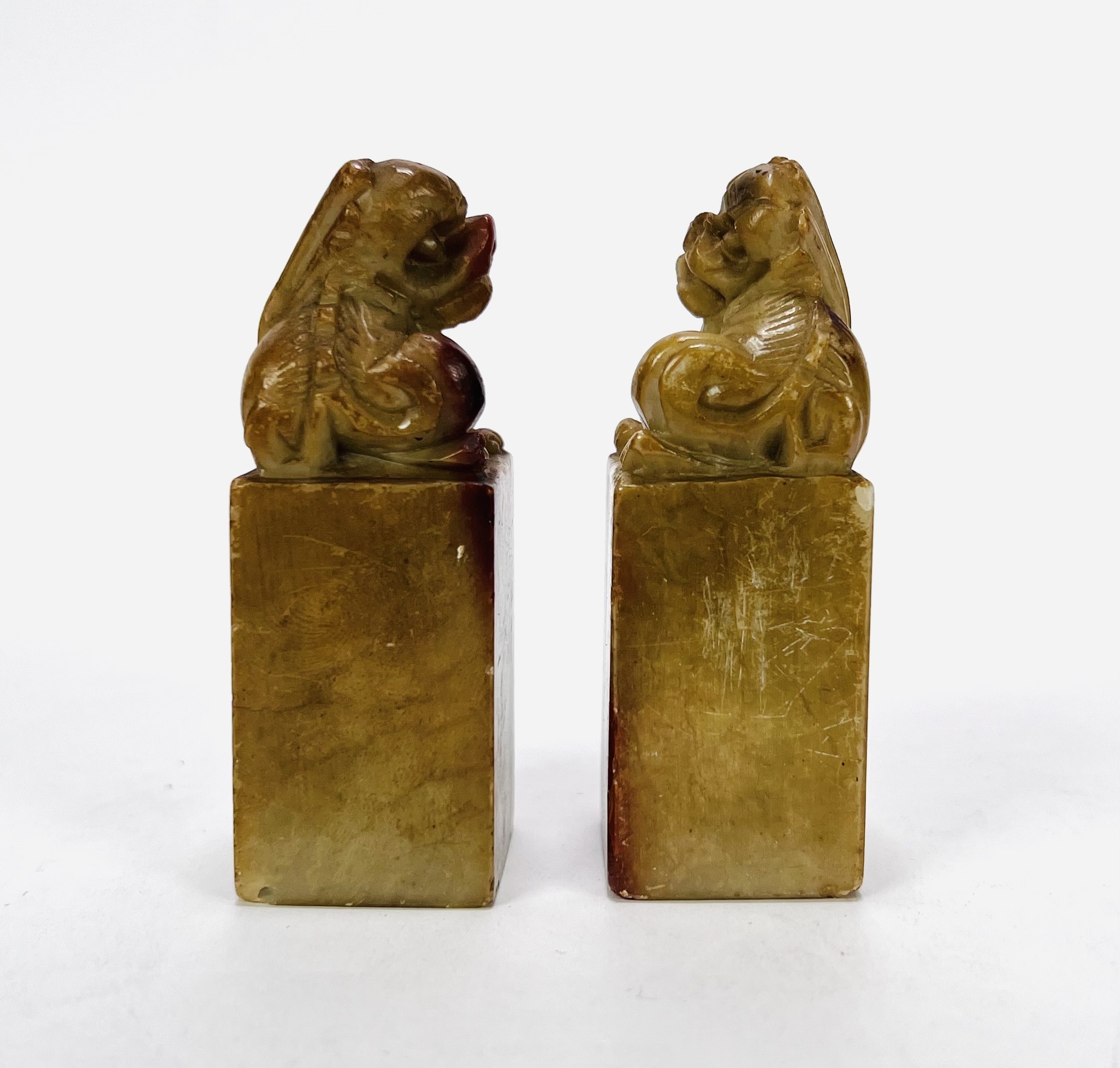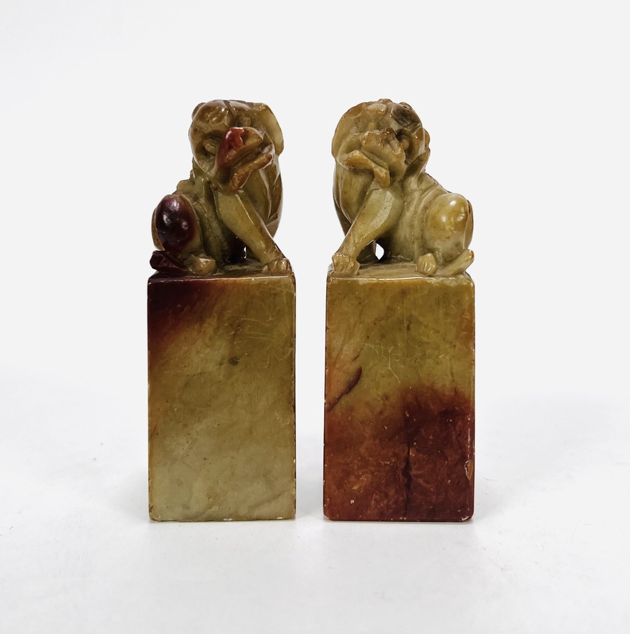 Twee marmeren Foo Dog beeldjes op rechthoekig basement, 20e eeuw. |