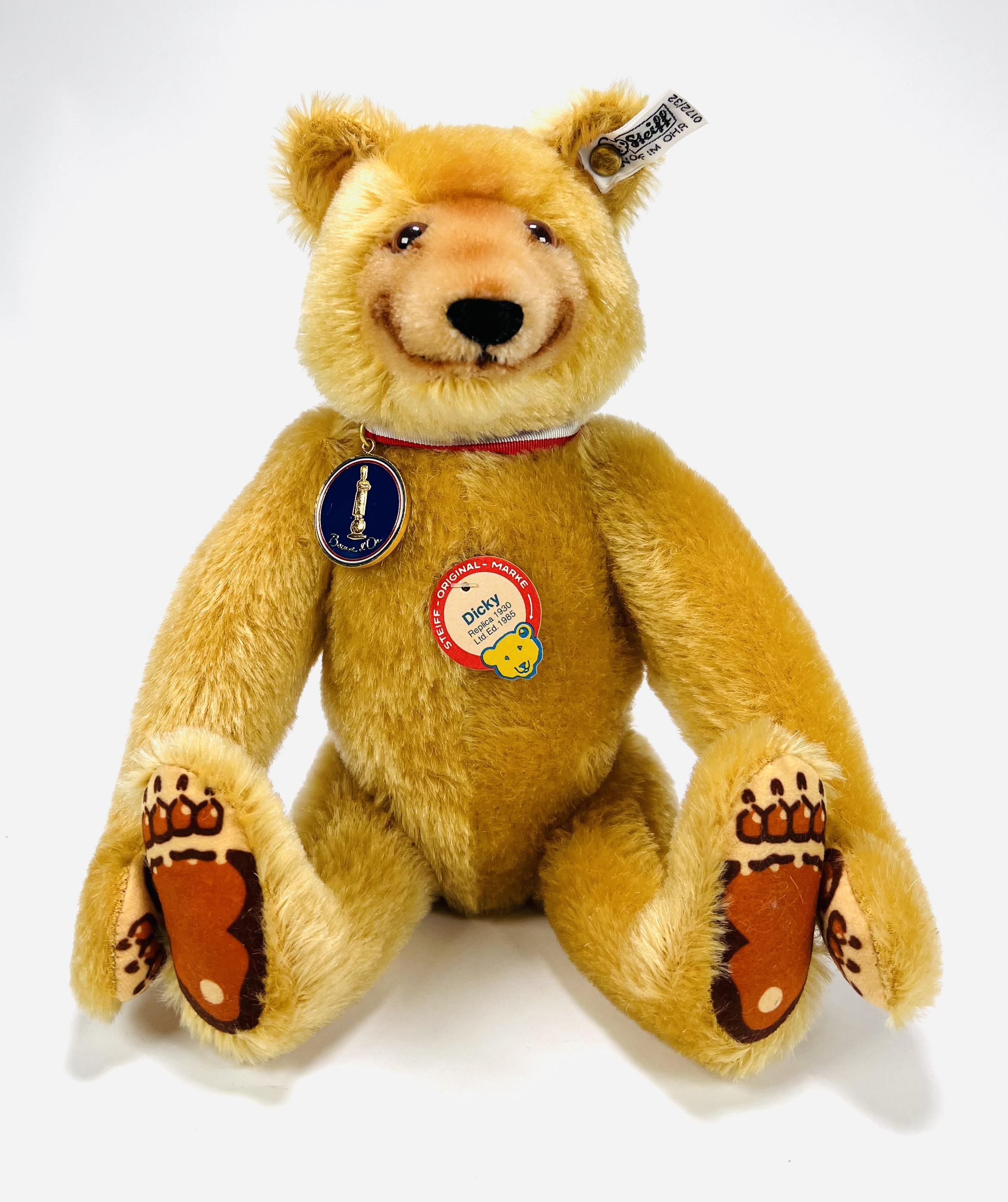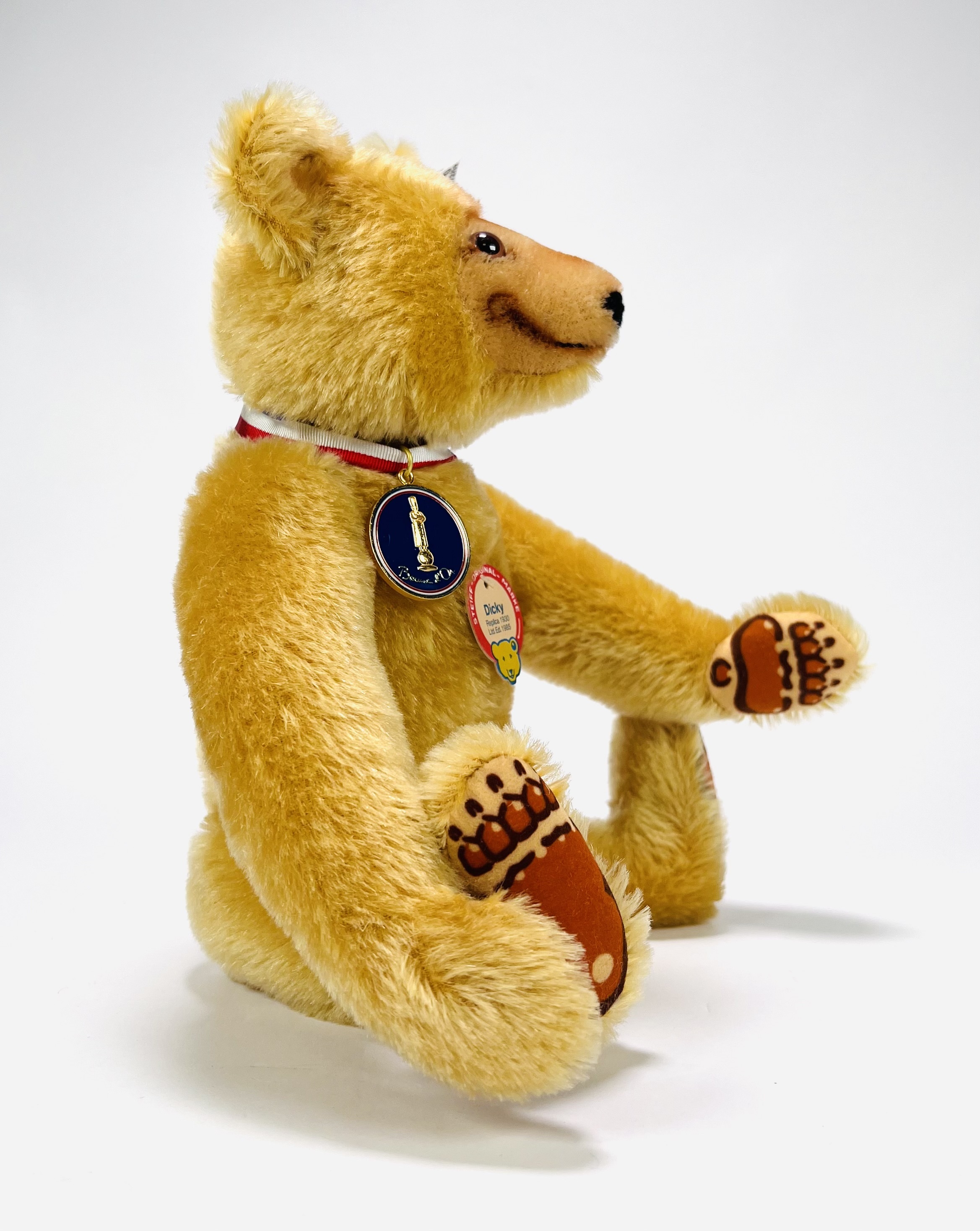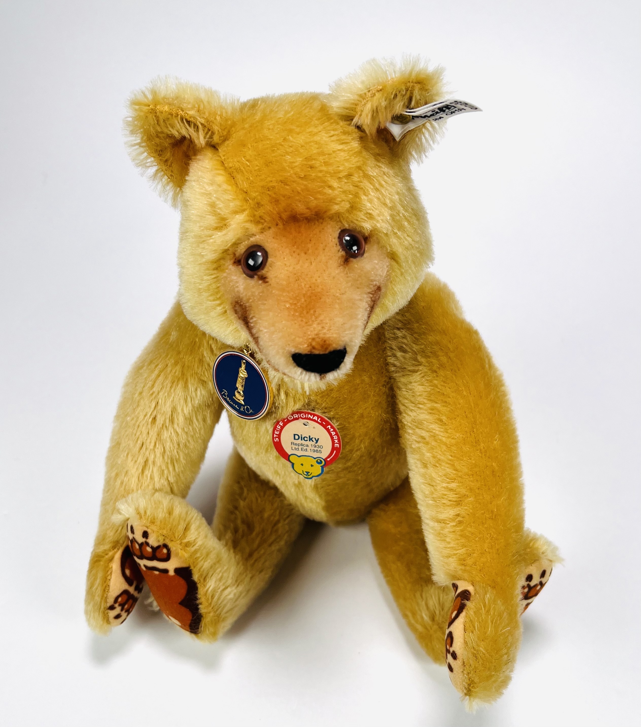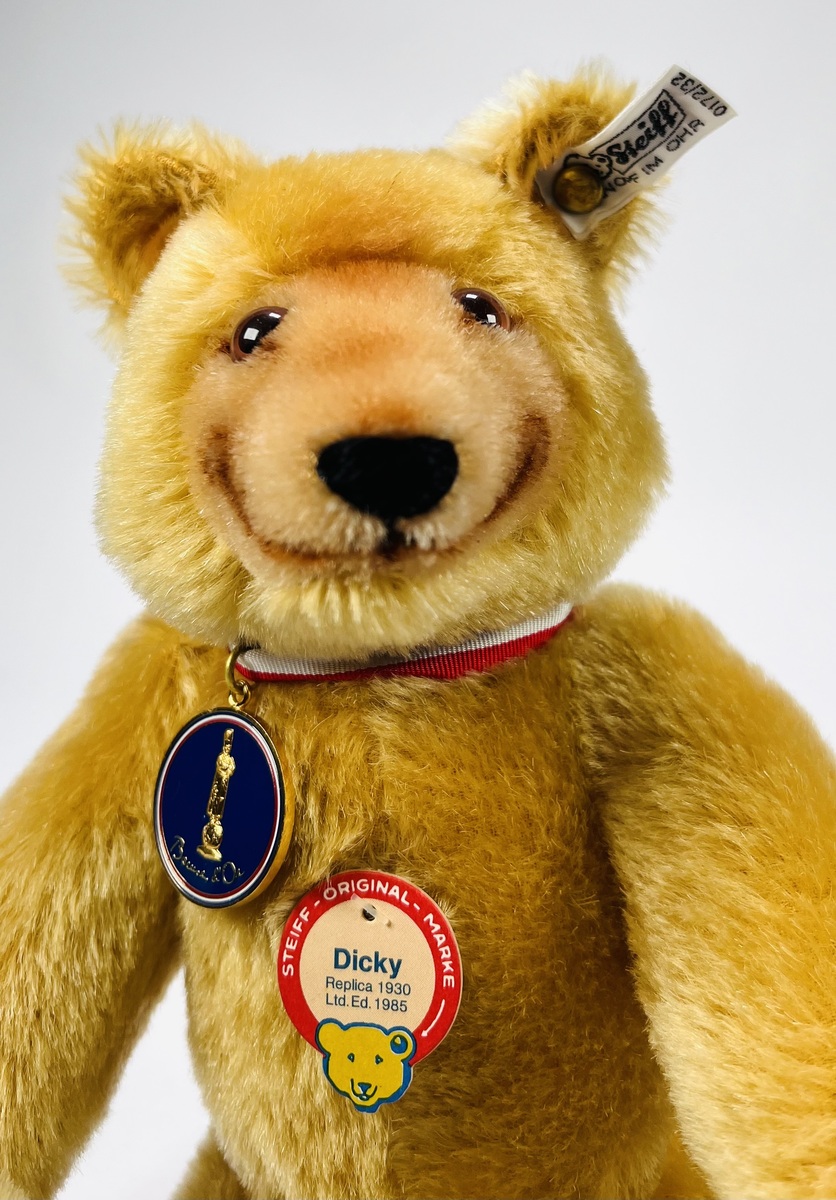 Teddybeer van Steiff met modelnaam Dicky, een replica teddybeer van 1930. Teddybeer met Knopf in het oor en originele label. Made in Germany, 1985. |