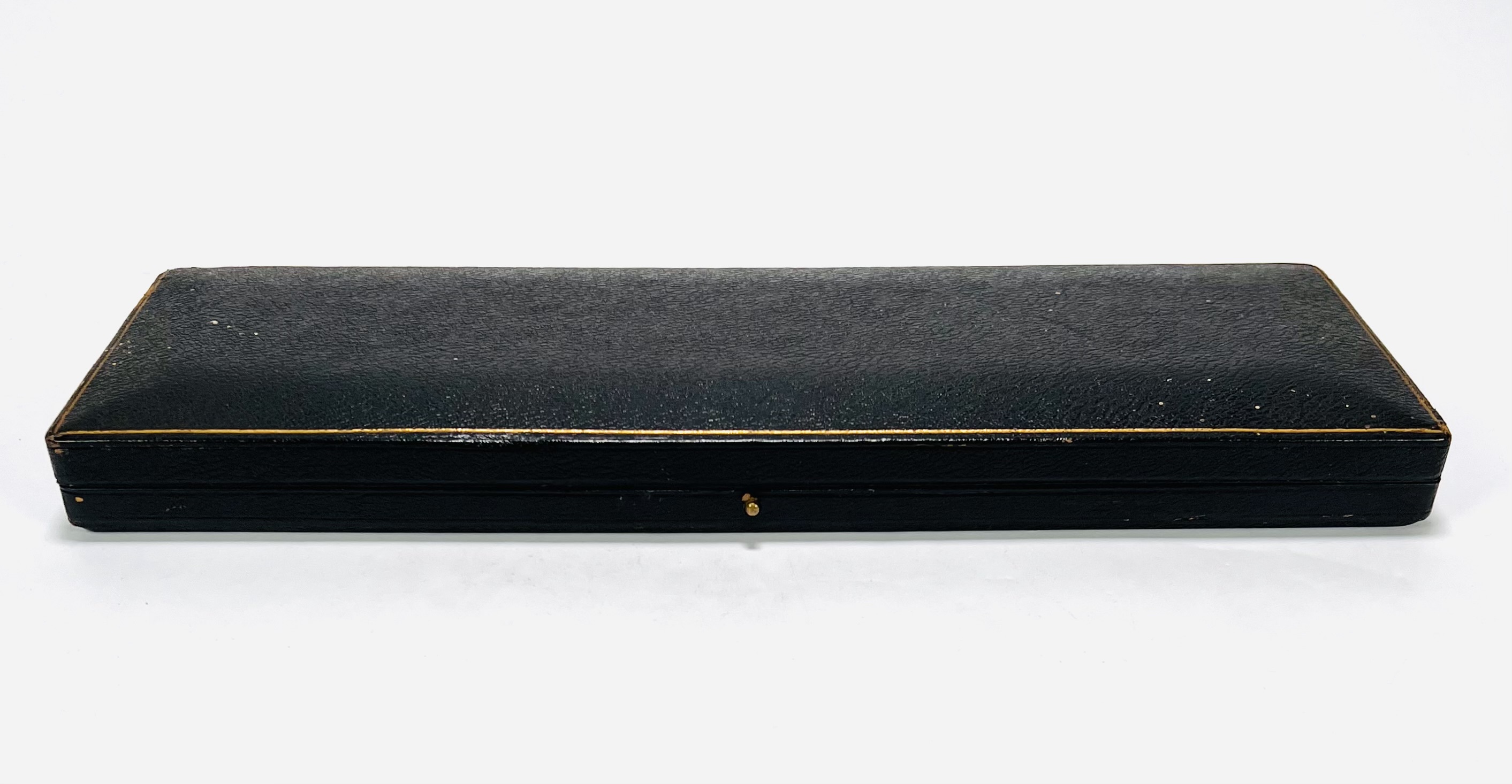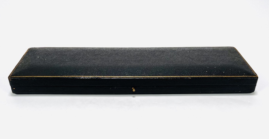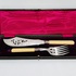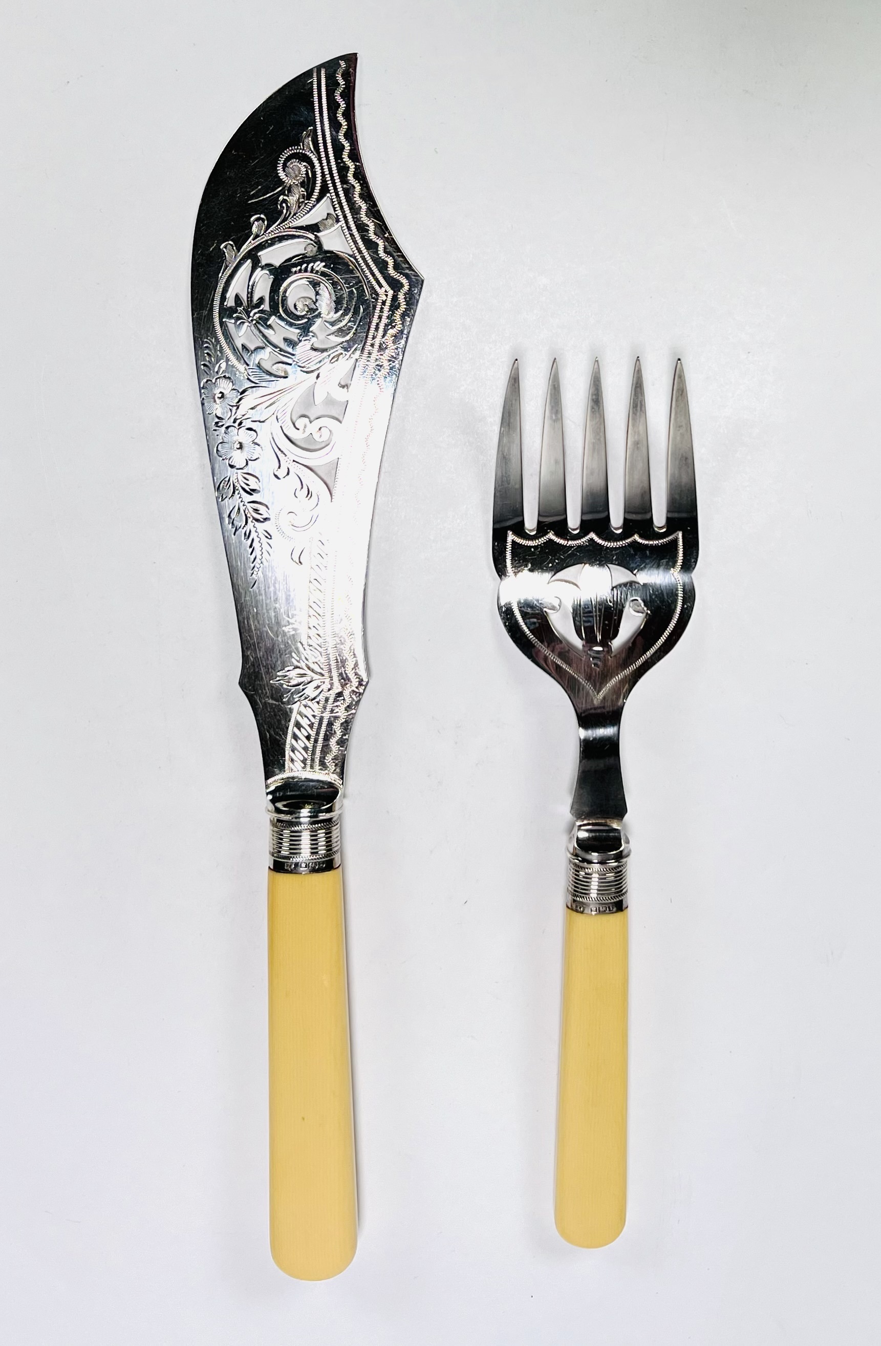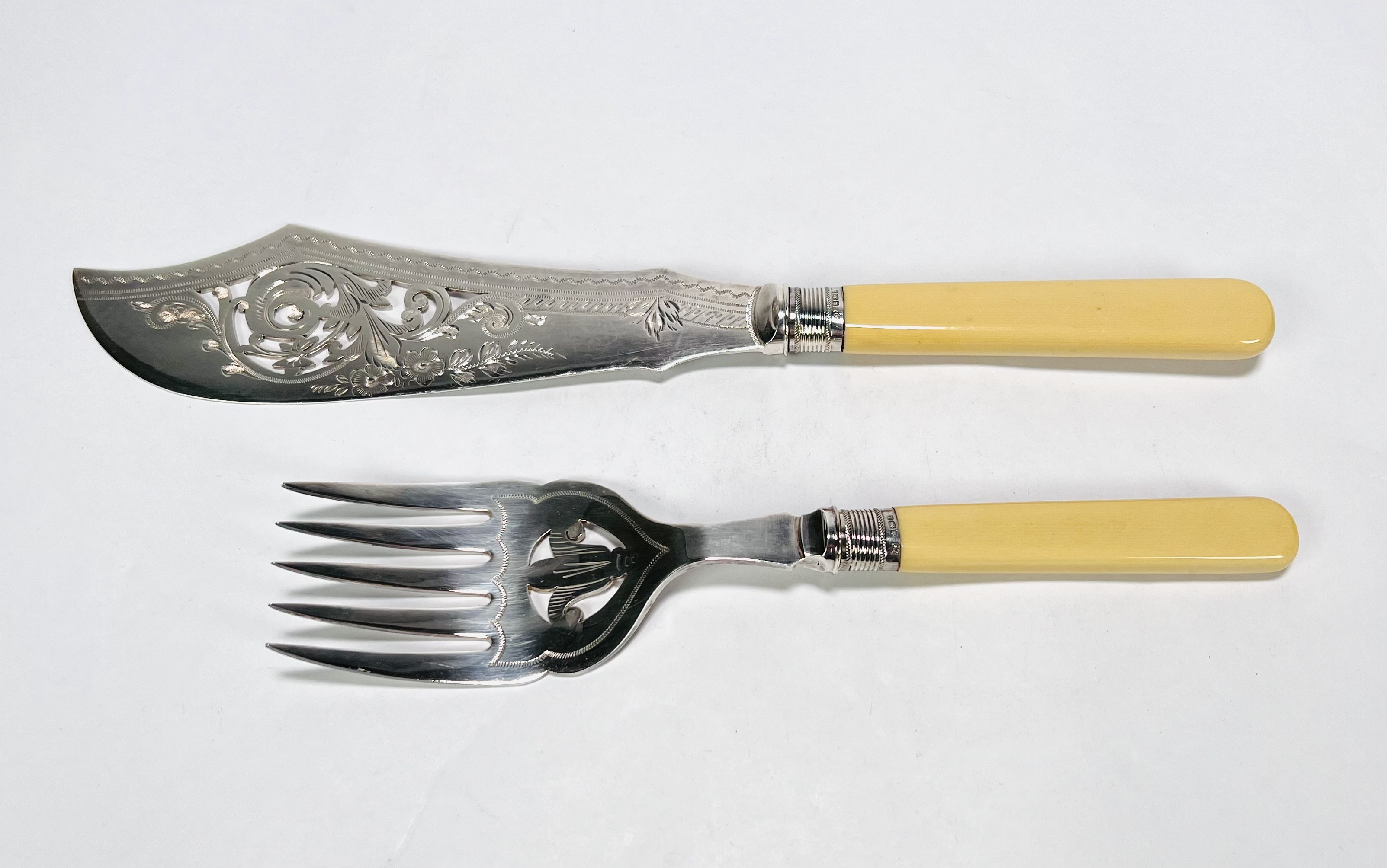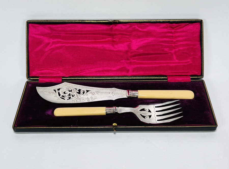 Zilver floraal gedecoreerd visbestek met origineel etui. Zilveren gemerkt meesterteken JS, Kroon (Sheffield), Lopende Leeuw en jaarletter t (1911). |