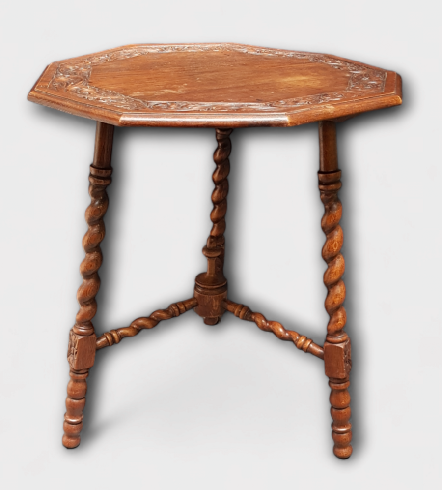 Eikenhouten bijzettafel met krullend houtsnijwerk in het tafelblad en getordeerde tafelpoten. Begin 20e eeuw. |