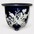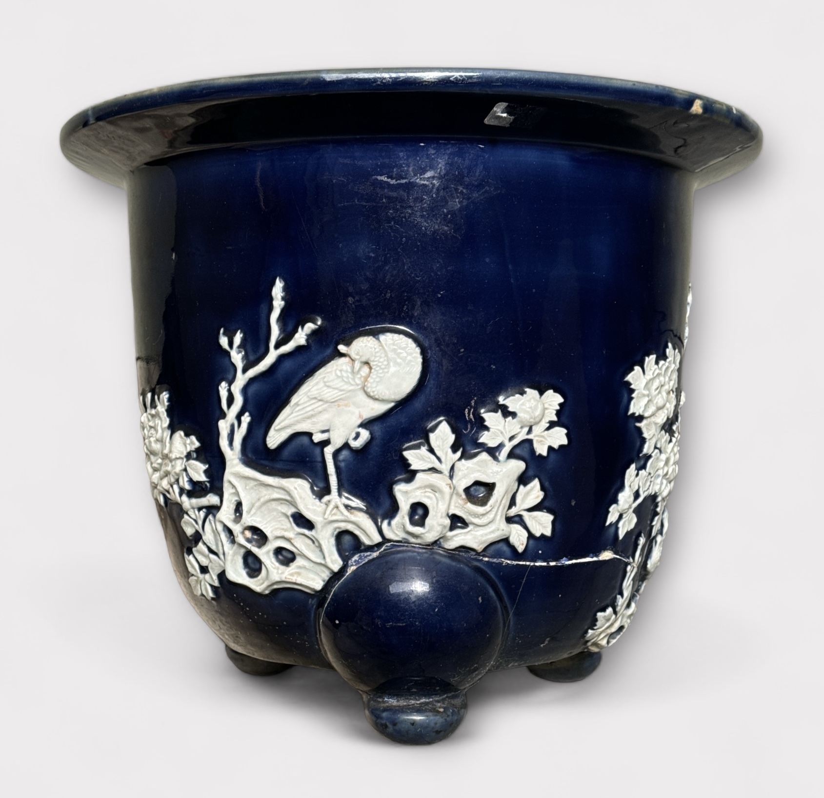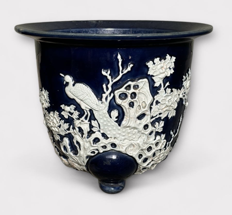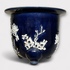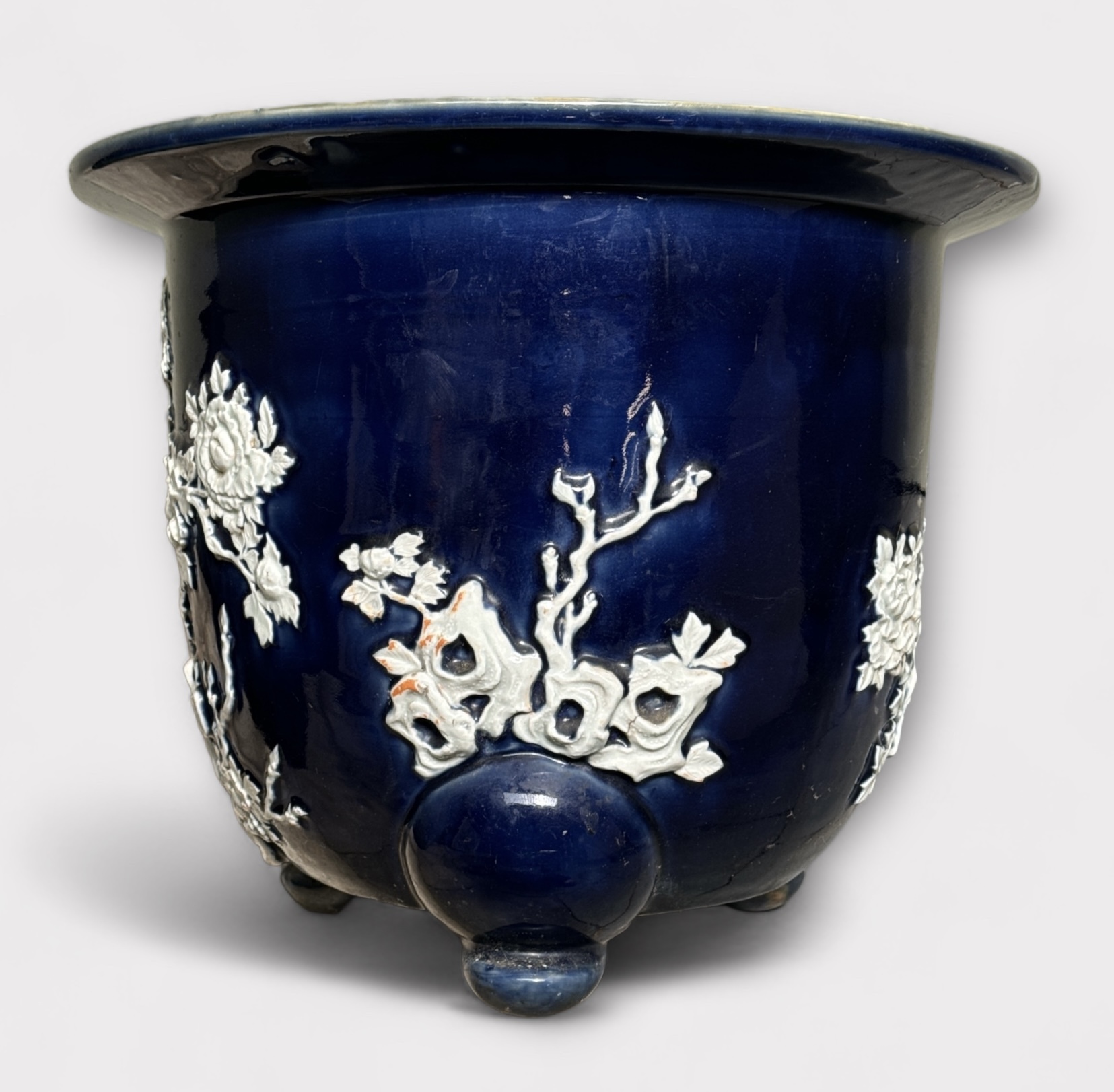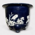 Donkerblauwe aardewerken bloempot met opgelegd wit geglazuurd decor met vogels en botanisch decor. Betreft een pot op groot formaat, 20e eeuw. |