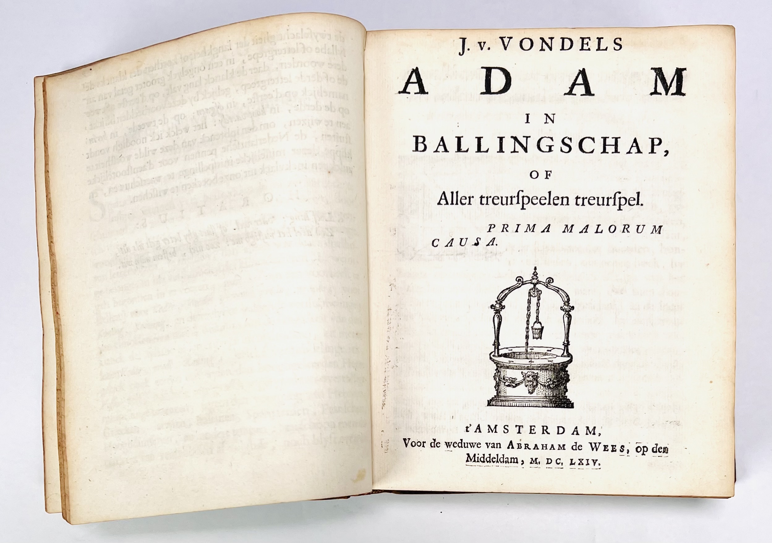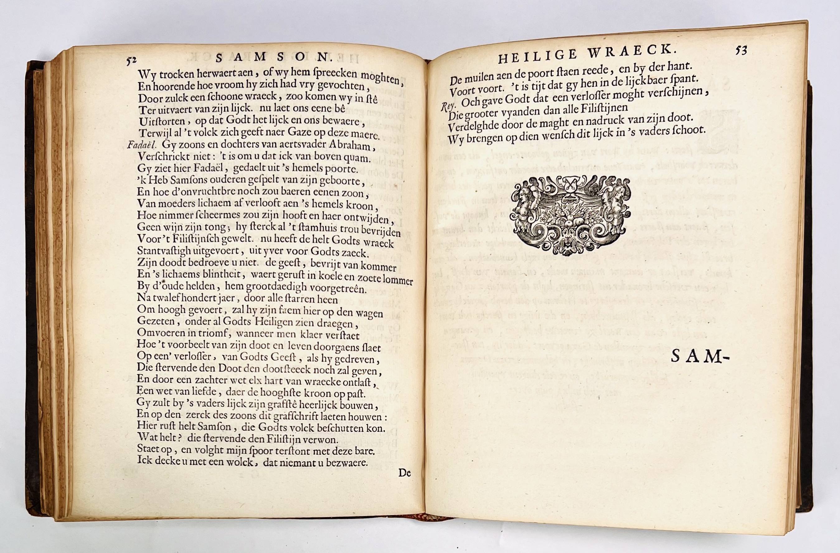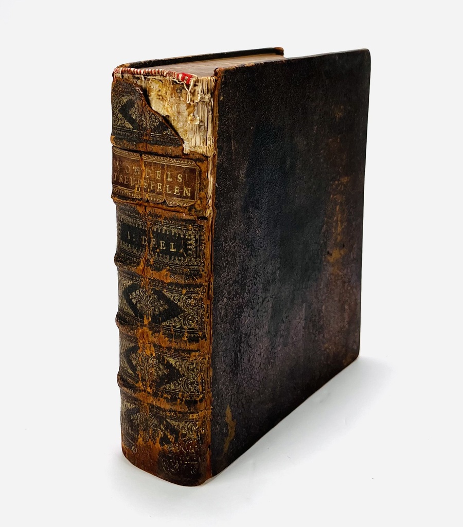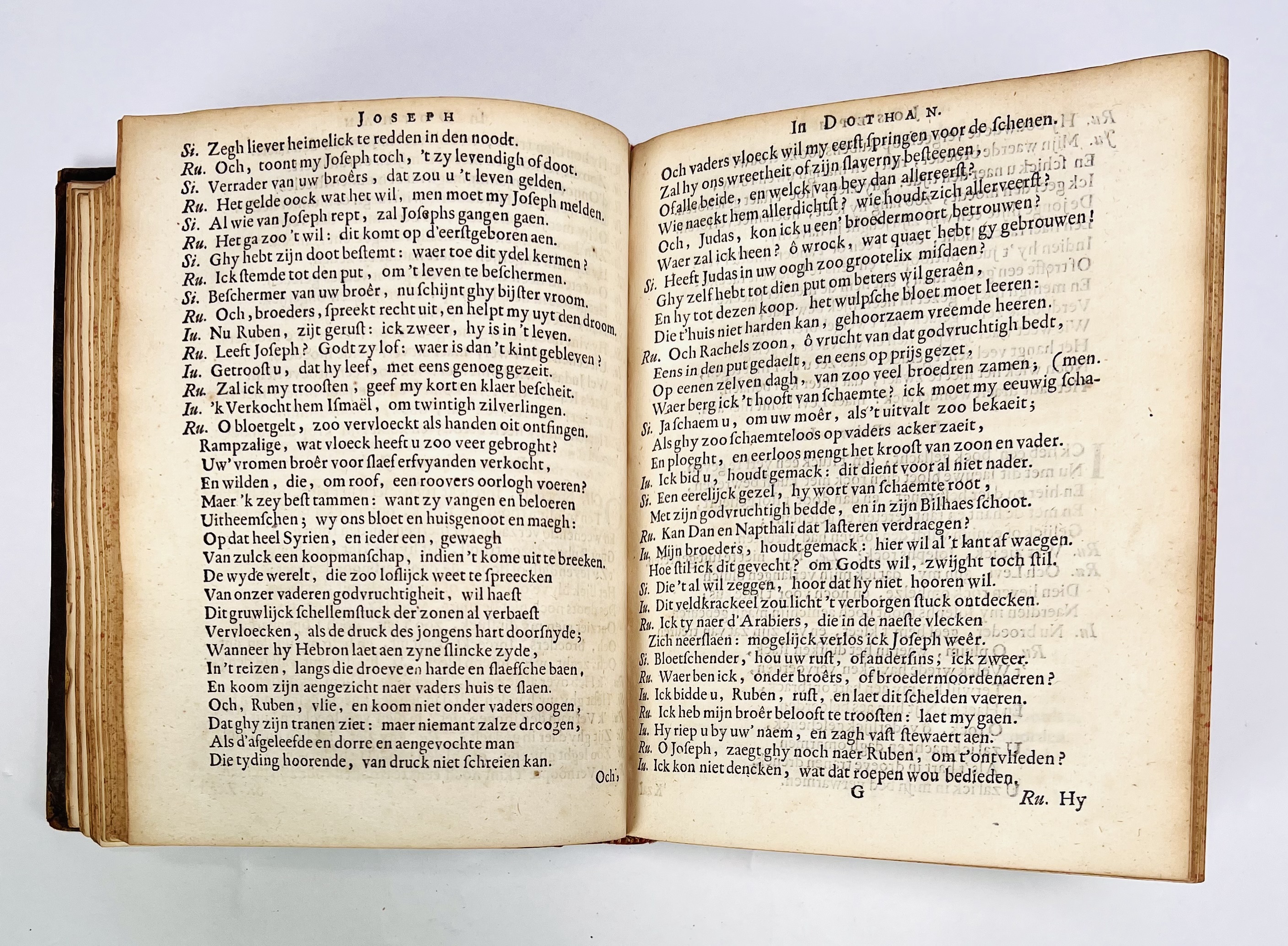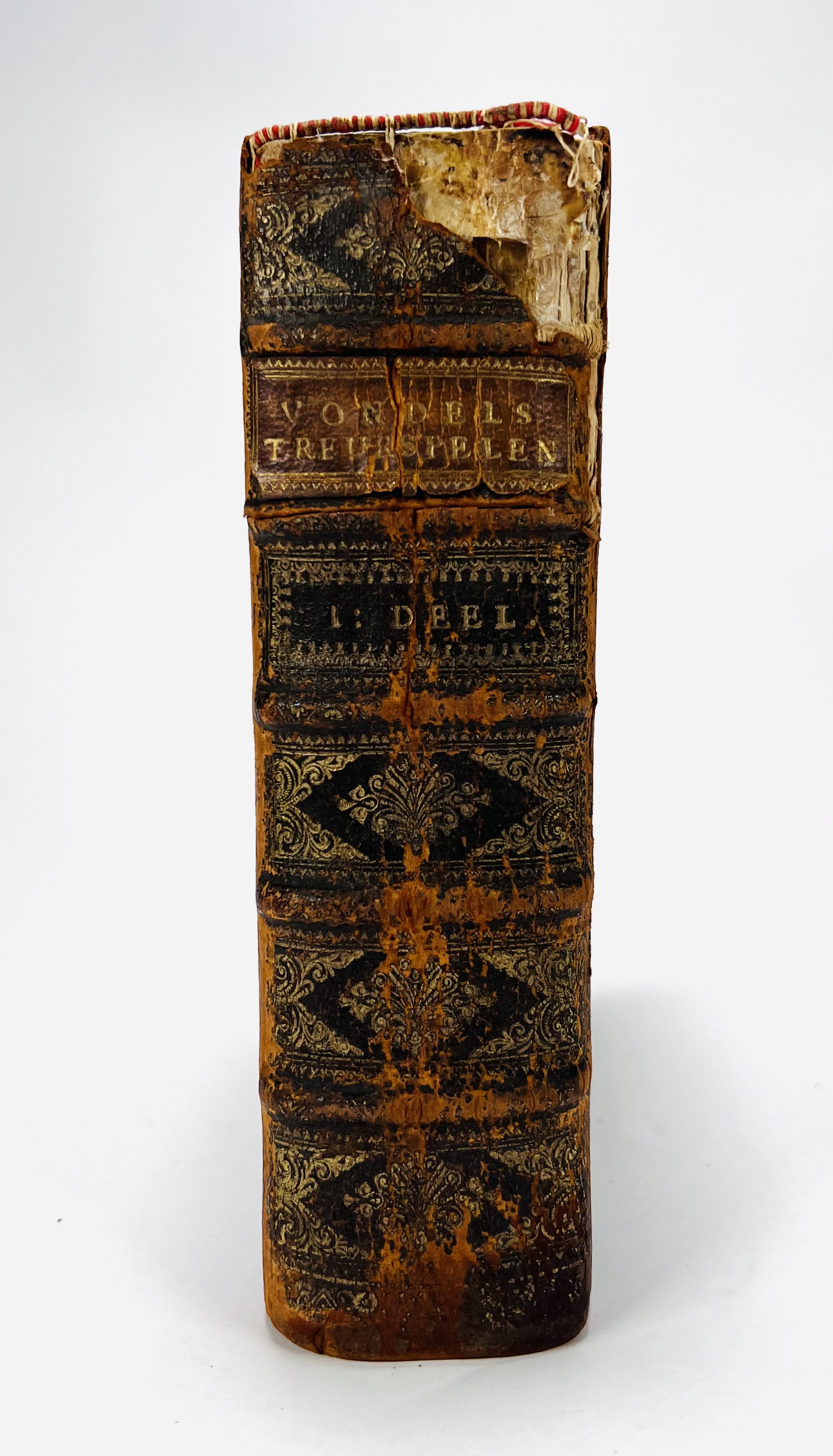 Boek met Vondels Treurspelen in lederen band uit 1654. Convoluut met diverse treurspelen. |