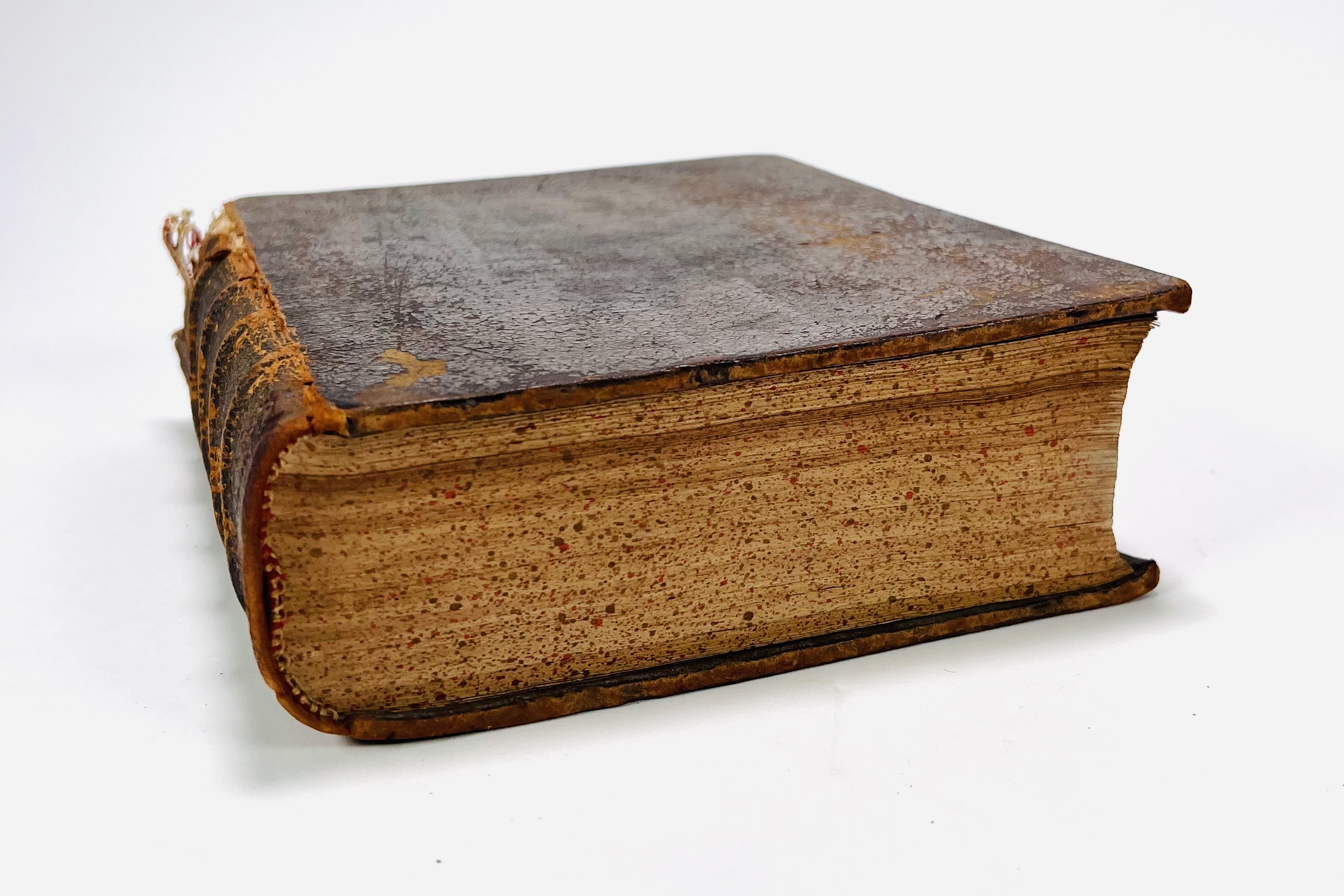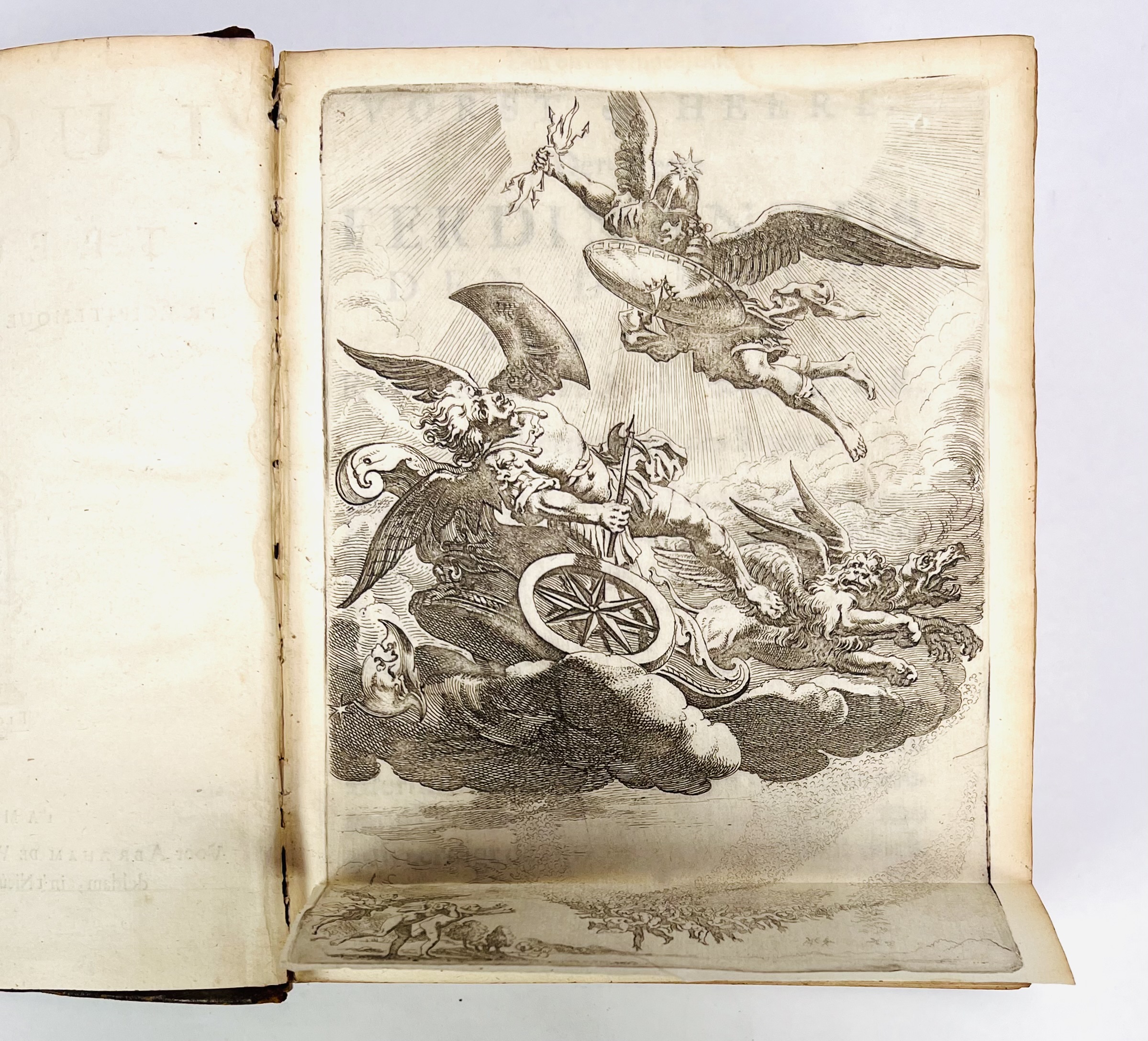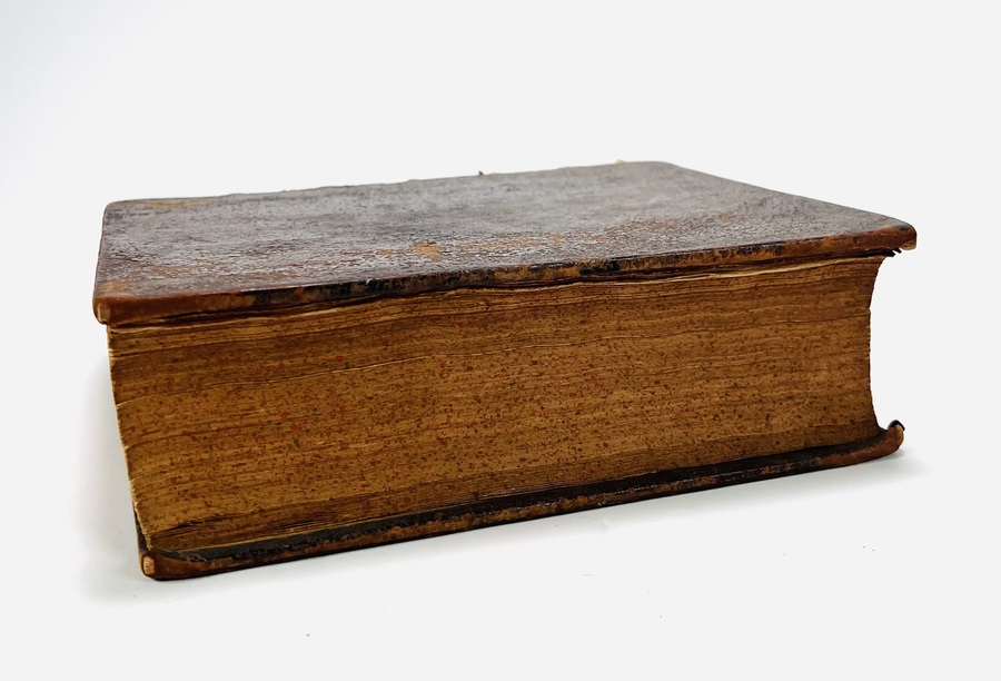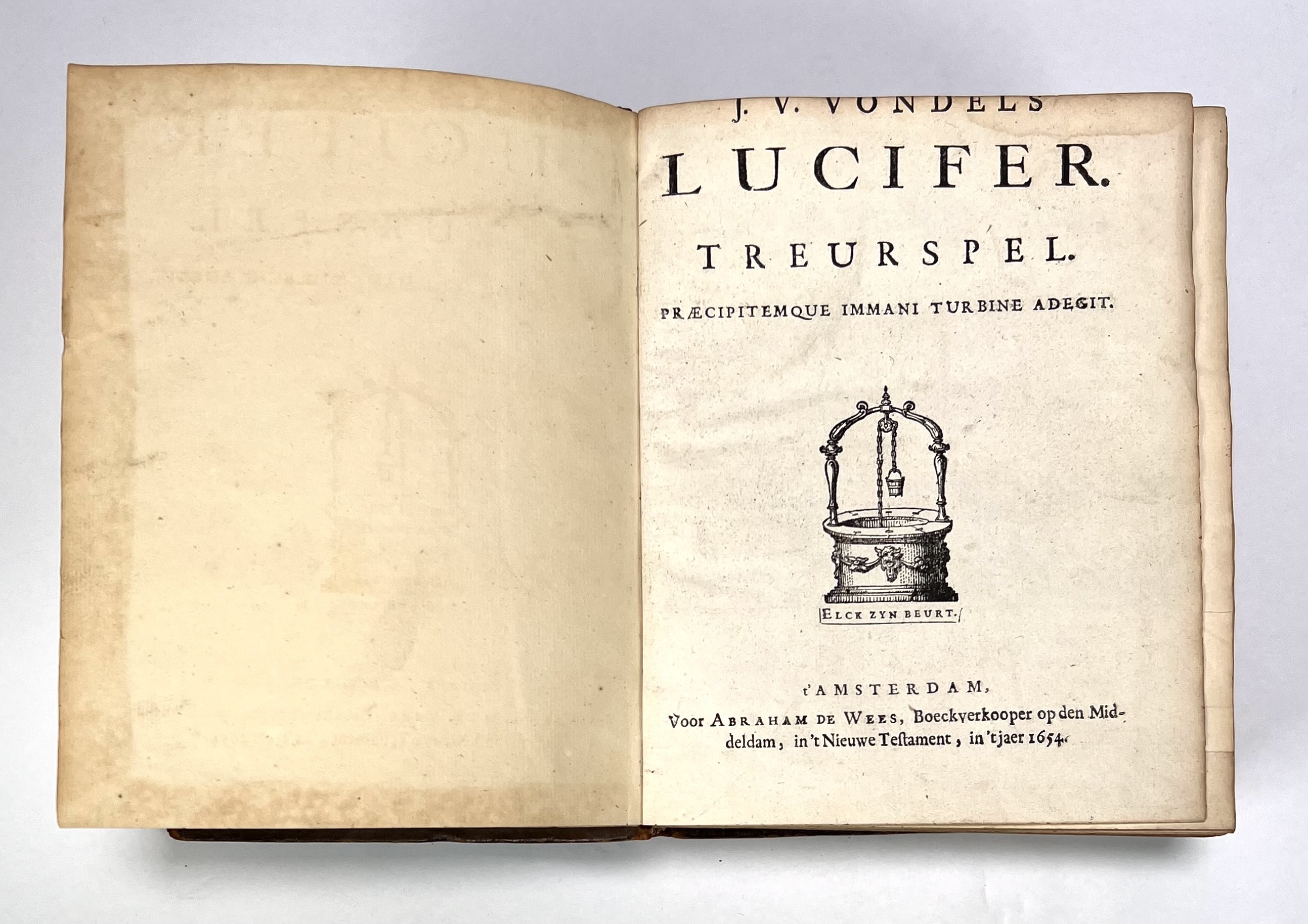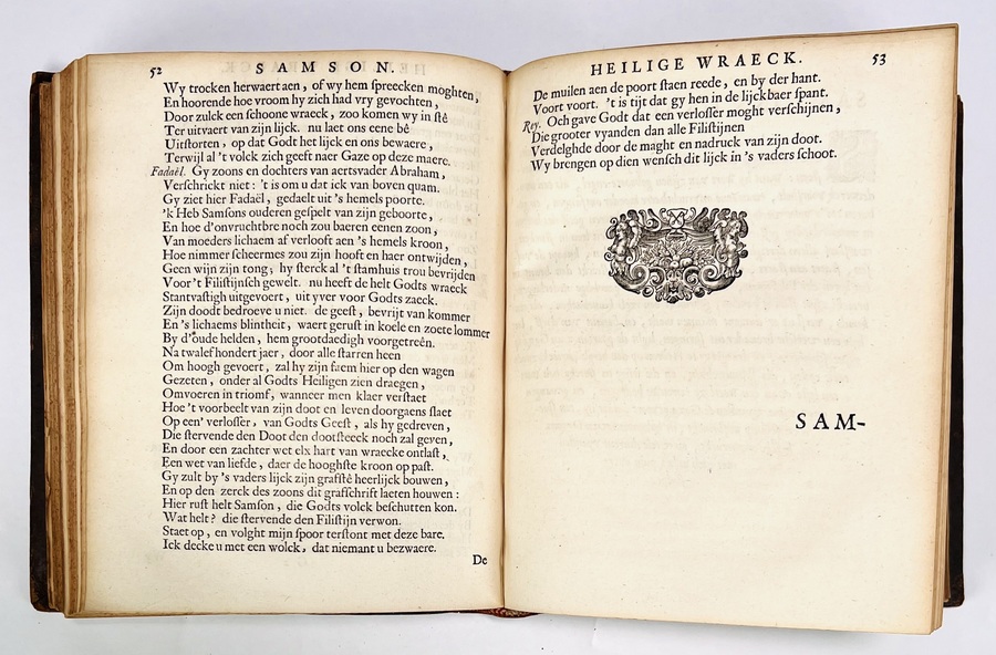 Boek met Vondels Treurspelen in lederen band uit 1654. Convoluut met diverse treurspelen. |