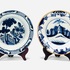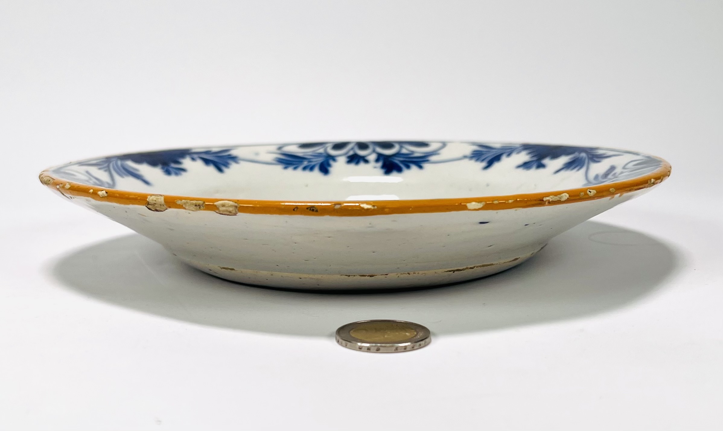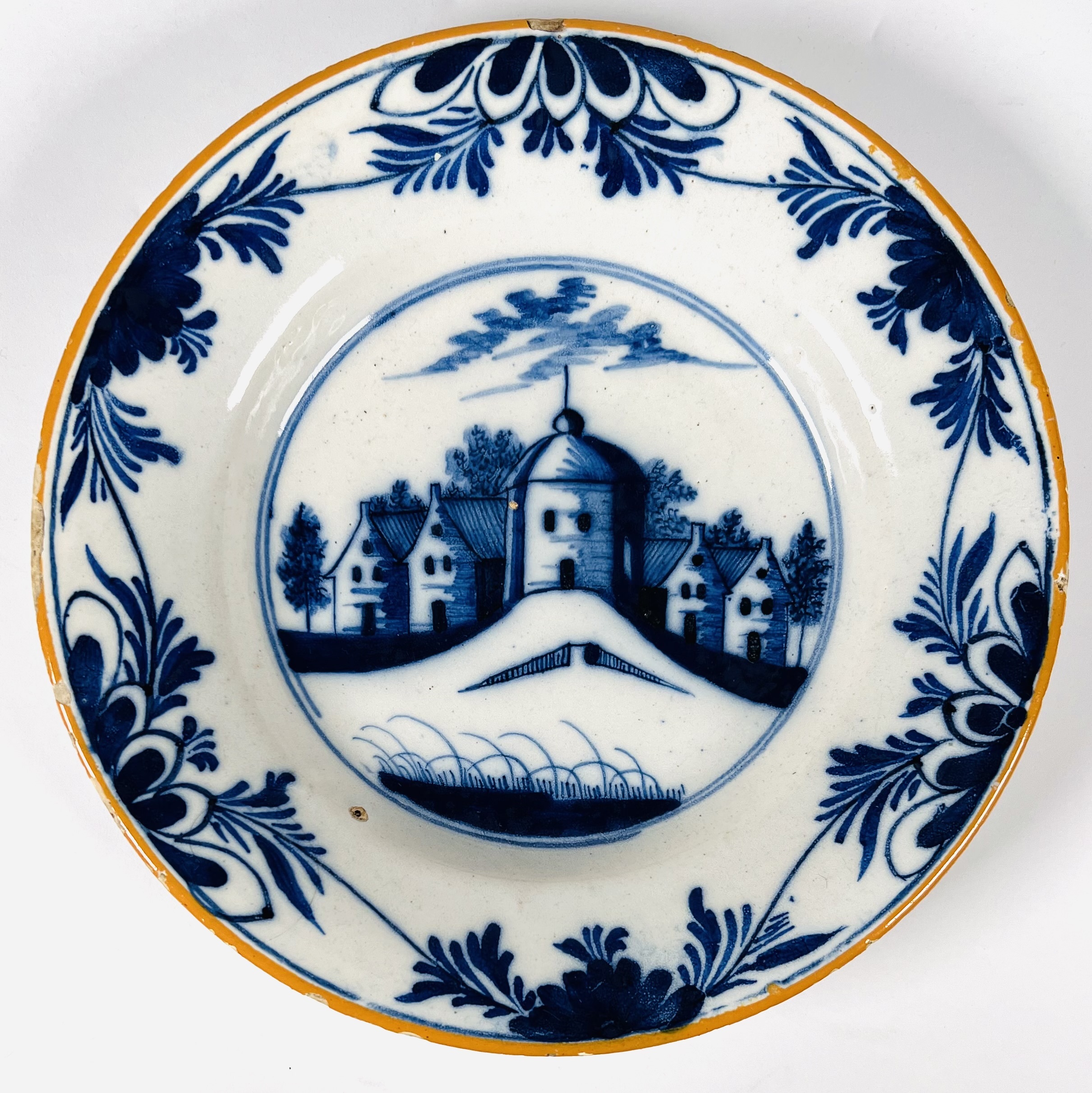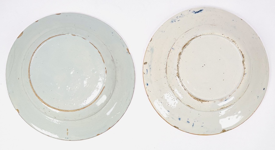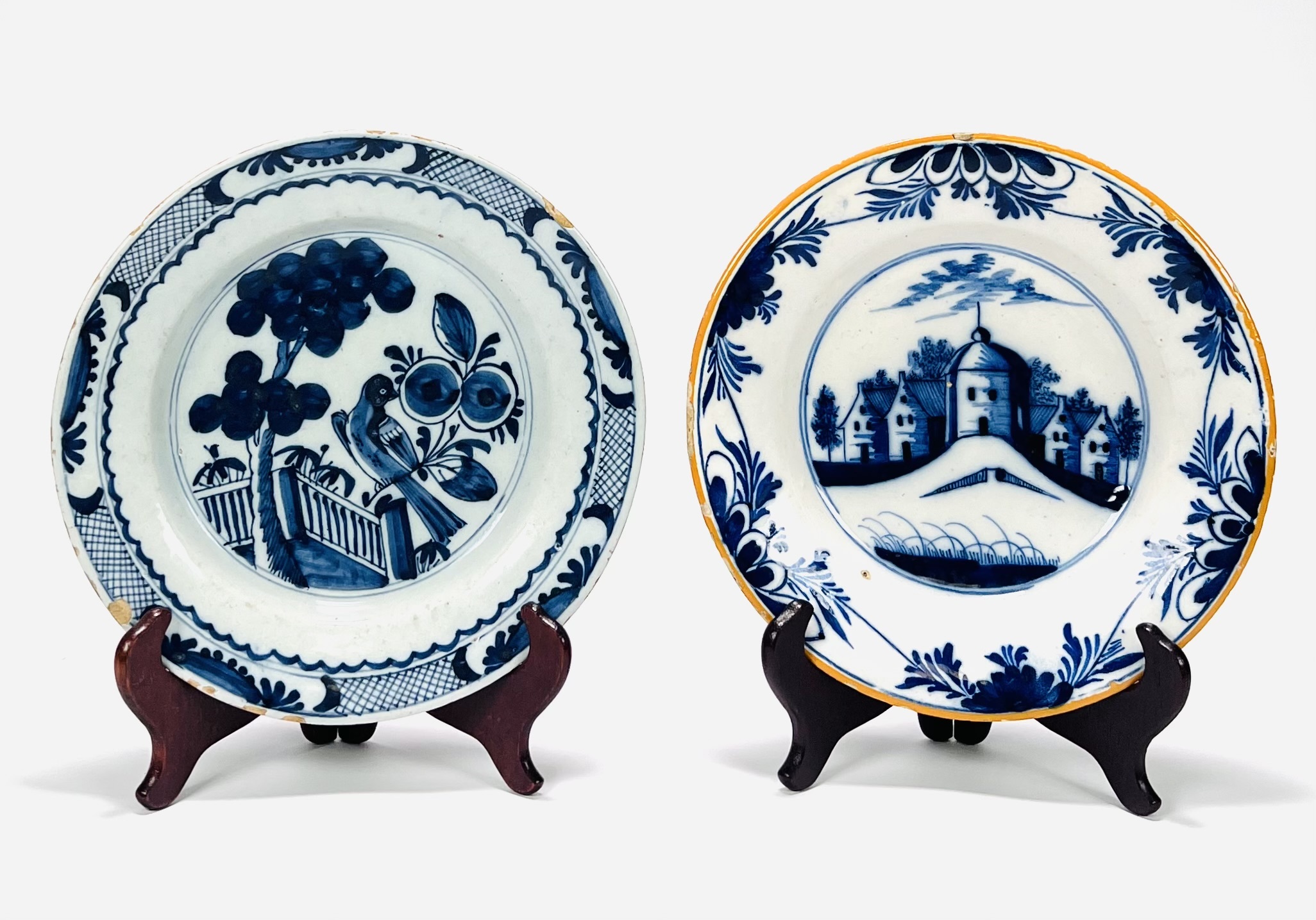 Twee Delfts blauwe handbeschilderde aardewerken borden met landschappelijk- en vogelmotief. Begin 1800. |