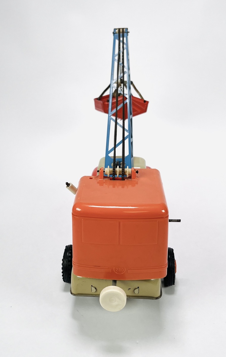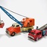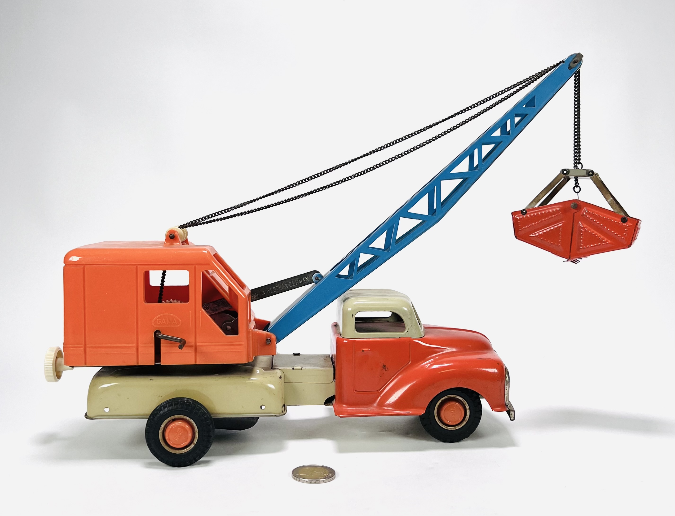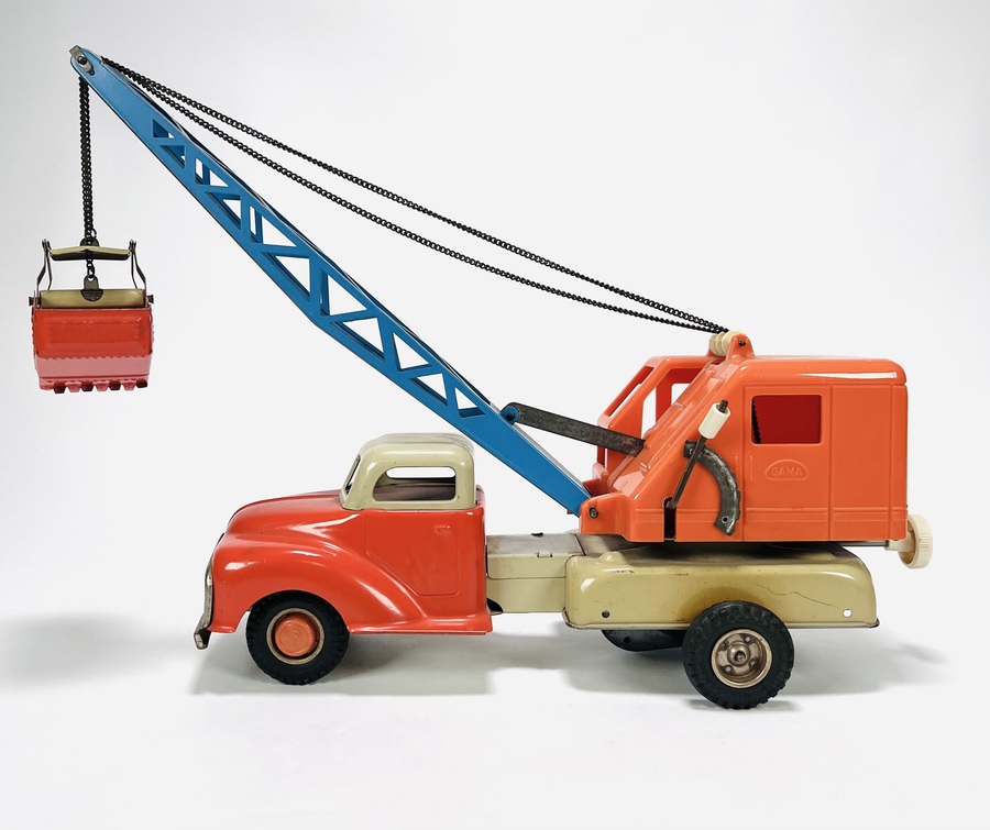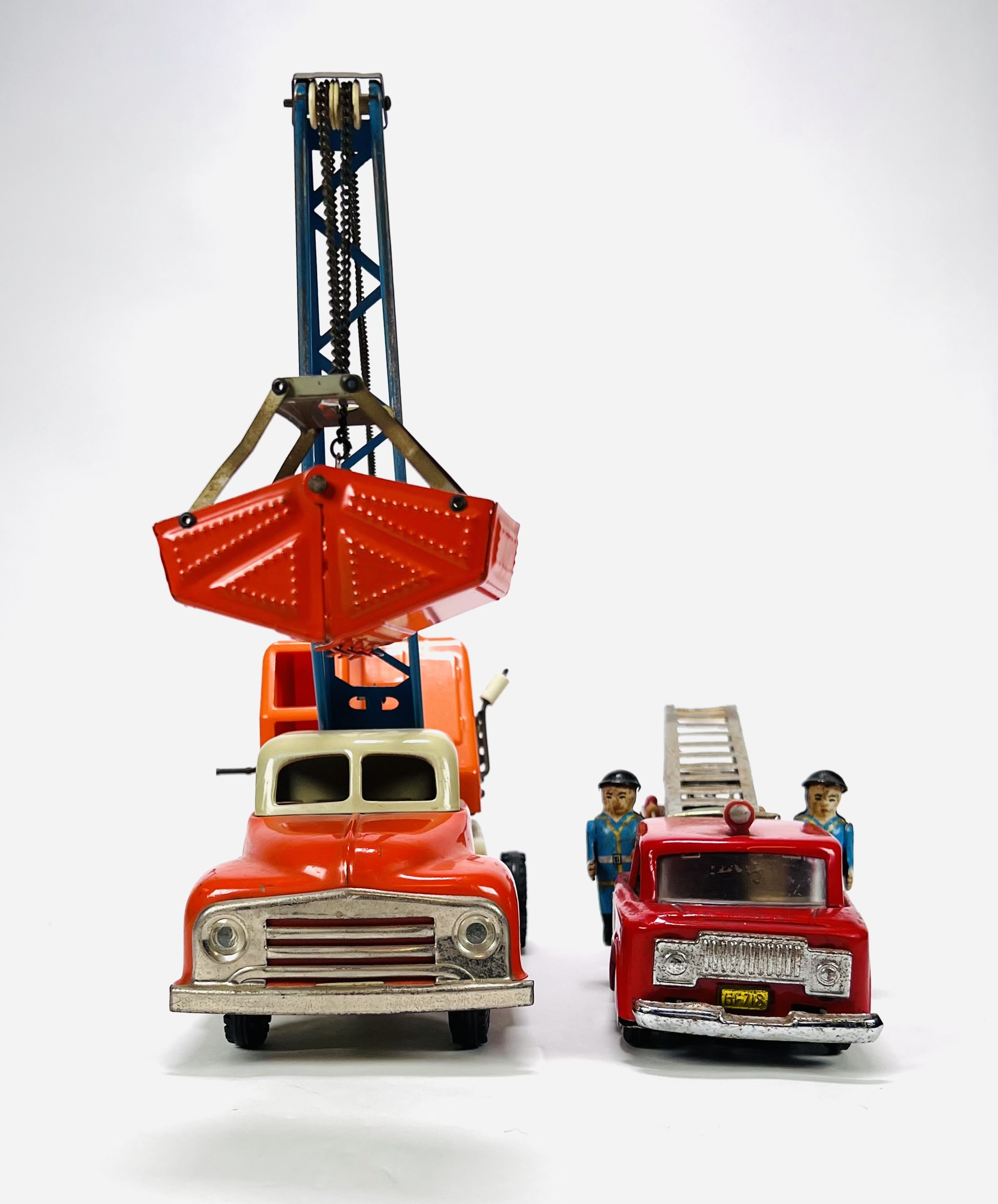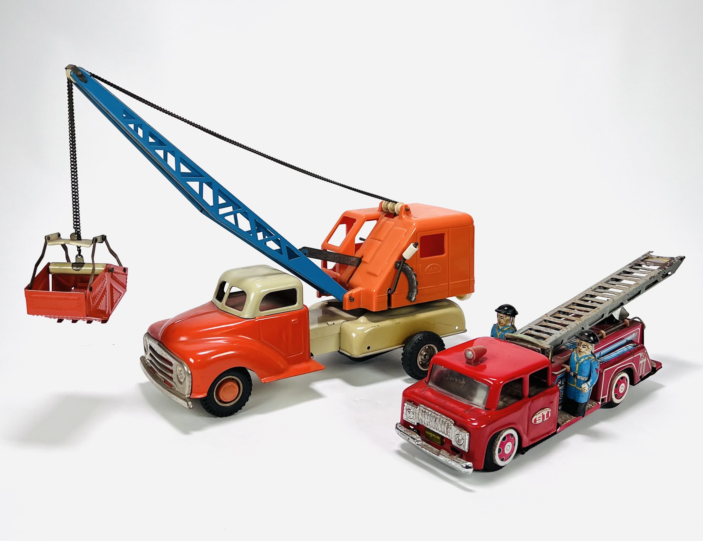 Metalen kraanwagen met kunststoffen machinist deel door de Duitse speelgoedfabrikant GAMA (Georg Adam Mangold), aan de onderzijde gemerkt Made in Western Germany, jaren 50/60. Daarnaast een blikken brandweerauto door STI. Made in China, jaren 60/70. |