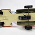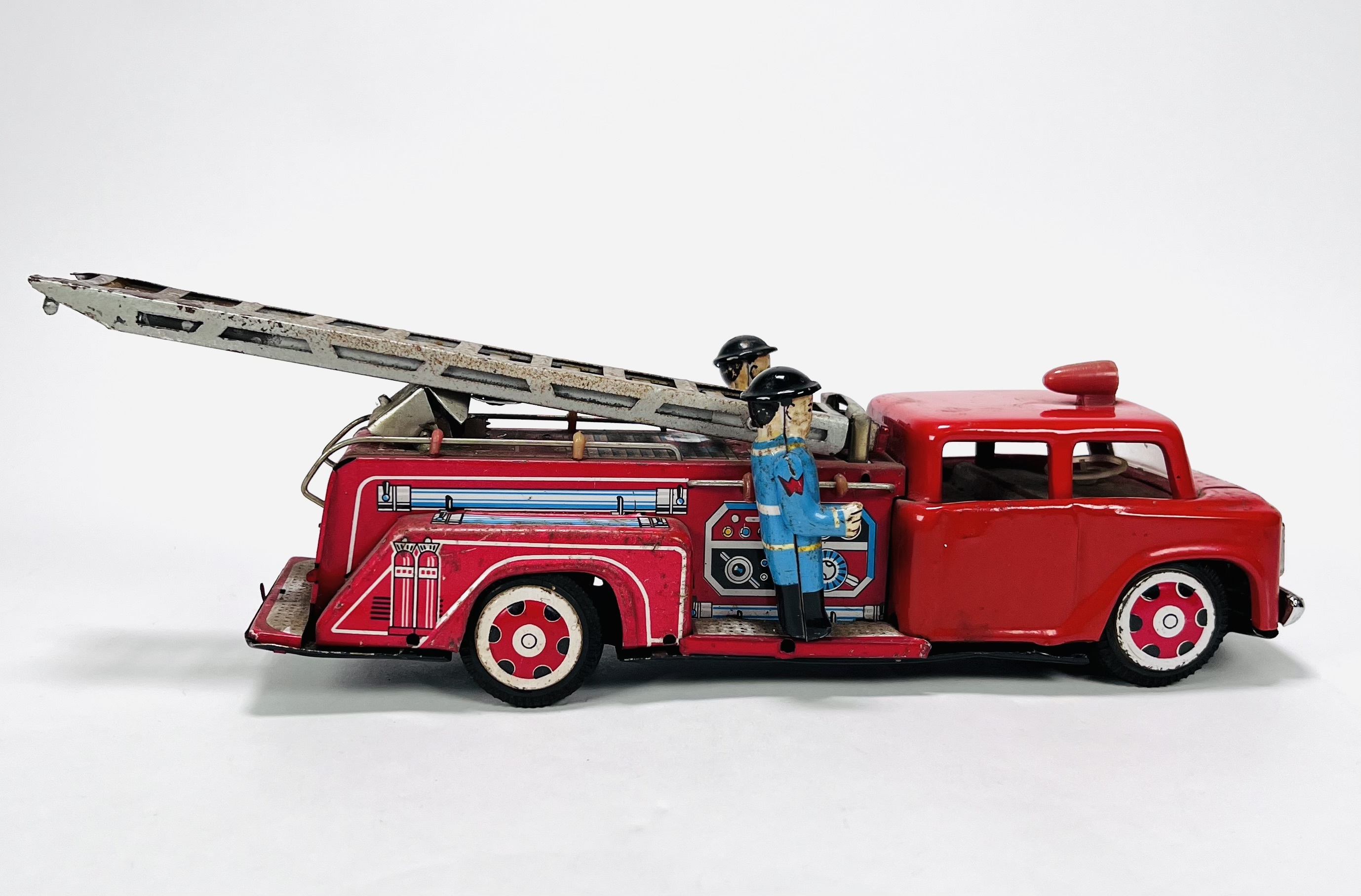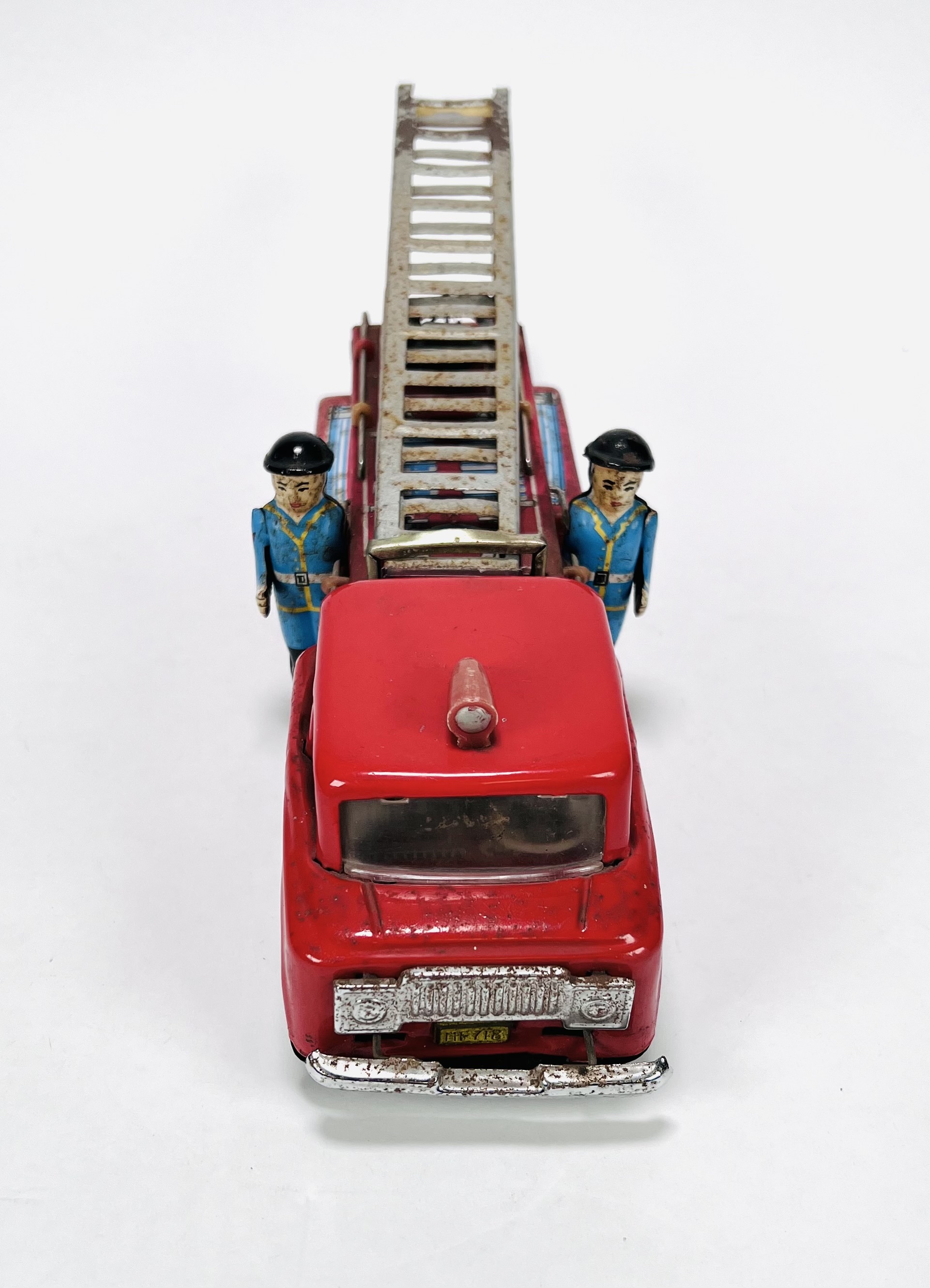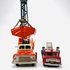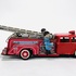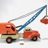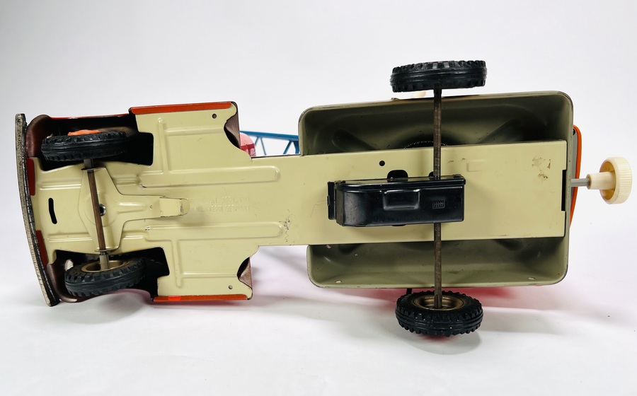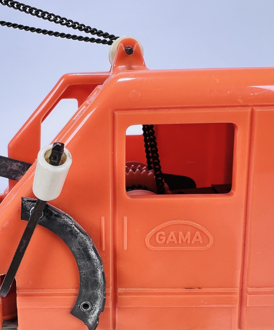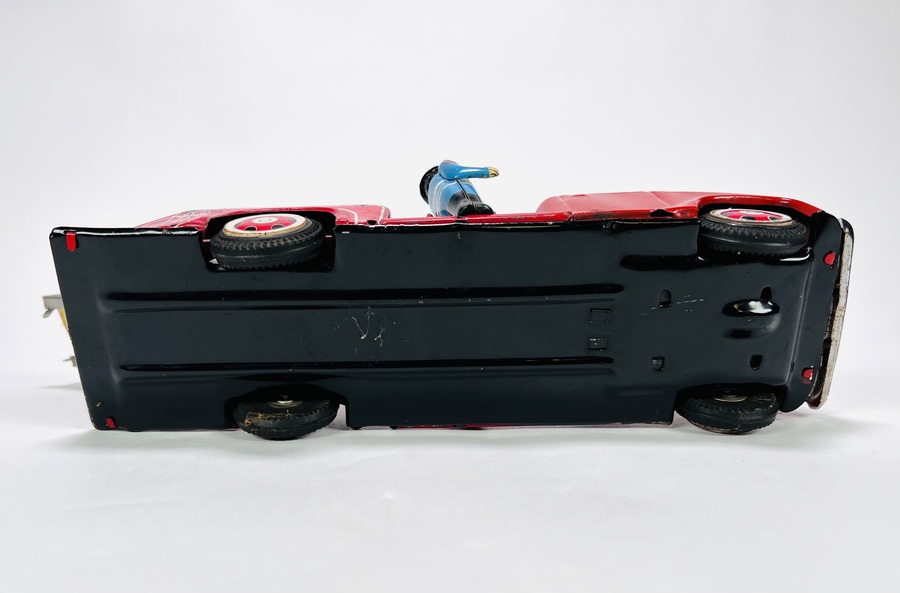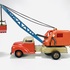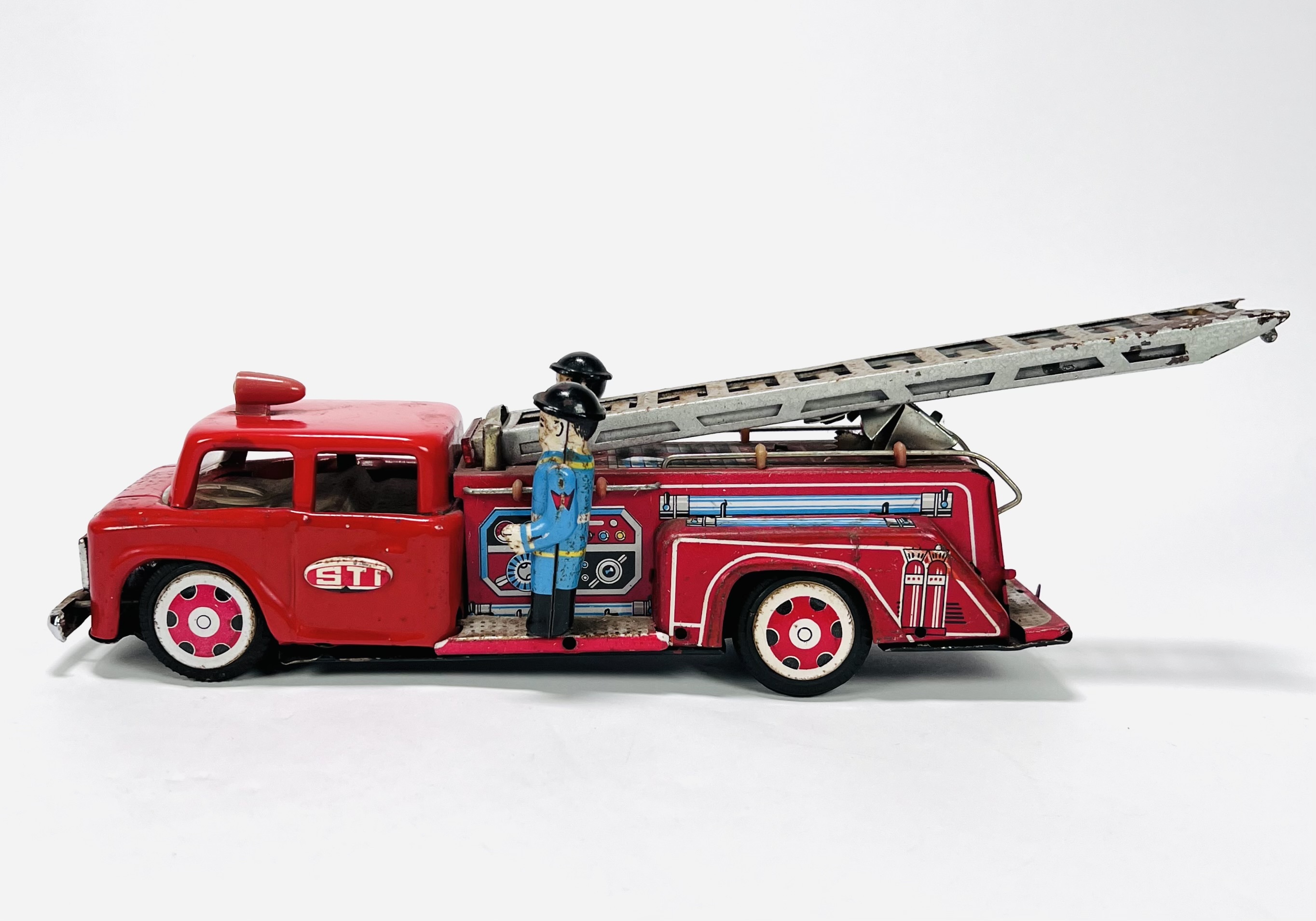 Metalen kraanwagen met kunststoffen machinist deel door de Duitse speelgoedfabrikant GAMA (Georg Adam Mangold), aan de onderzijde gemerkt Made in Western Germany, jaren 50/60. Daarnaast een blikken brandweerauto door STI. Made in China, jaren 60/70. |