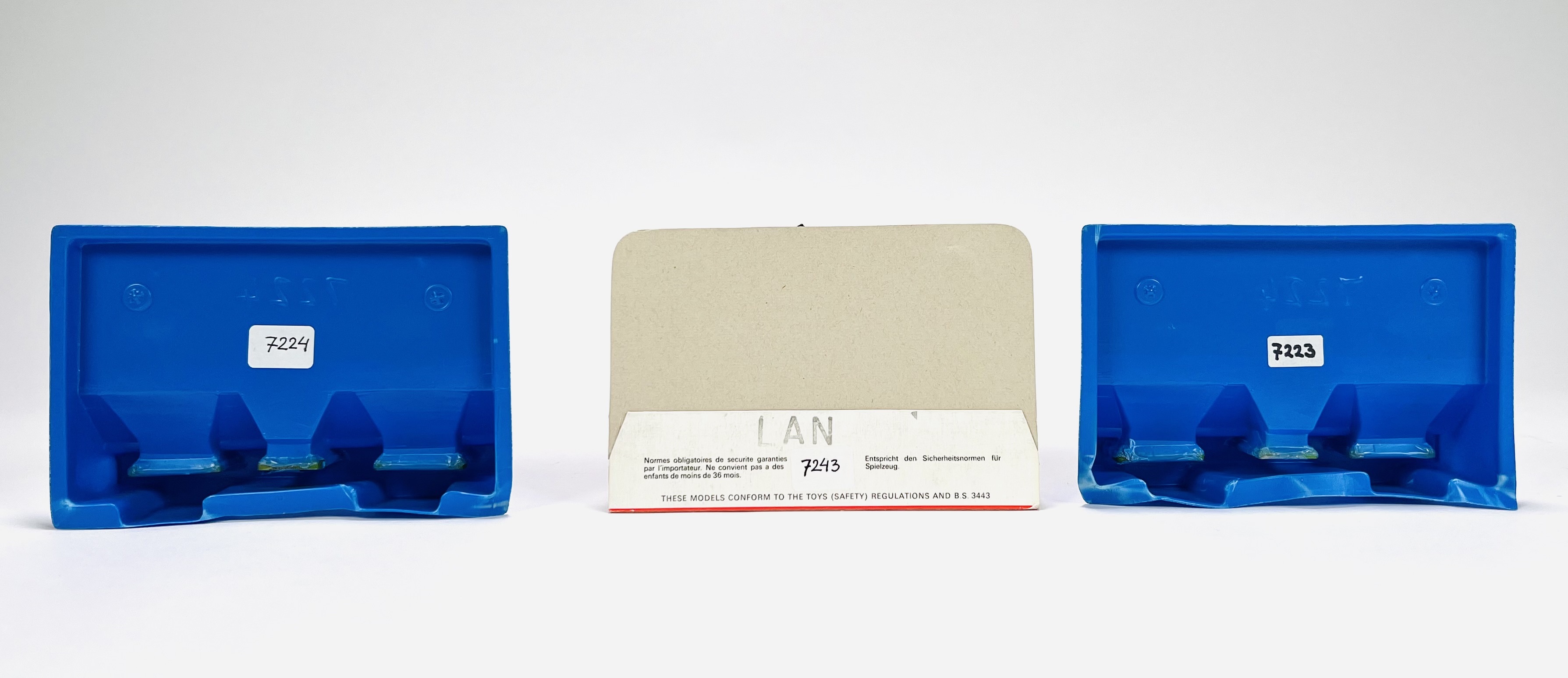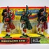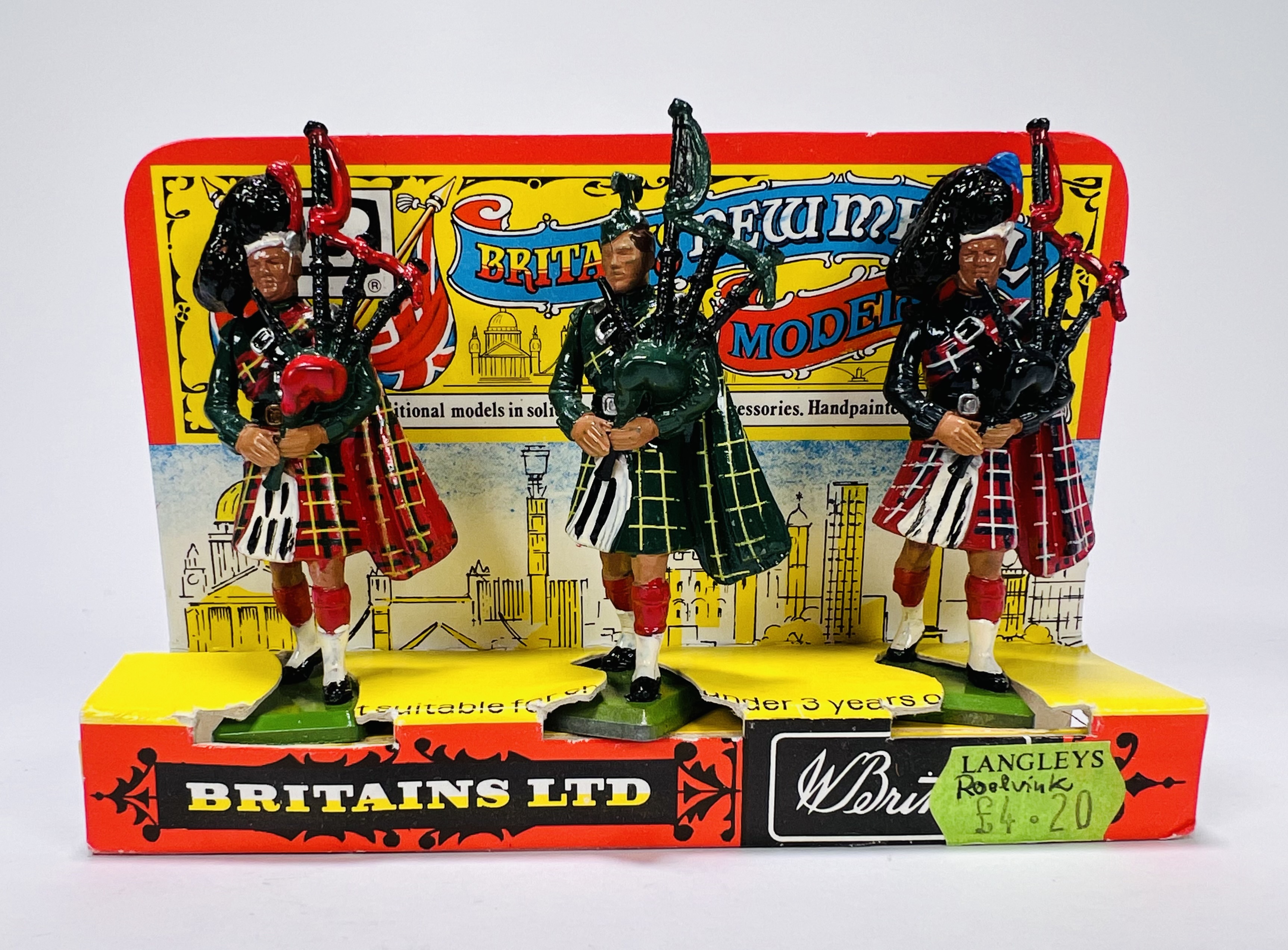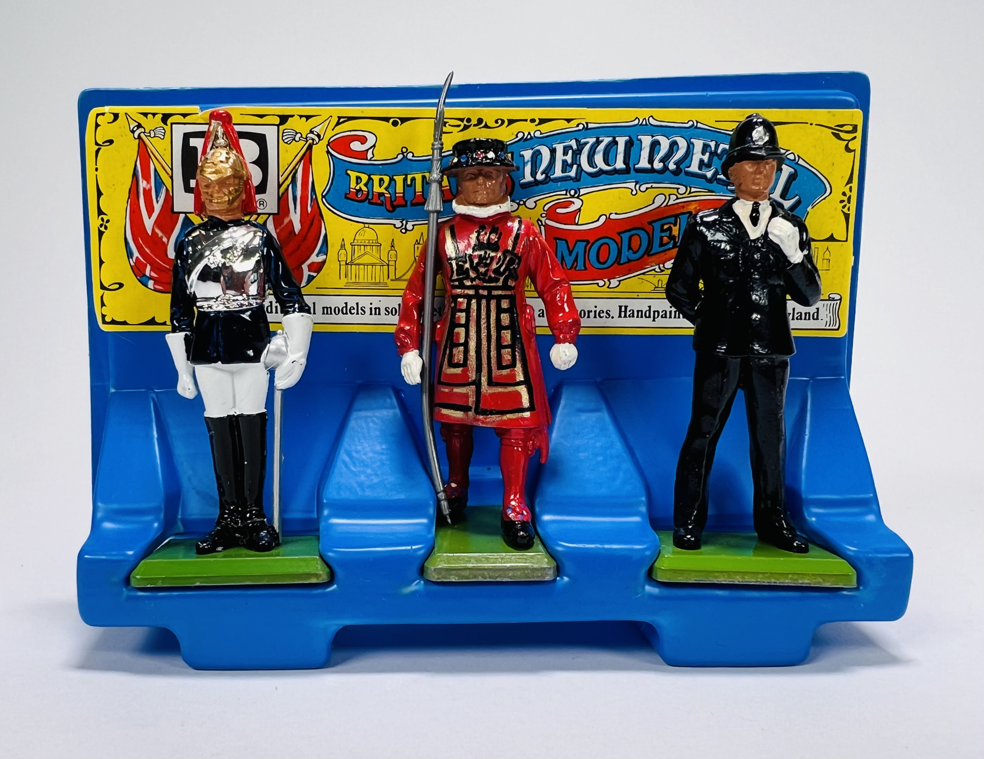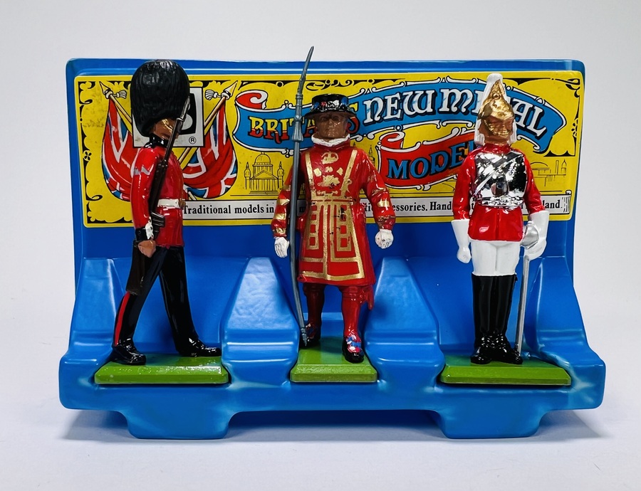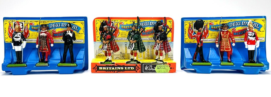 Drie verschillende Britains dispays met elk drie handbeschilderde tinnen figuren, twee displays zijn van blauwe kunststof en een display is van karton. Catalogusnummers nummers 7223/7243/722 uit 1986 en 1987. |