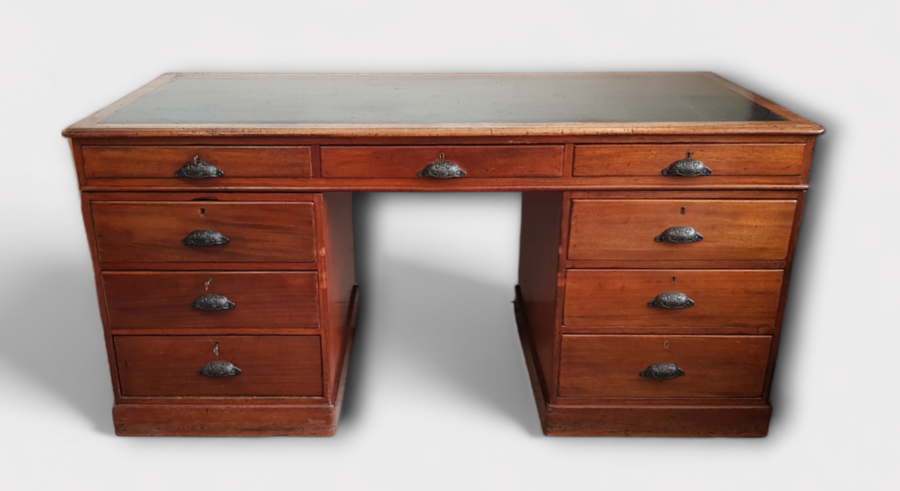 Mahoniehouten bureau met negen lades en ingelegd blad. Omstreeks 1920. |