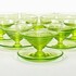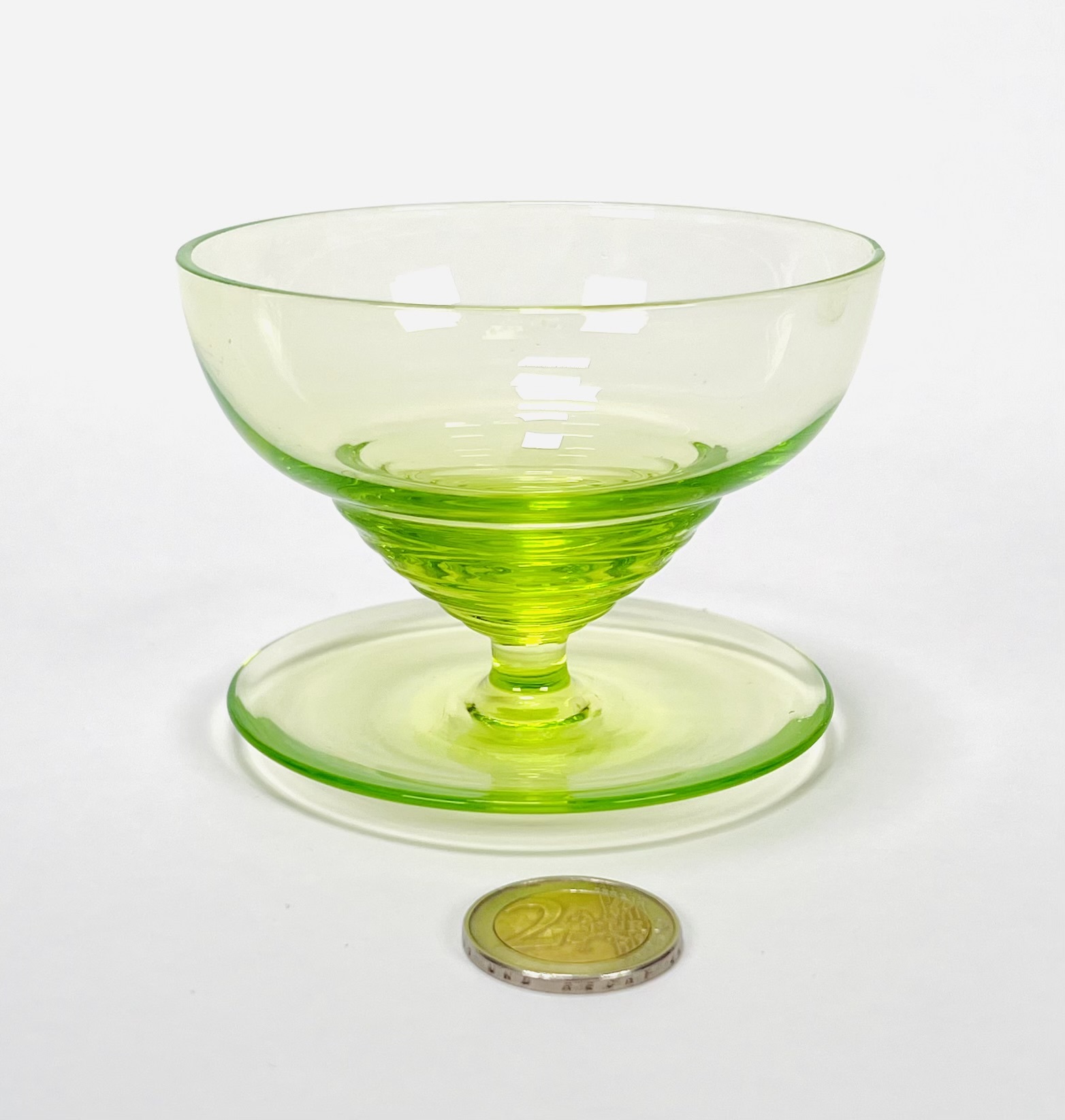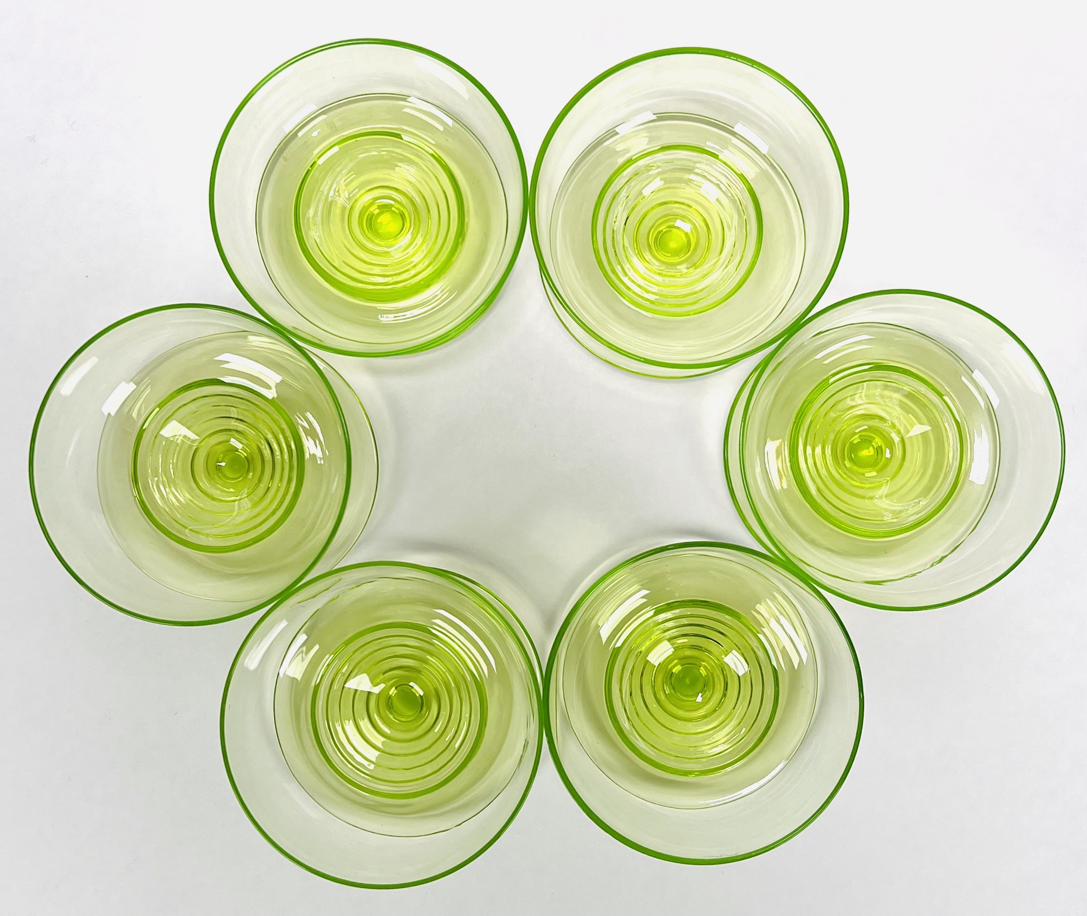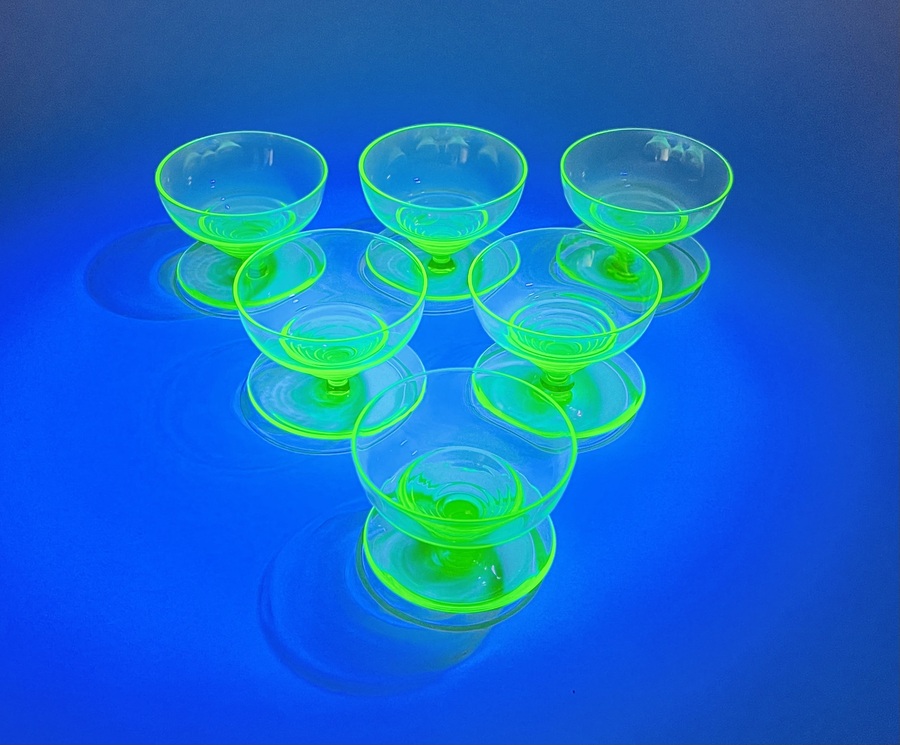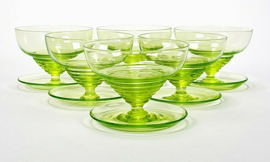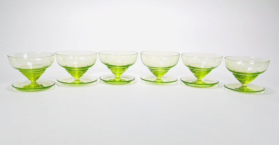 Zes uraniumglazen ijscoupes naar ontwerp van W.J. Rozendaal. Modelnaam Radio en uitgevoerd door de Kristalunie Maastricht, jaar van ontwerp 1932. |