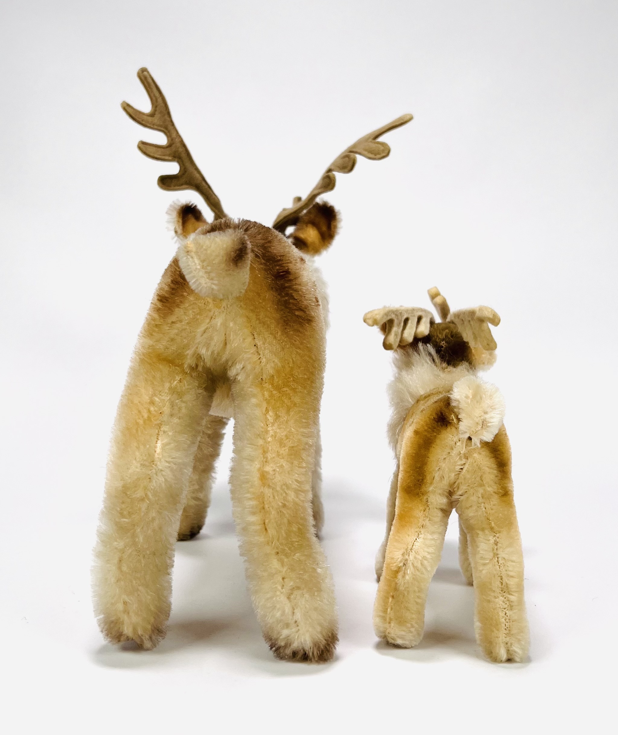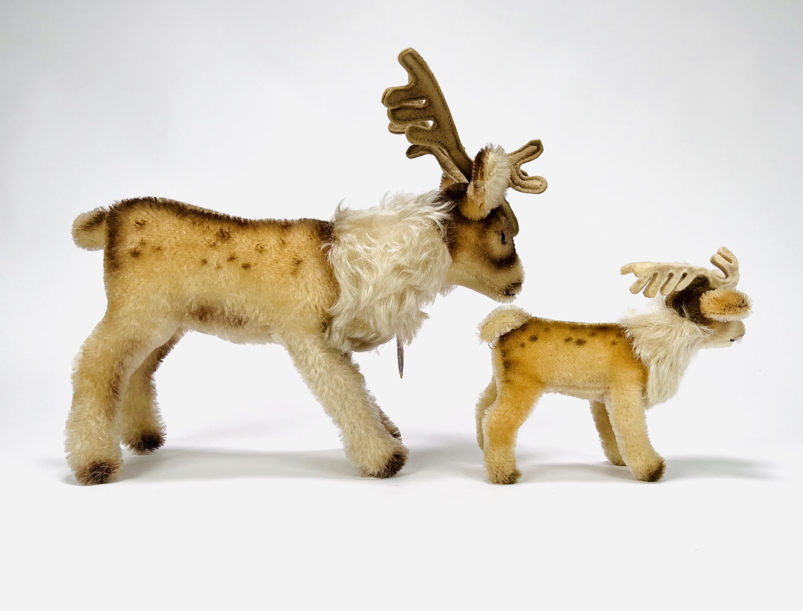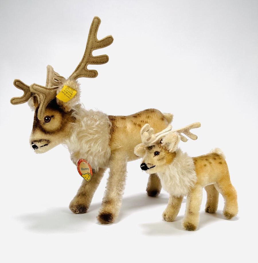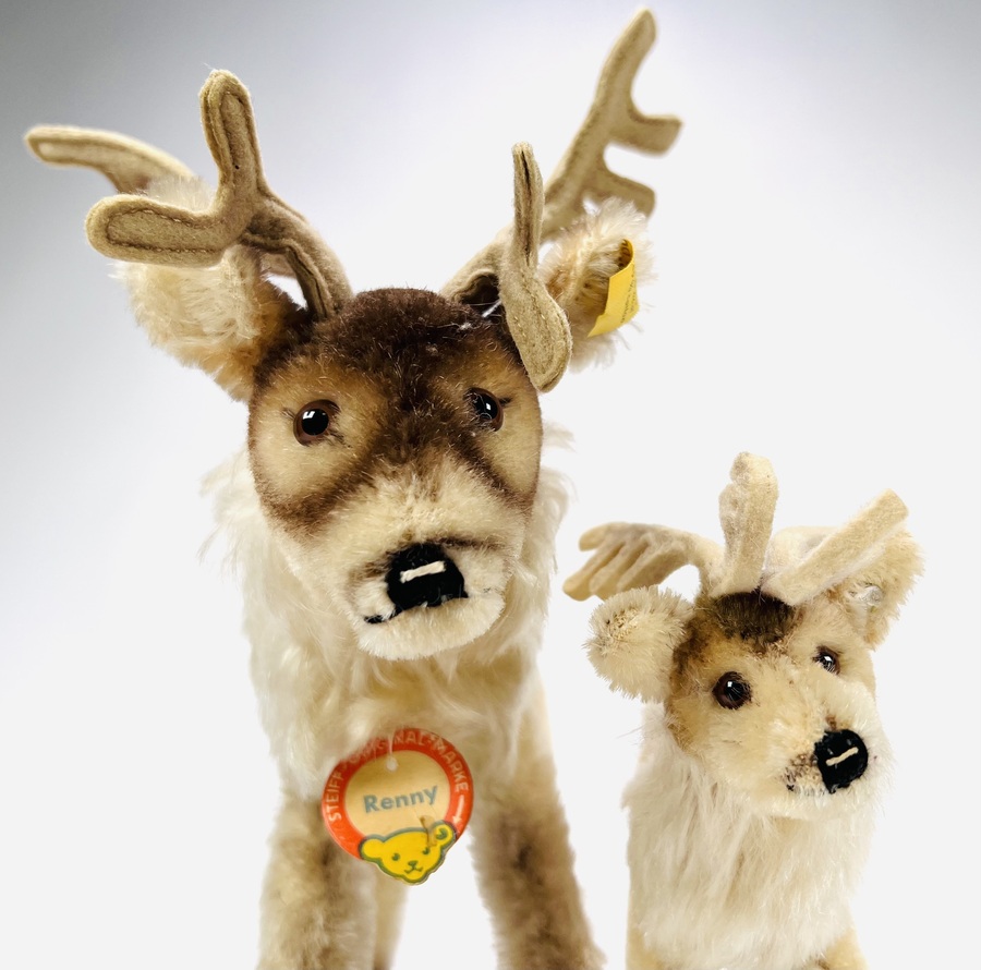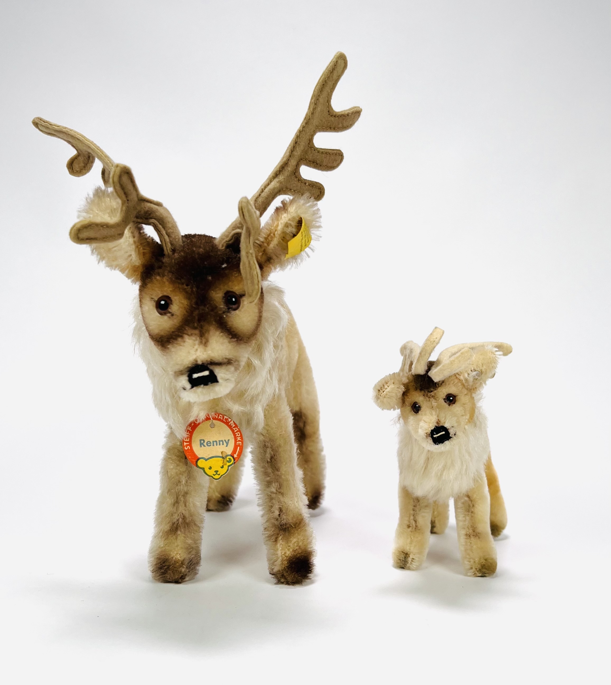 Twee rendieren van Steiff, modelnaam Renny. Beide pluchedieren gemerkt met zilveren Knopf in het oor, grootste rendier met papieren naamlabel en geel identificatielabel. Made in Germany, jaren 70. |