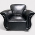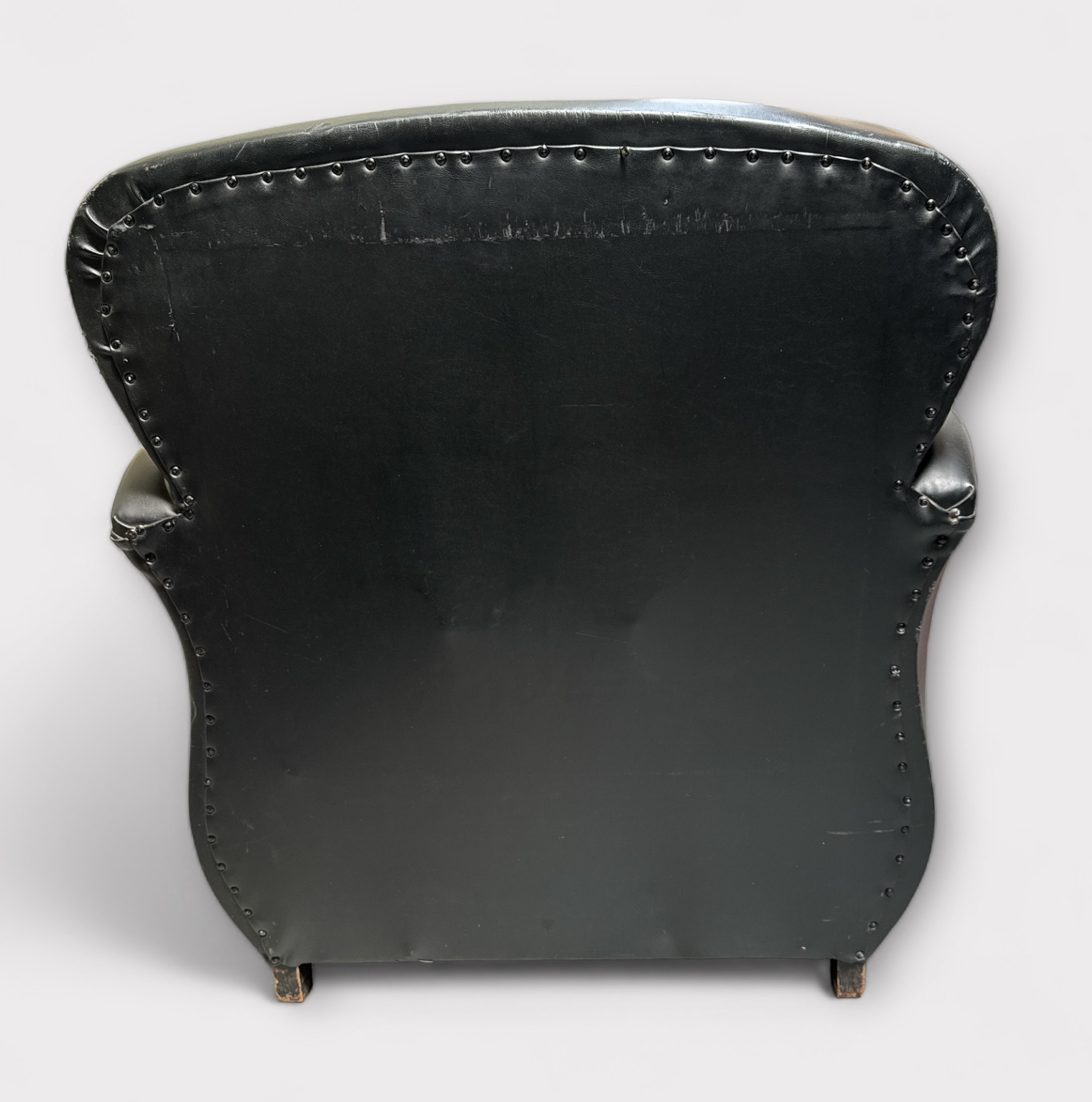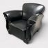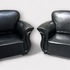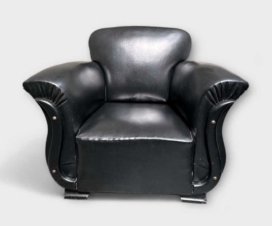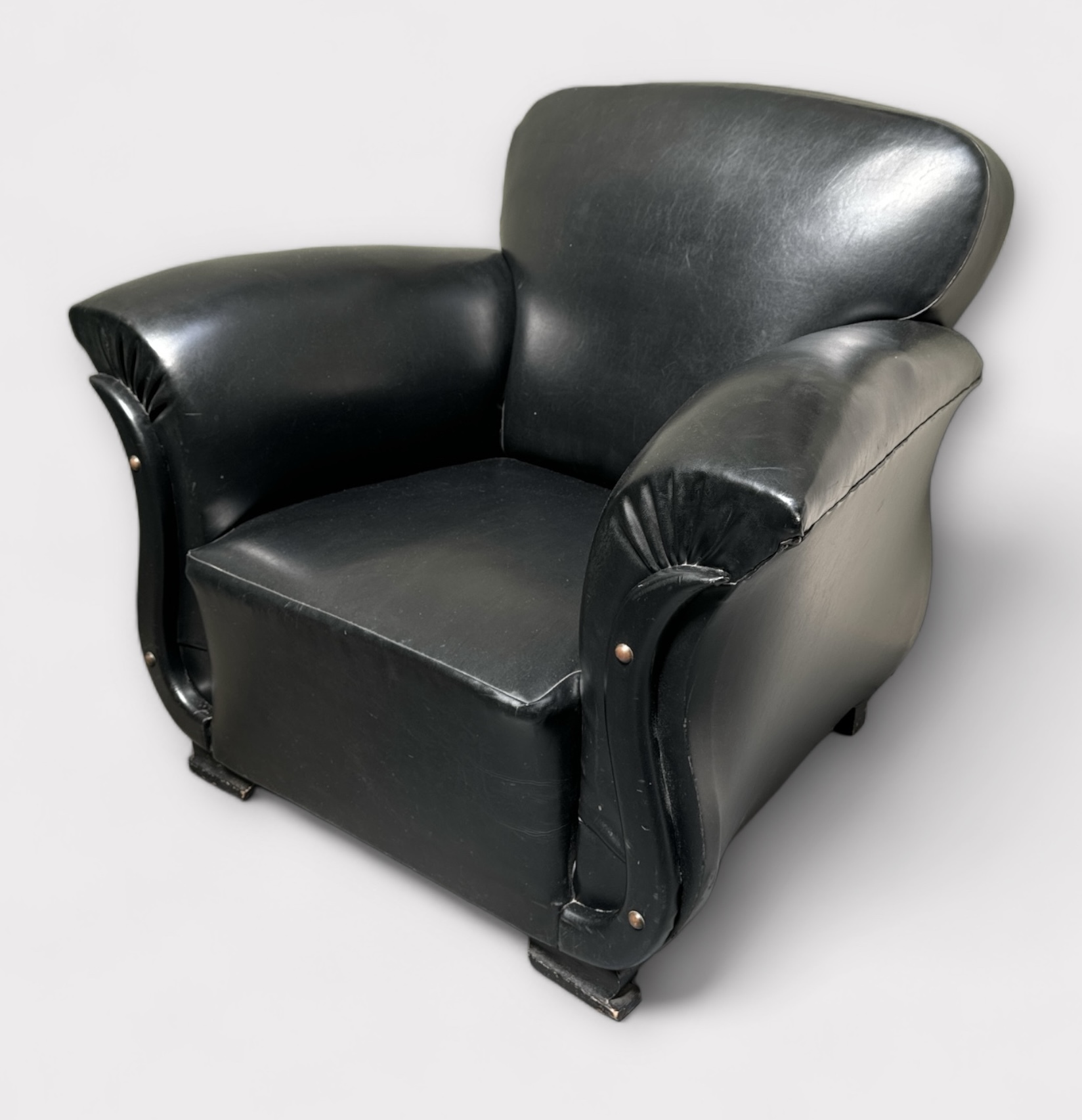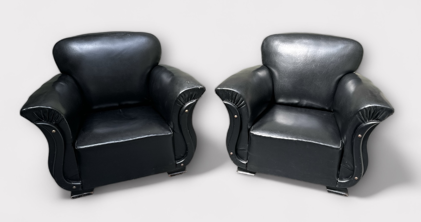 Twee zwarte Art Deco stoelen met vinyl bekleding en houten applicaties. Midden 20e eeuw. |