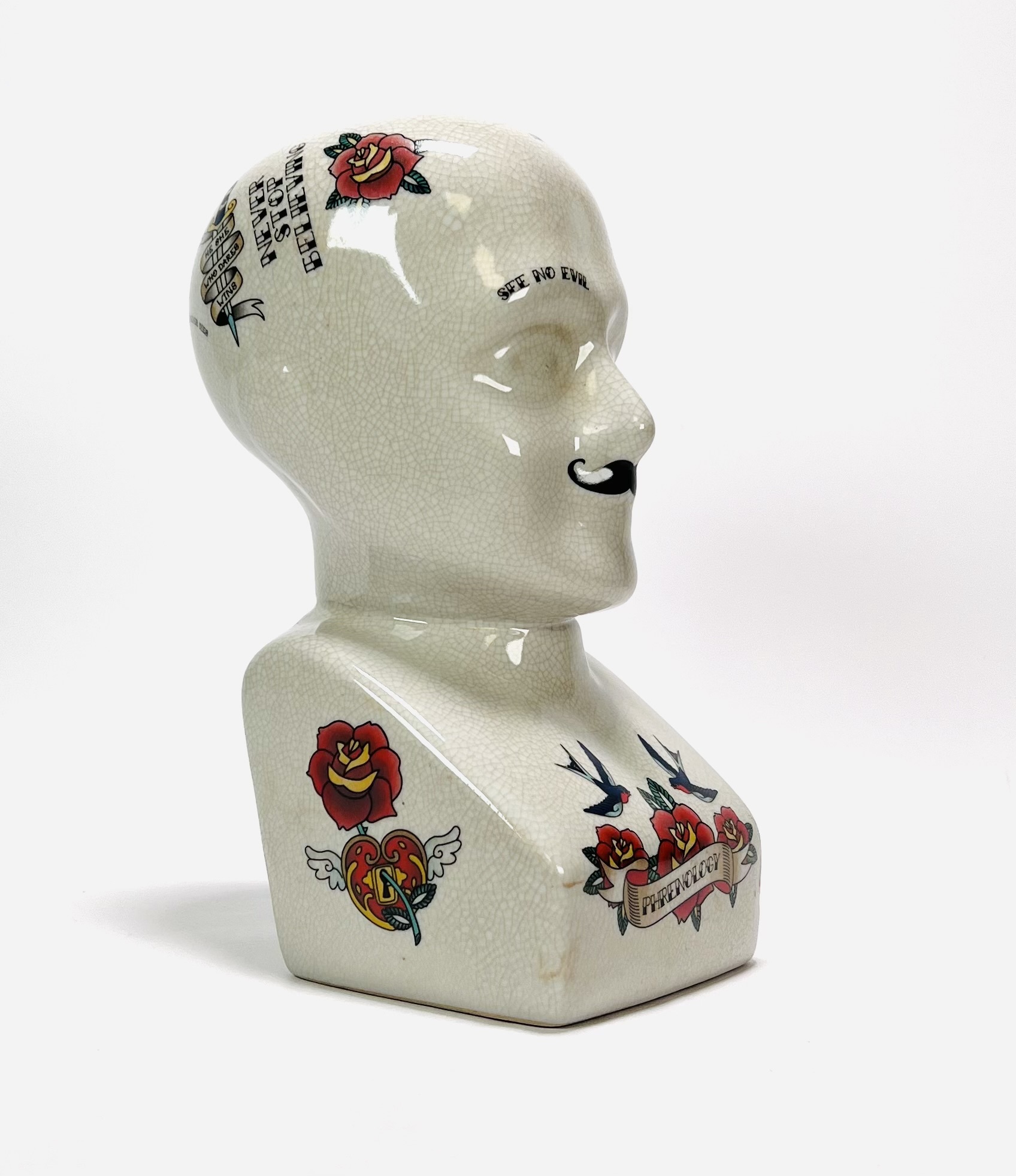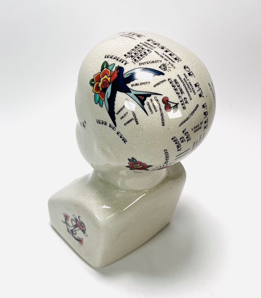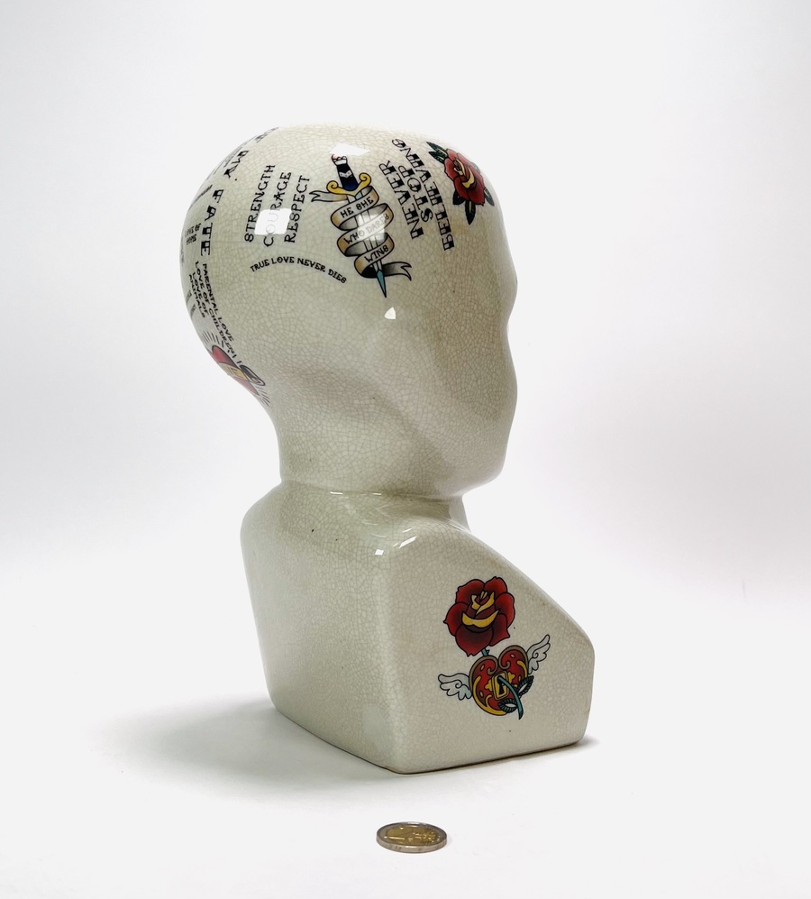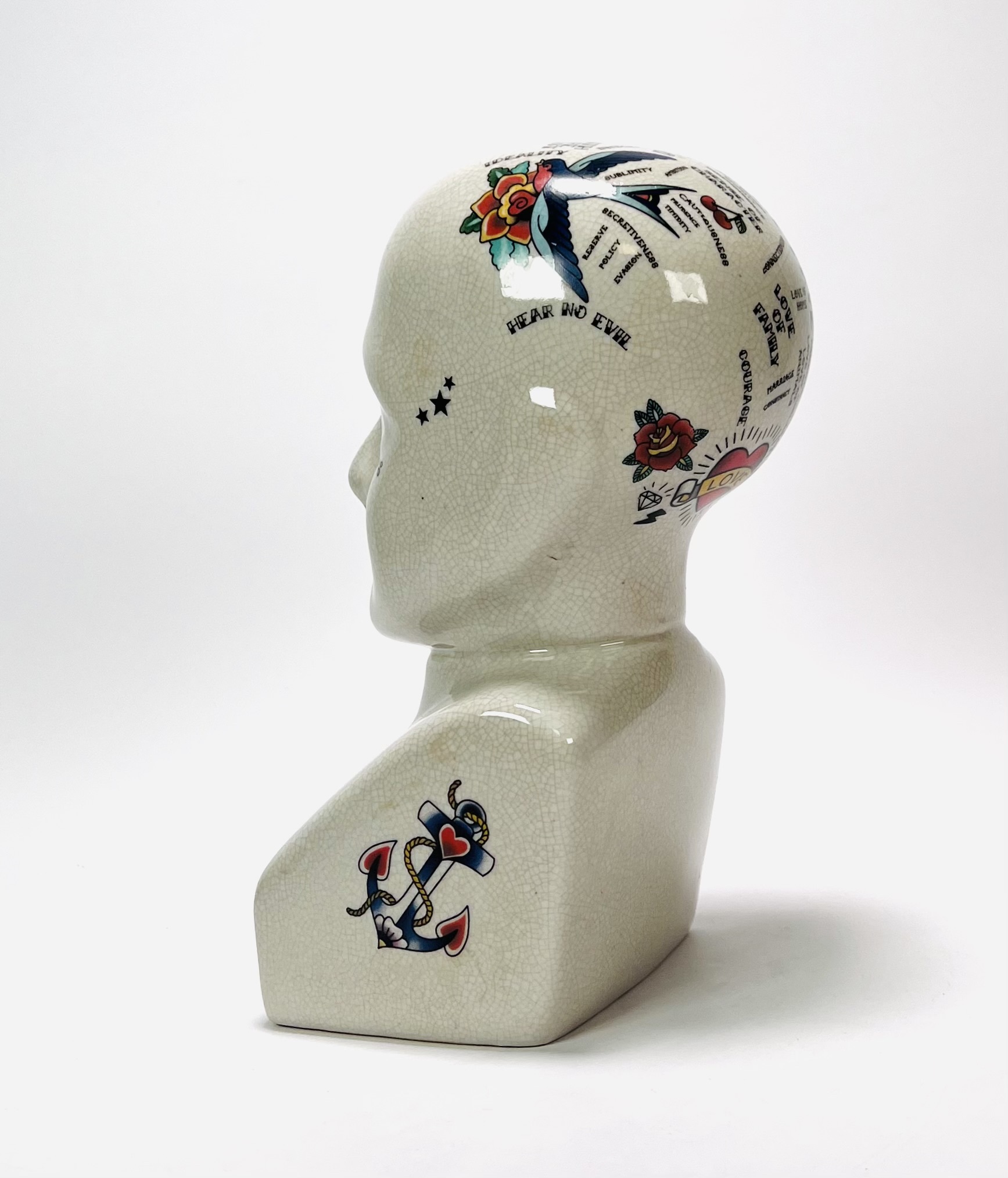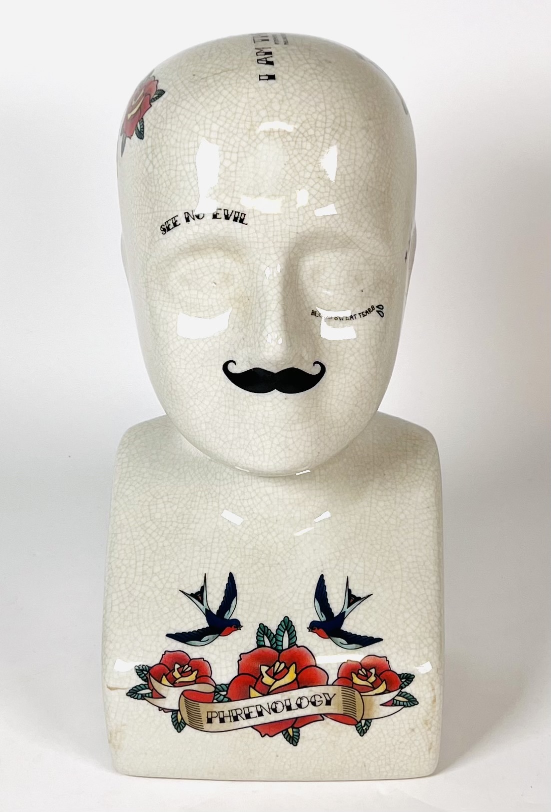 Porseleinen frenologiehoofd met florale- en vogel afbeeldingen en karakter eigenschappen, 21e eeuw. |
