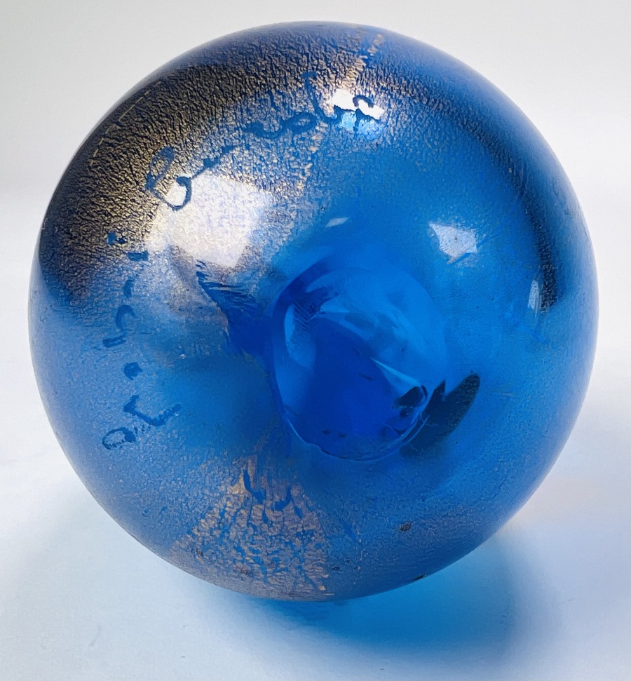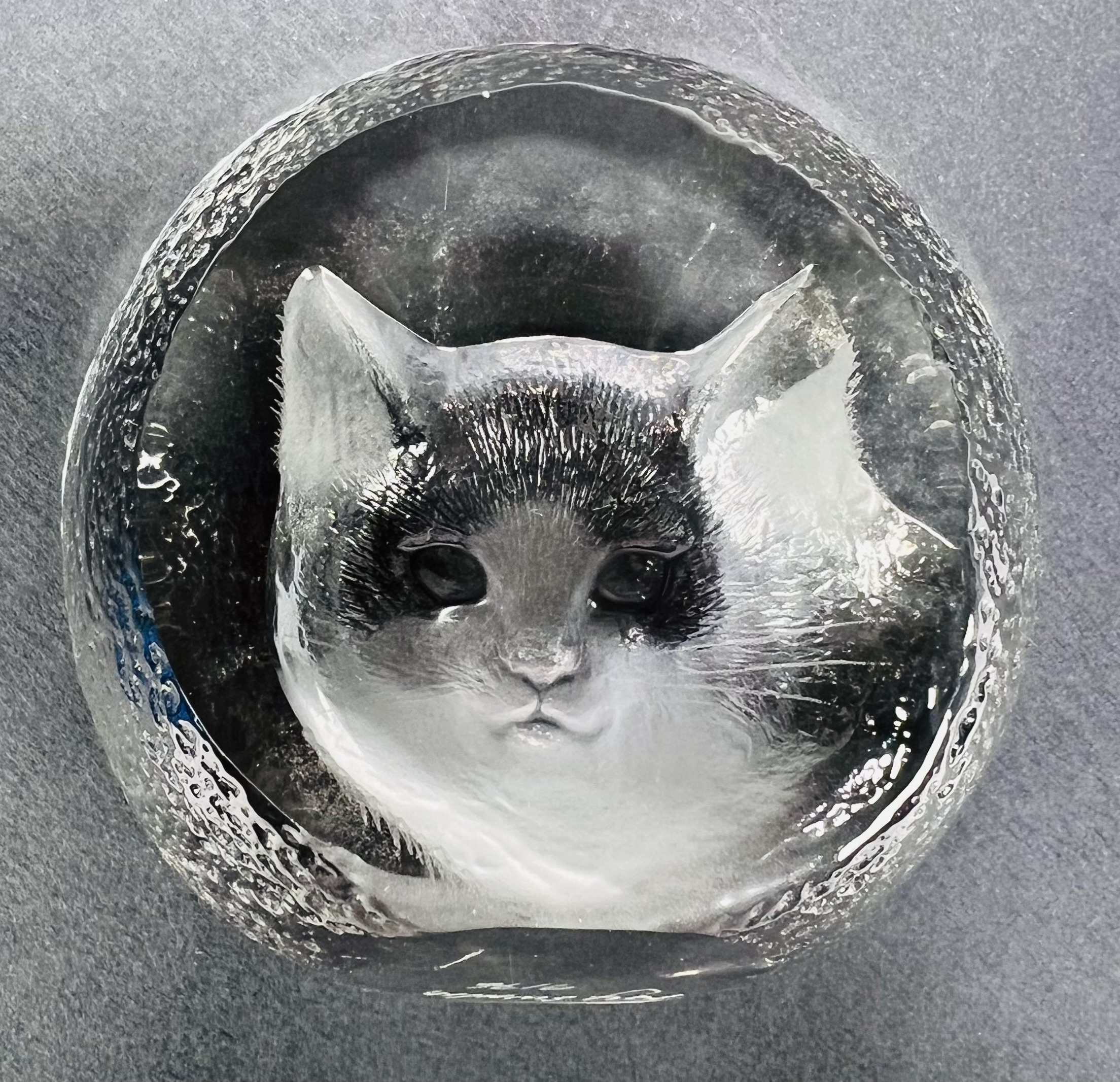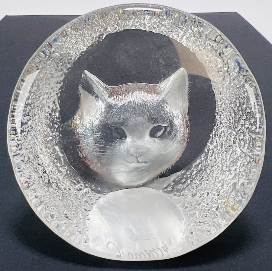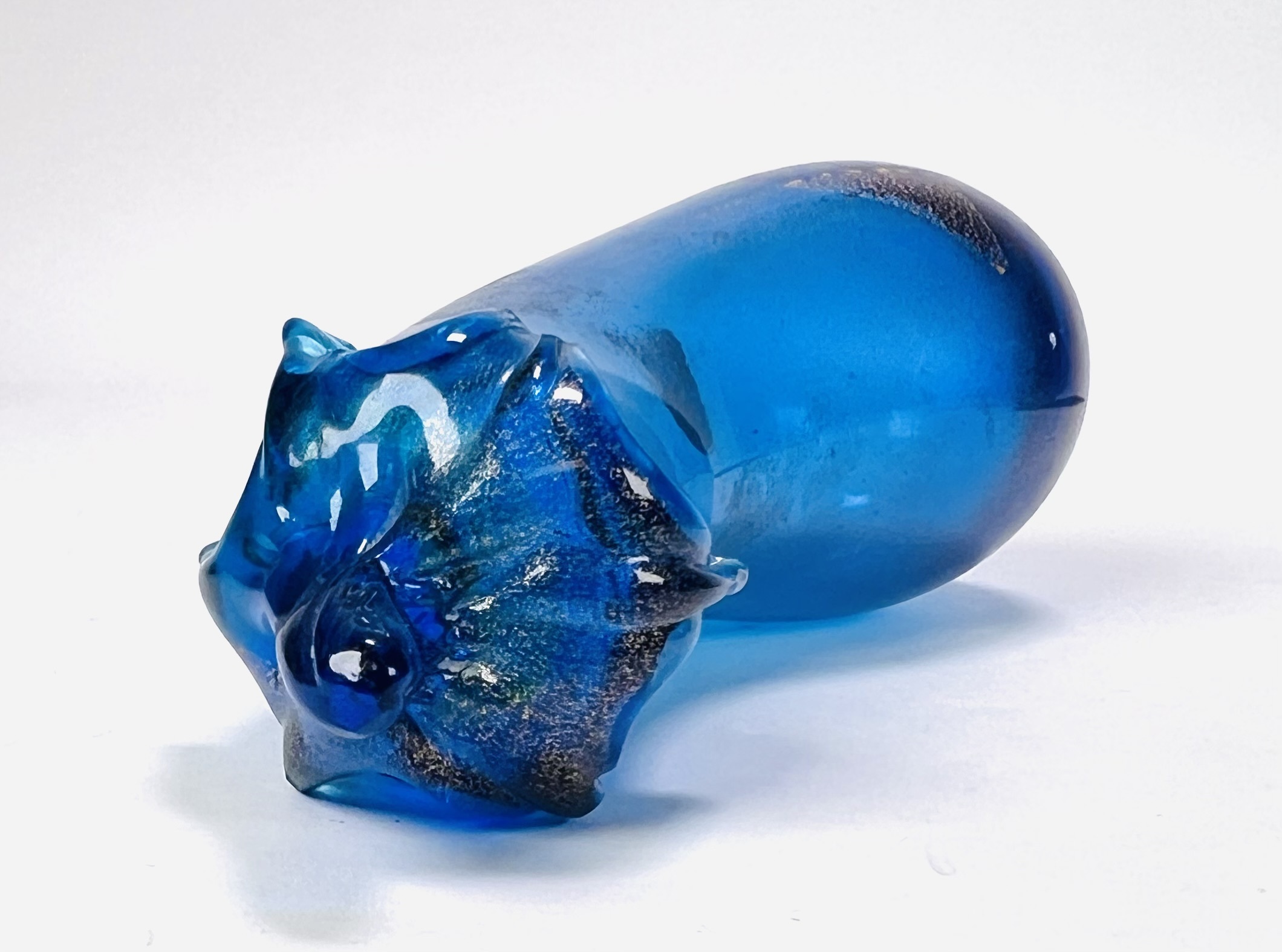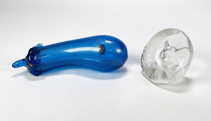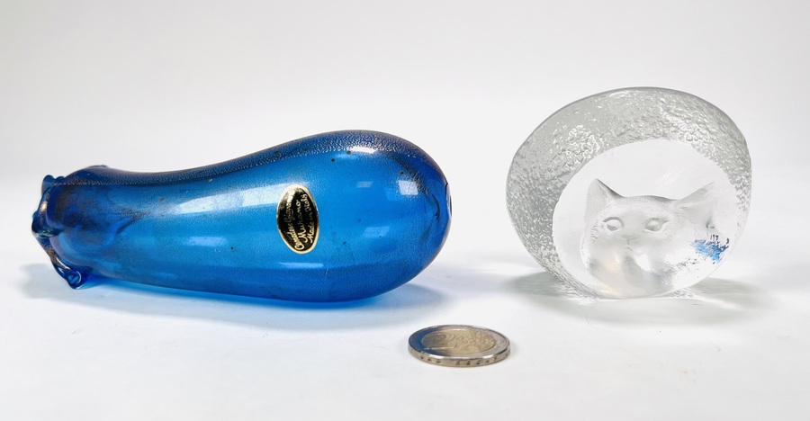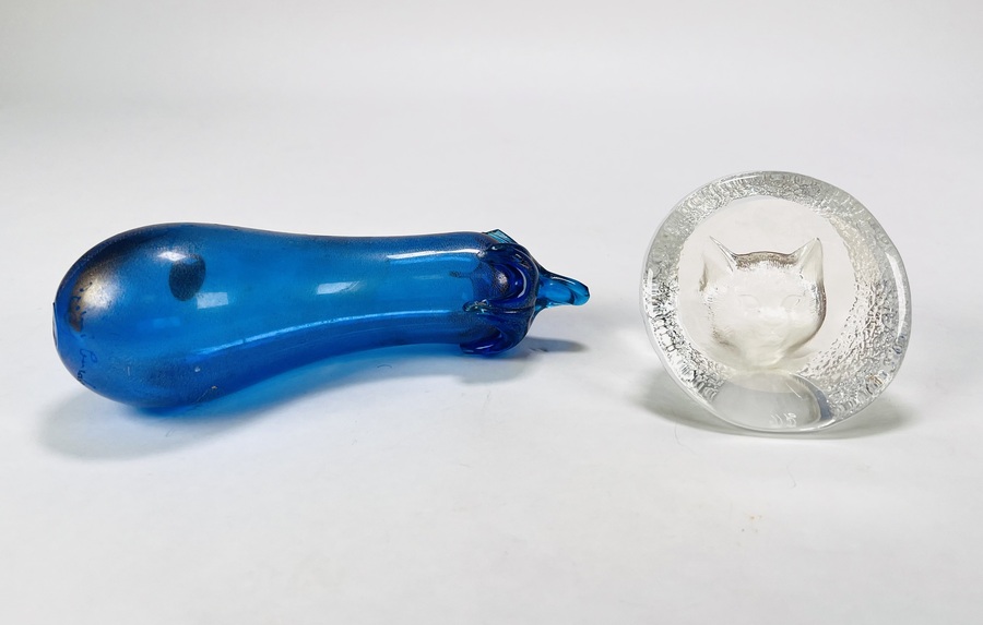 Een blauw glazen Murano aubergine met goudeffect door Cenedese Giovanni, Venetië. Tevens een kristallen presse-papier met afbeelding van een kop van een kat door Mats Jonasson, aan de onderzijde gegraveerd MJ Sweden 9/76. Vierde kwart 20e eeuw. |