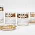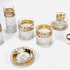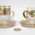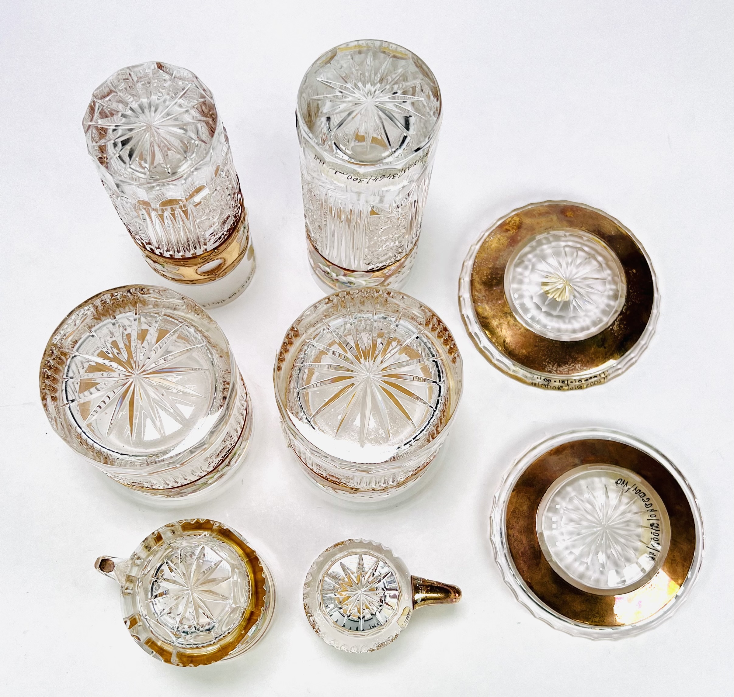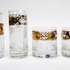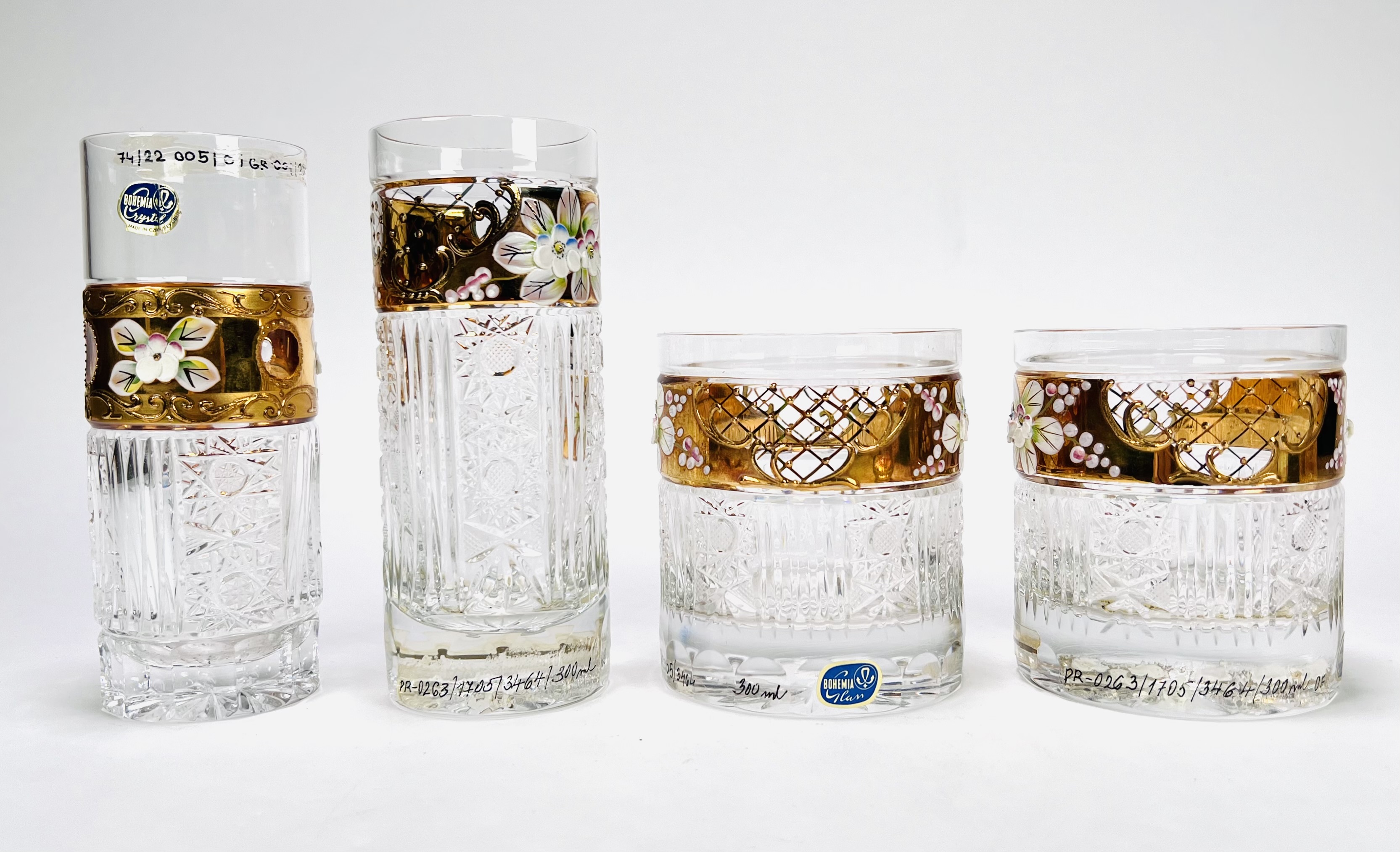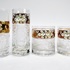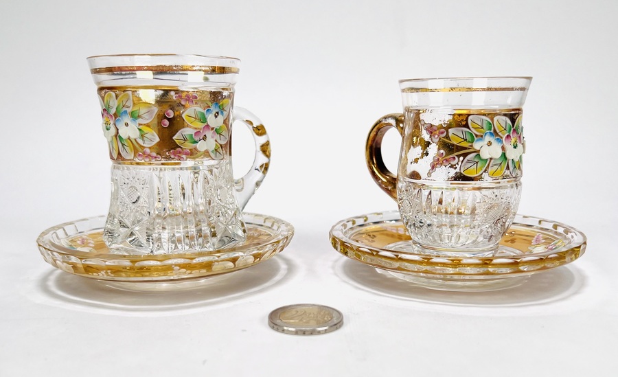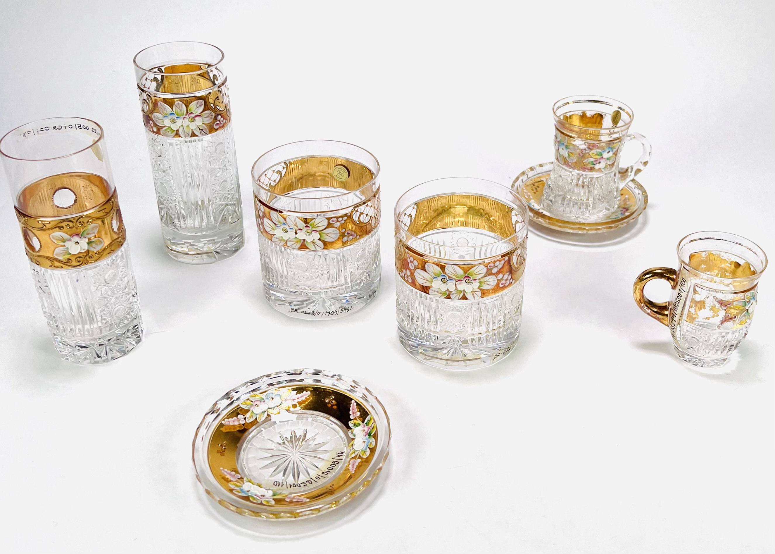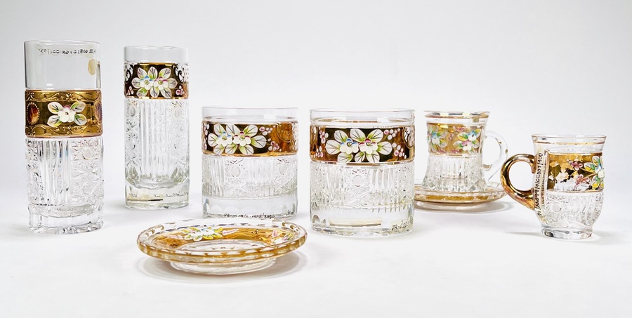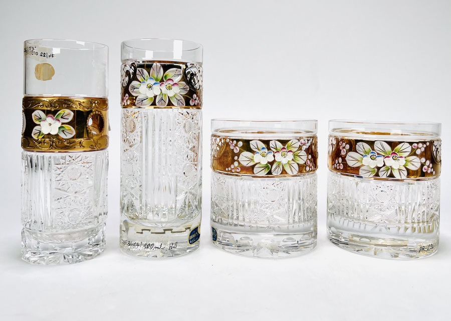 Convoluut Boheemse kristal met geslepen decor en voorzien van een 8 karaat gouden band met emaille florale beschildering. Bestaande uit twee whisky glazen, twee longdrink glazen, twee glaasjes en twee schoteltjes. Handcut Czech Republic. Eind 20e eeuw. |