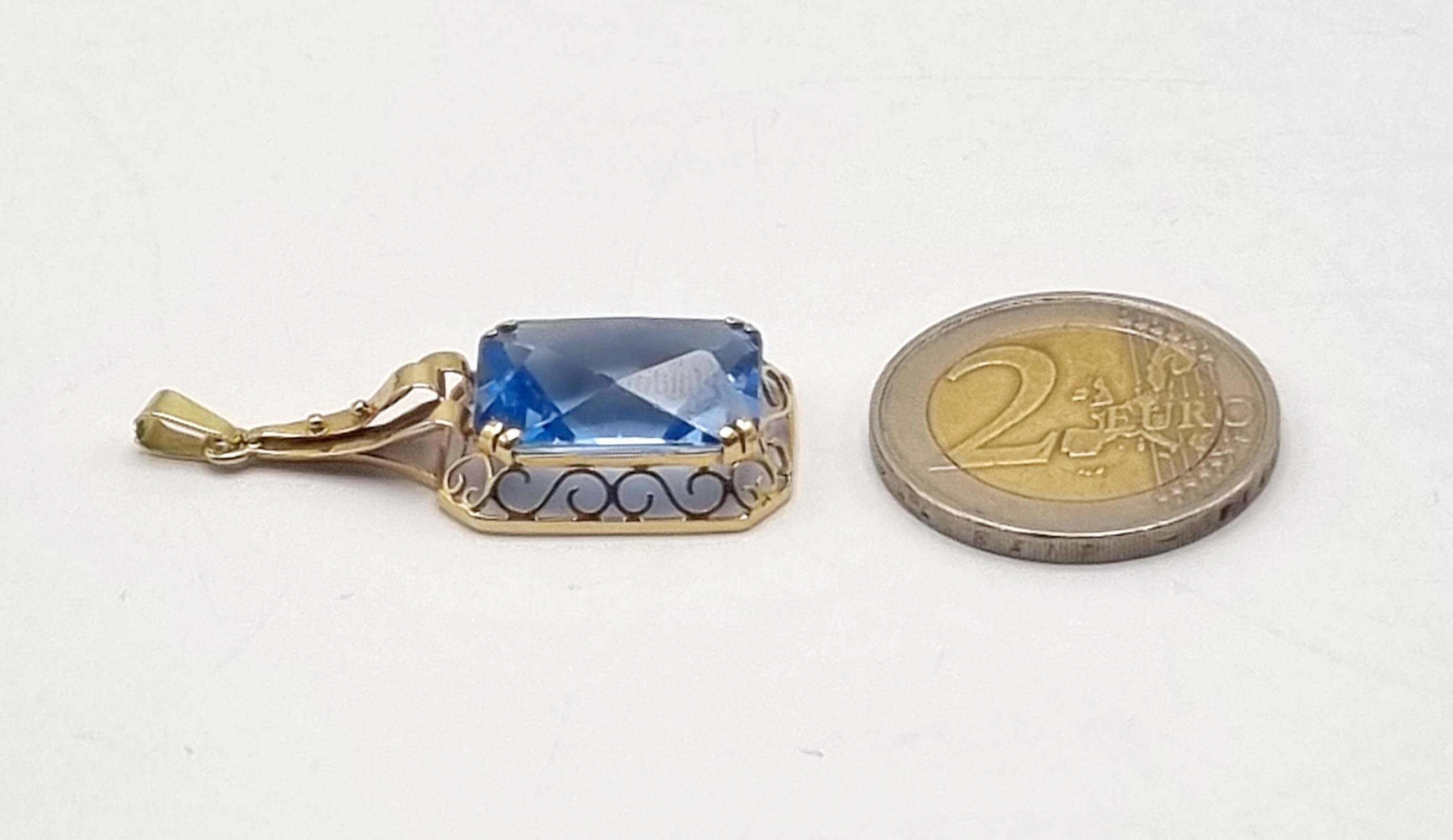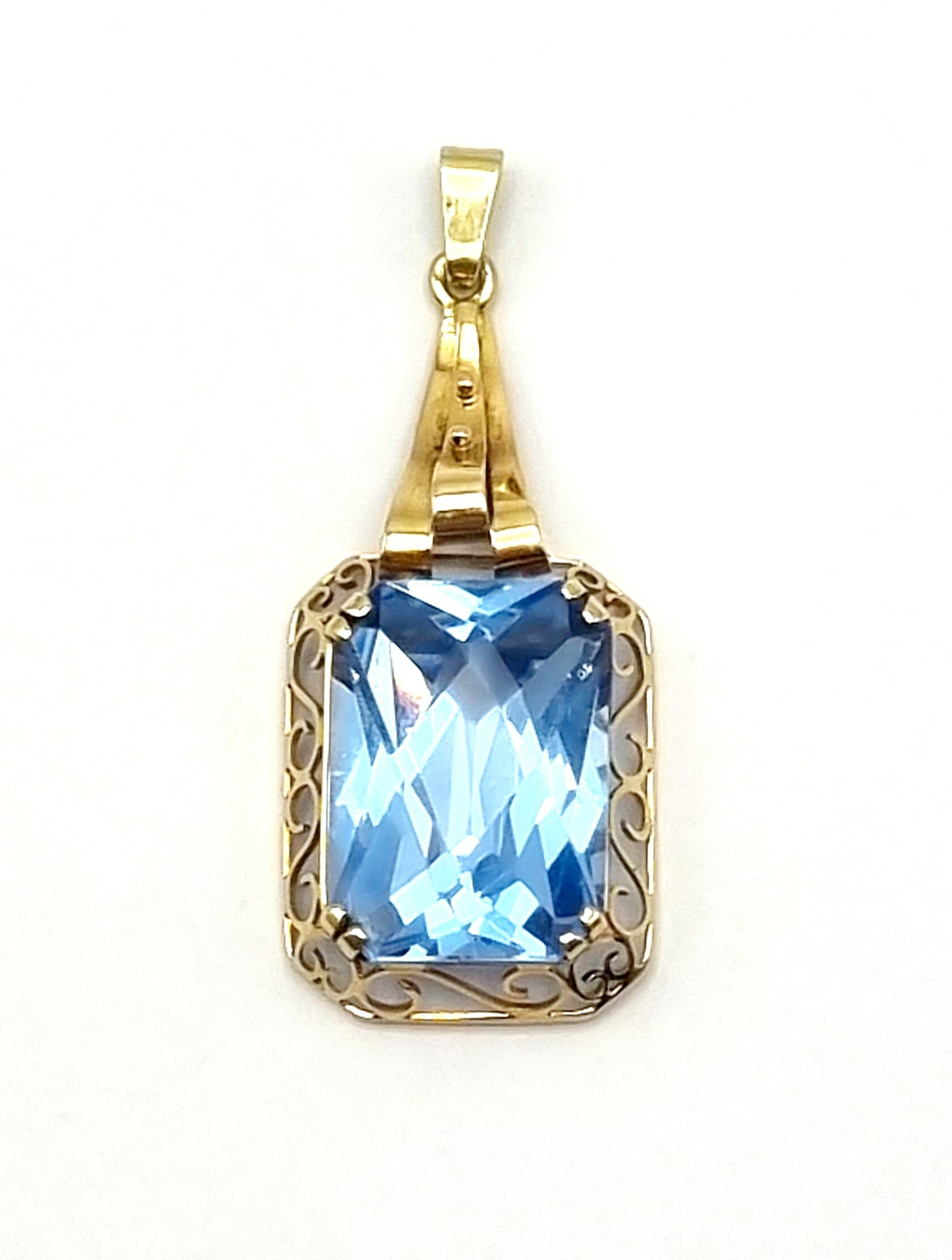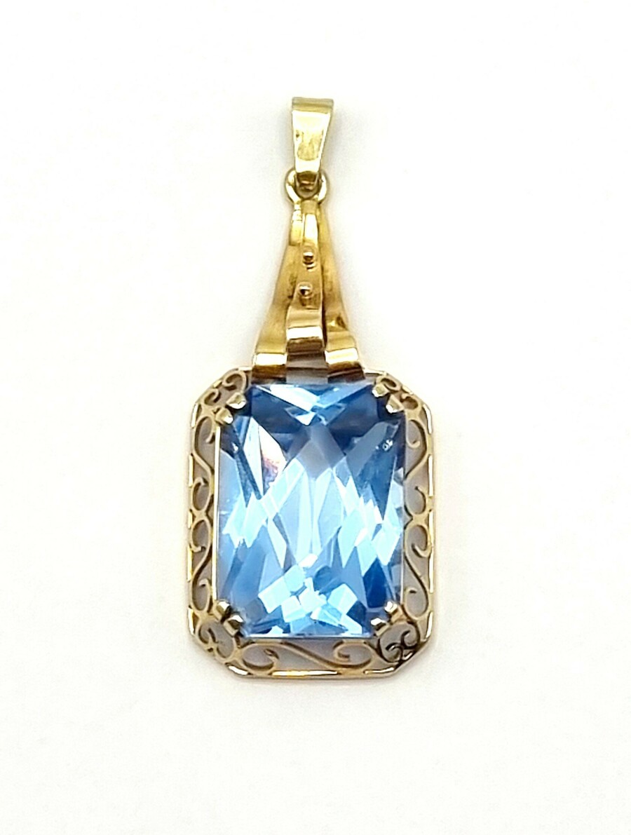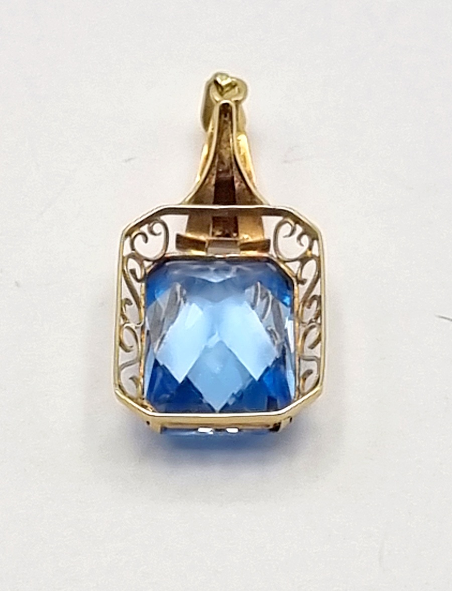 14 karaat gouden hanger met blauwe spinel steen. Hanger gekeurd met 585, derde kwart 20e eeuw. |