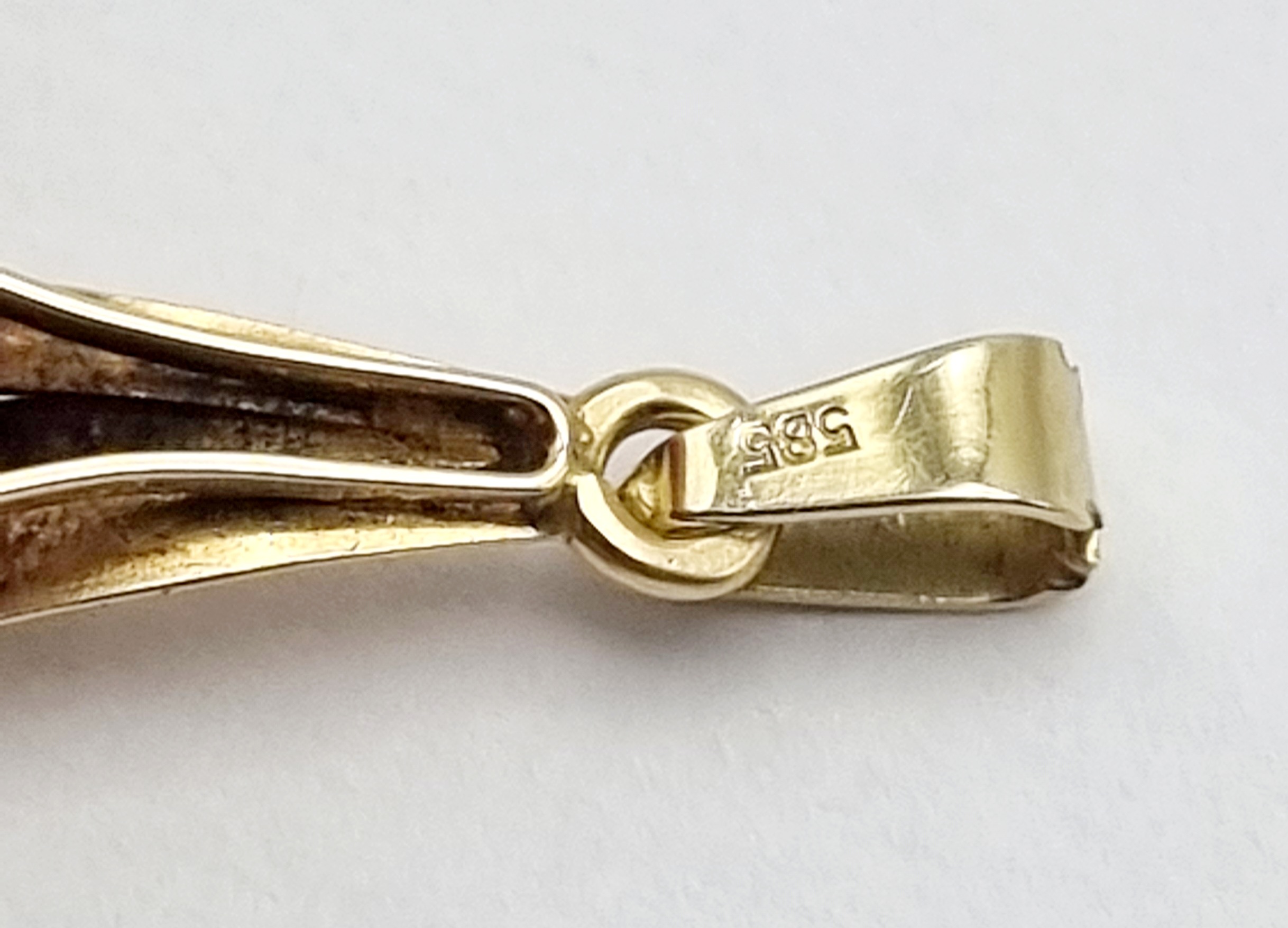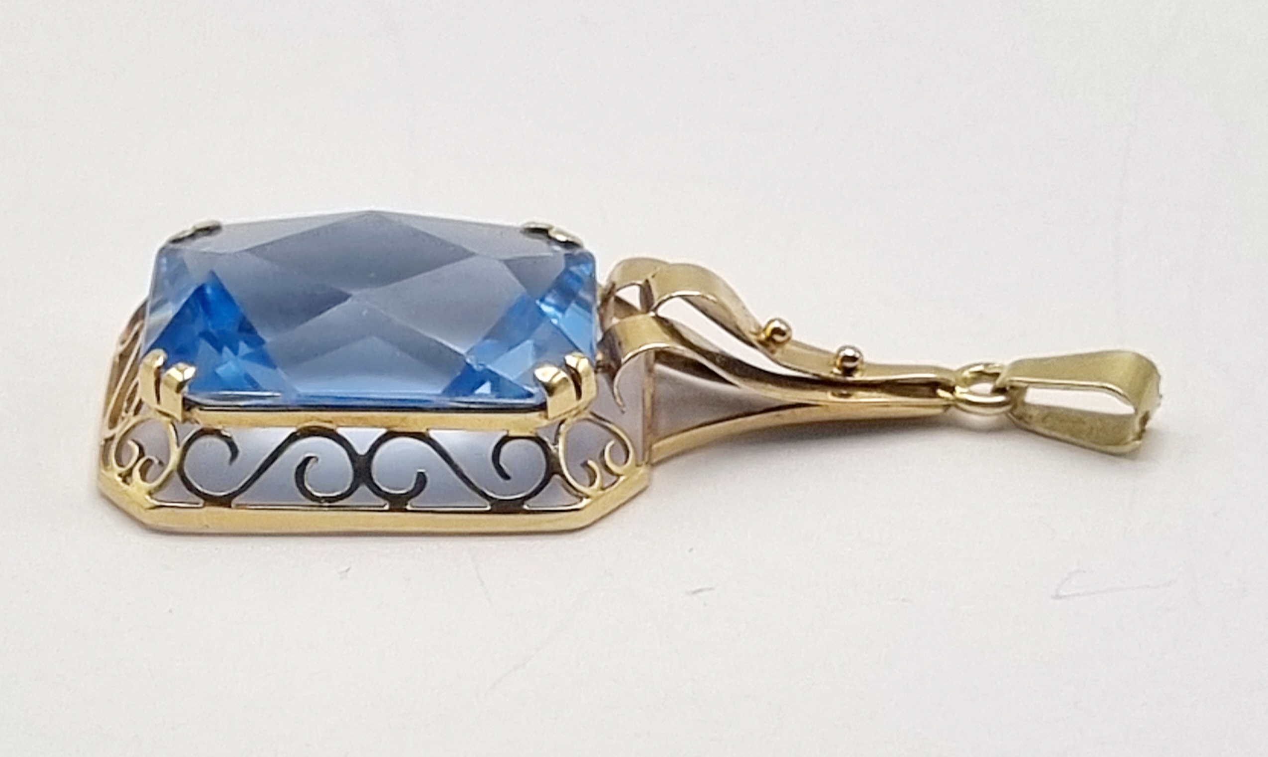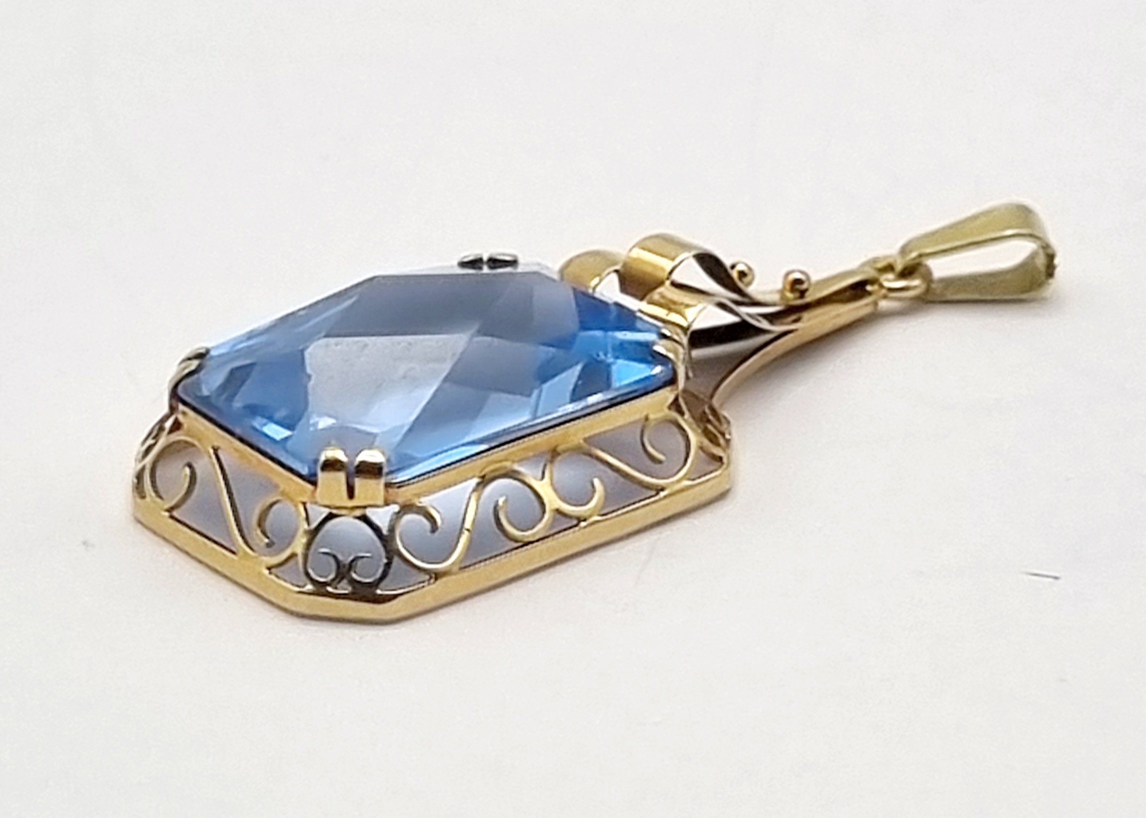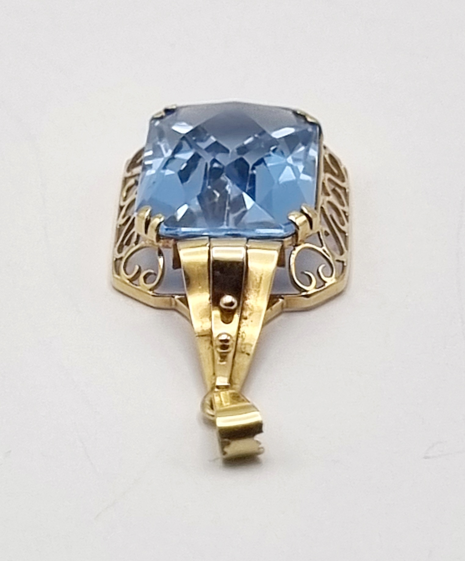 14 karaat gouden hanger met blauwe spinel steen. Hanger gekeurd met 585, derde kwart 20e eeuw. |