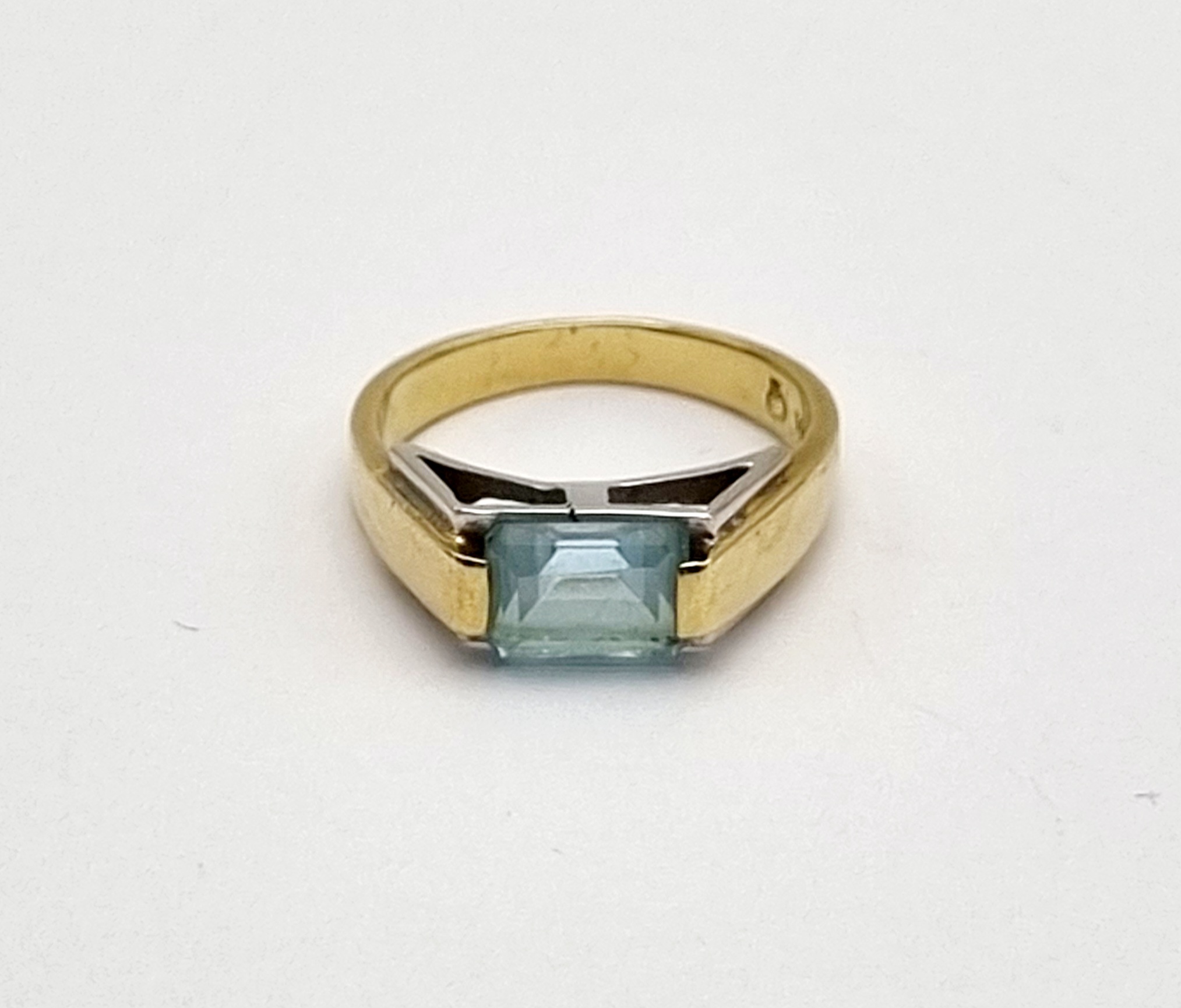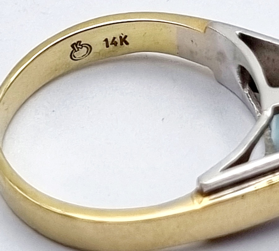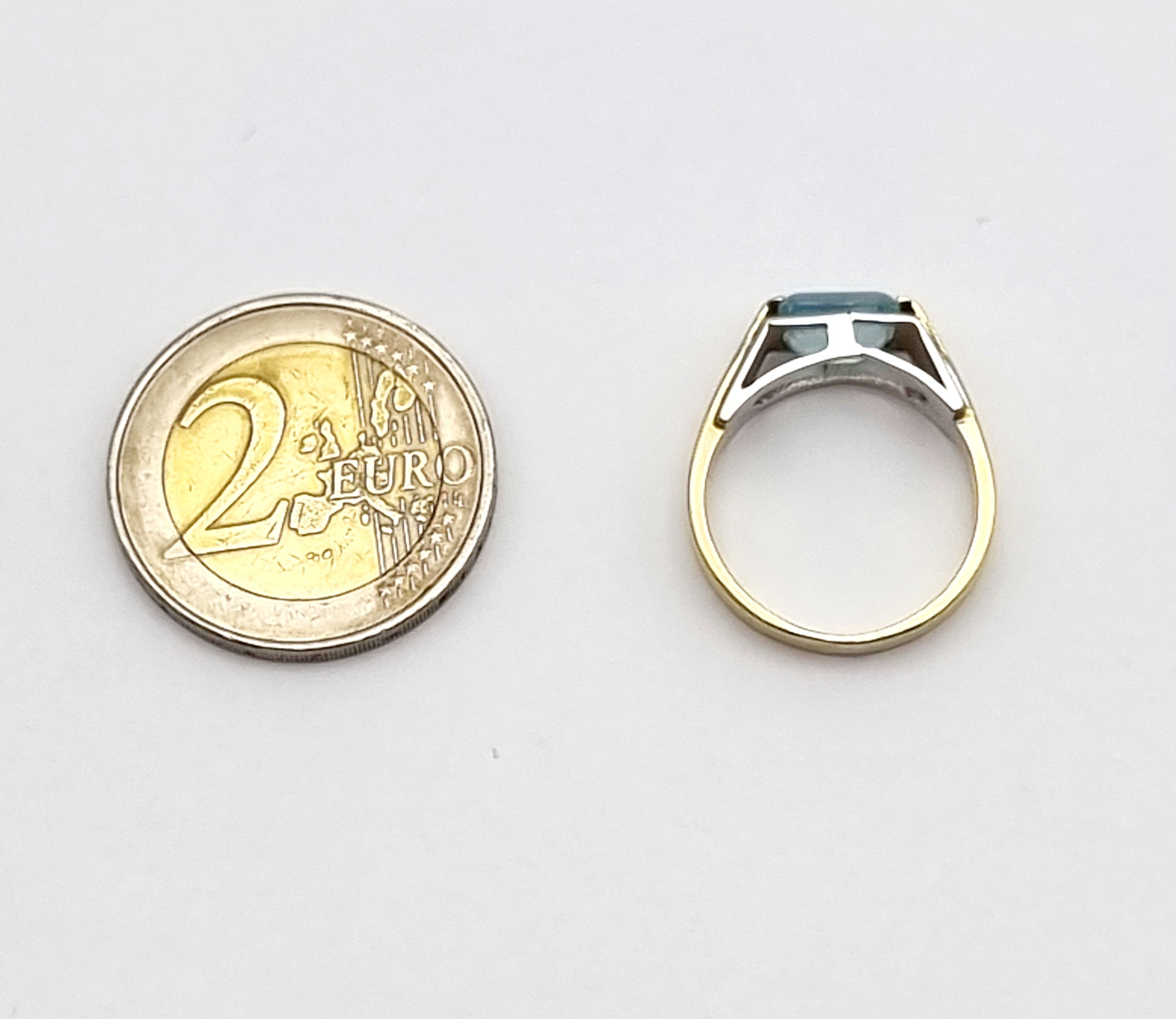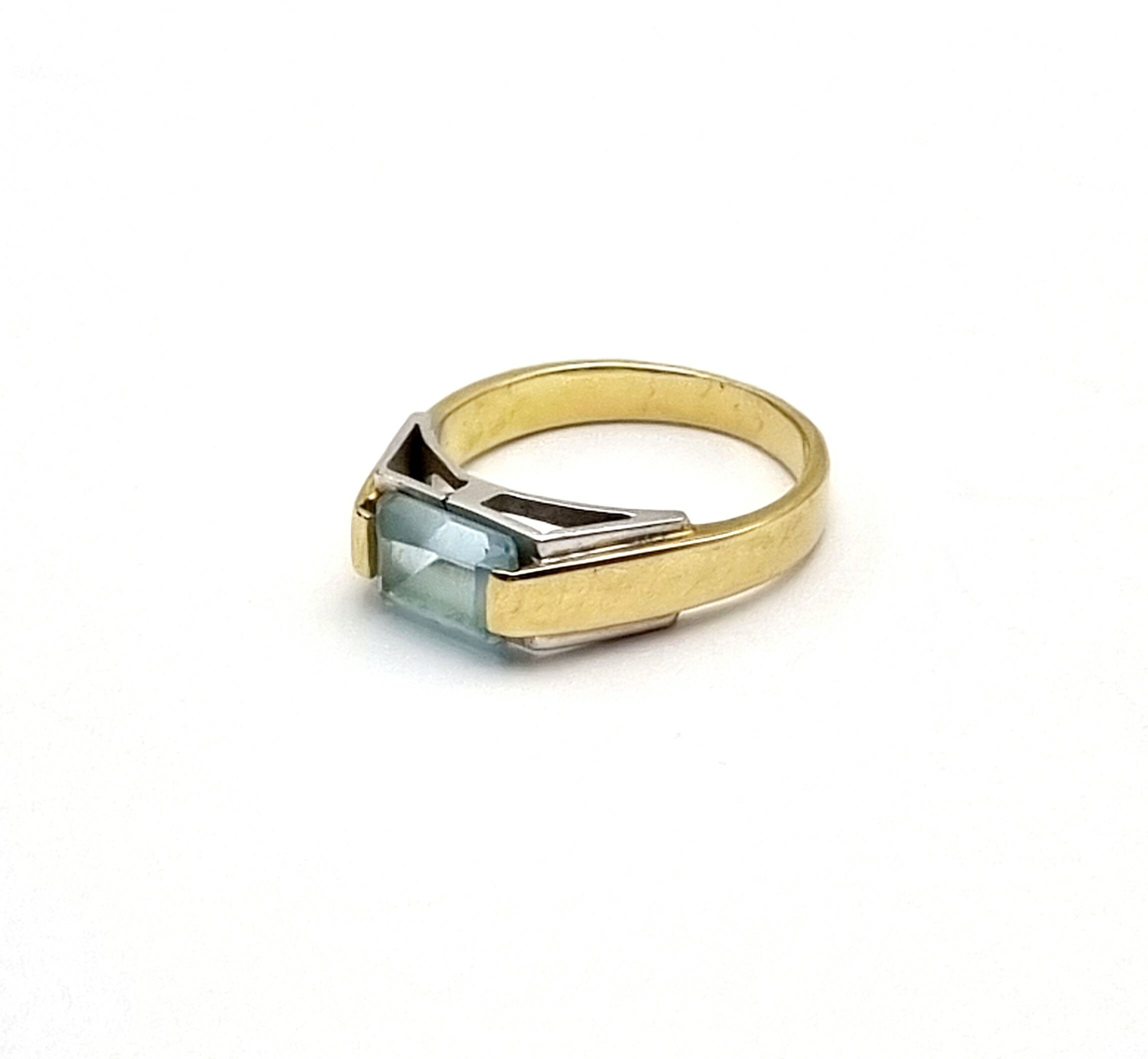 14 karaat gouden ring met aquamarijn edelsteen. Gekeurd binnenzijde ring 14K en meesterkeur. |