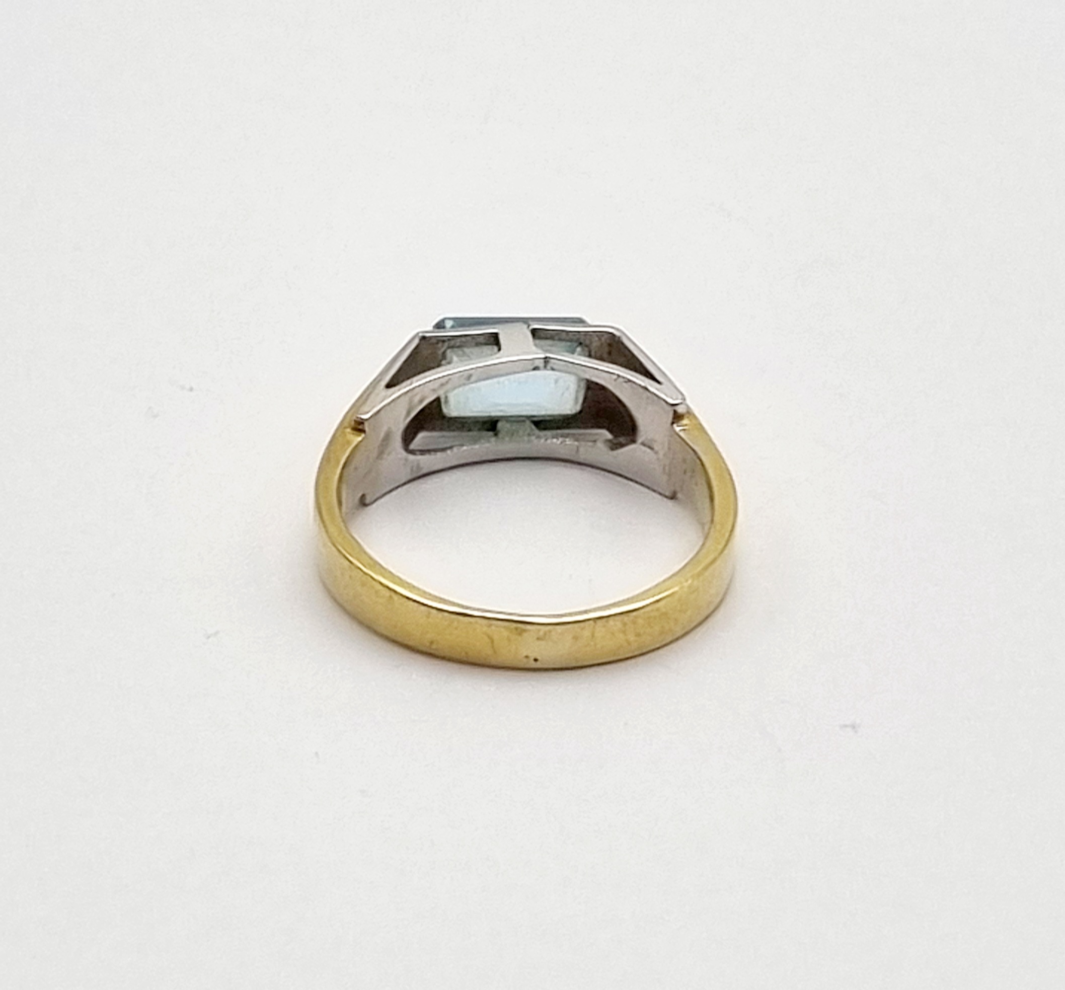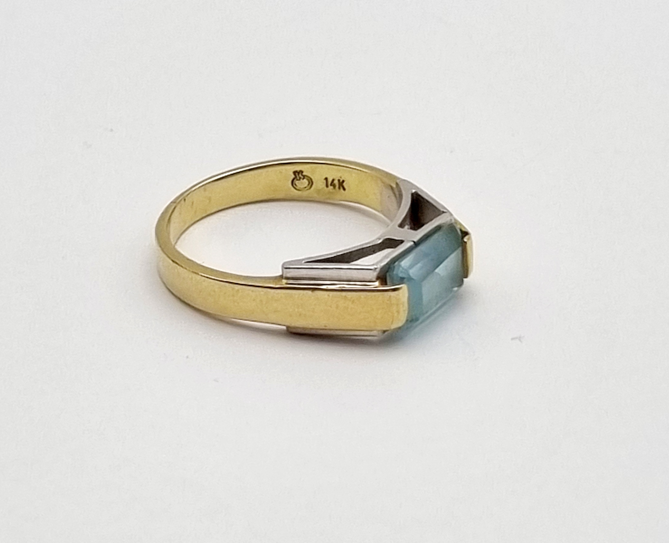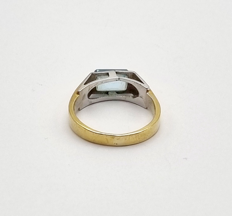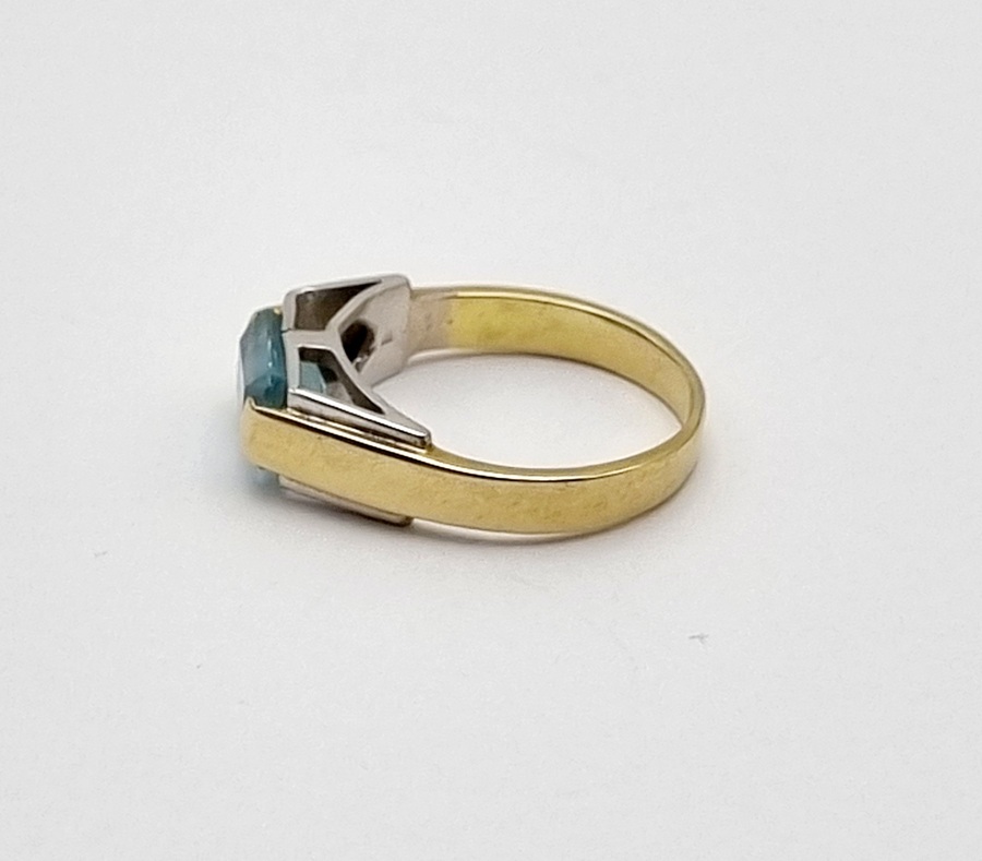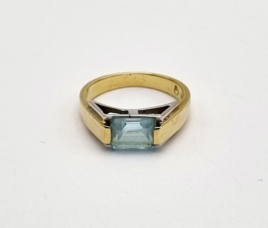 14 karaat gouden ring met aquamarijn edelsteen. Gekeurd binnenzijde ring 14K en meesterkeur. |