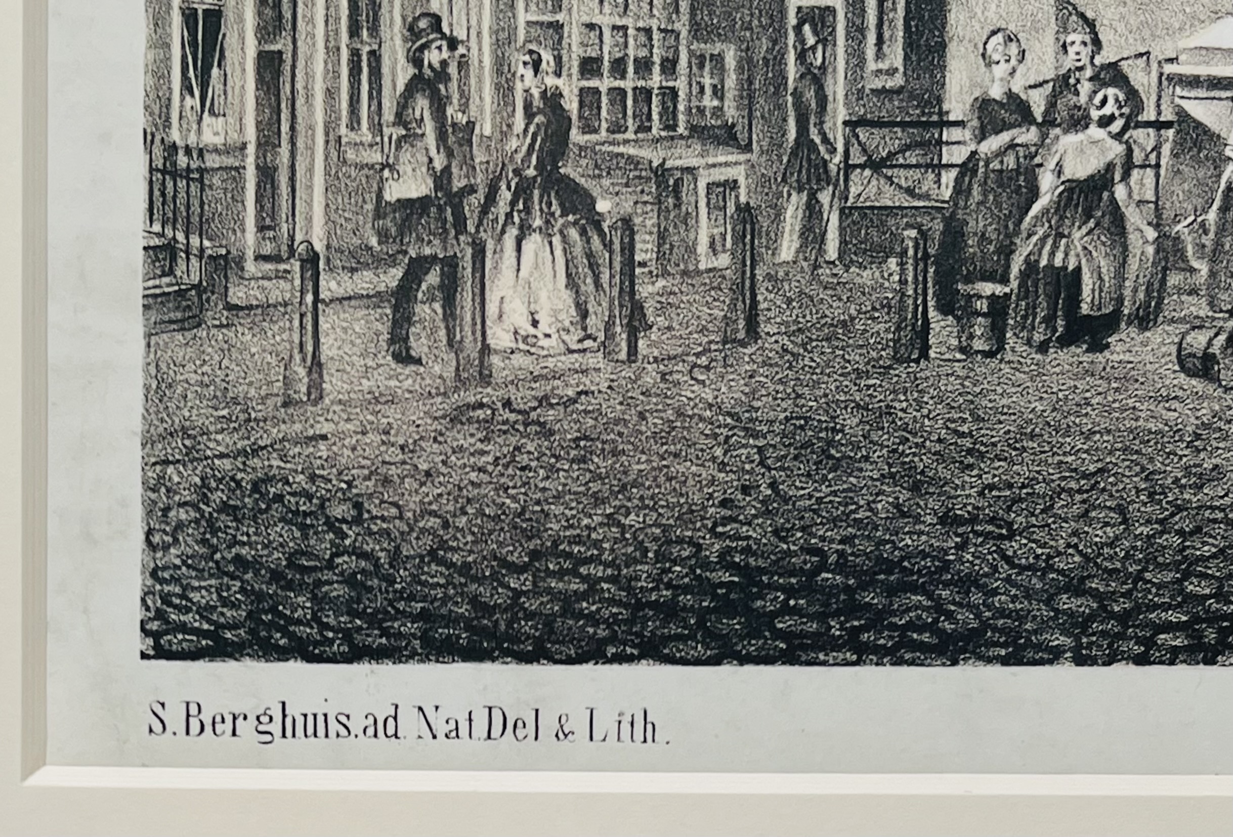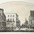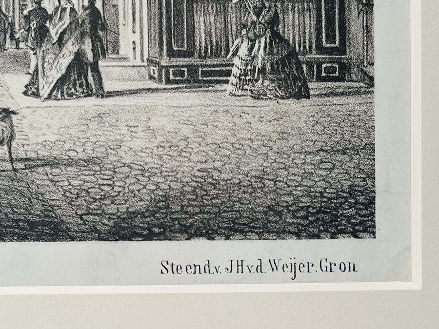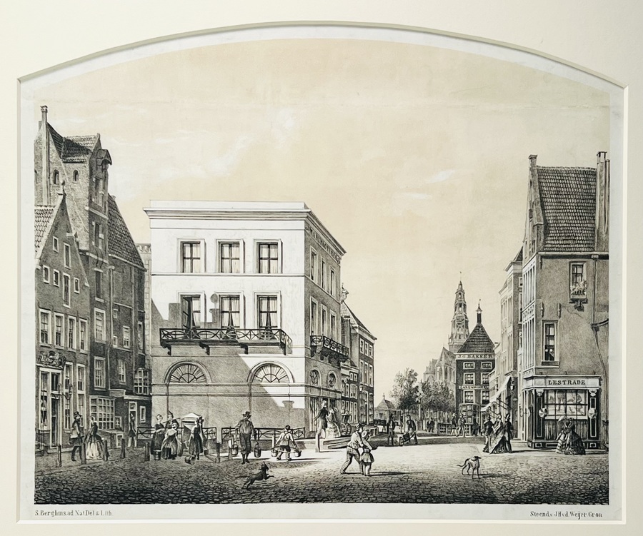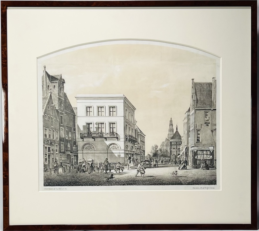 Reproductie van een steendruk van Groningen vanaf de Grote Markt richting de Vismarkt omstreeks 1840 getiteld “Tusschen de beide Markten”. Naar een tekening van Sybolt Berghuis, lithografie oorspronkelijk uitgevoerd door Steendrukkerij J.H. v. d Weijer, Groningen, omstreeks 1860. Deze uitvoering eind 20e eeuw. |