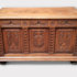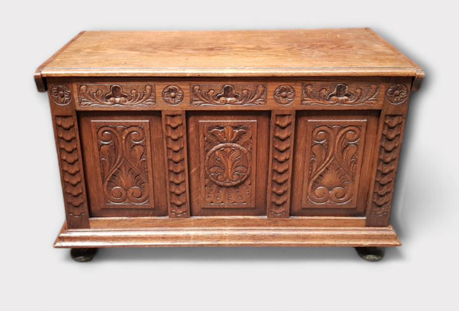 Eikenhouten kist met florale houtsnijwerk in de frontpanelen, omstreeks 1900. |