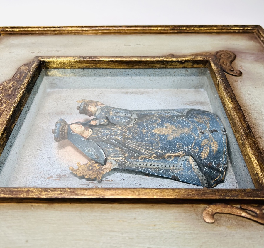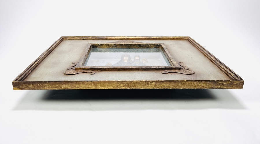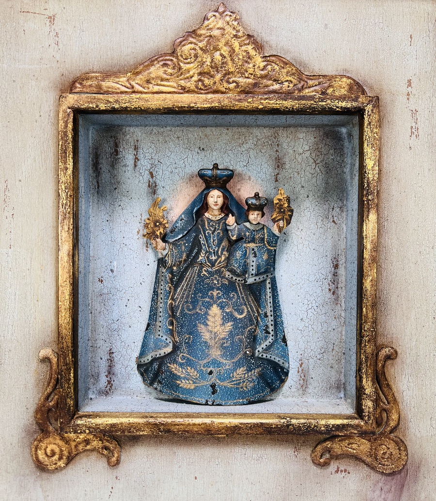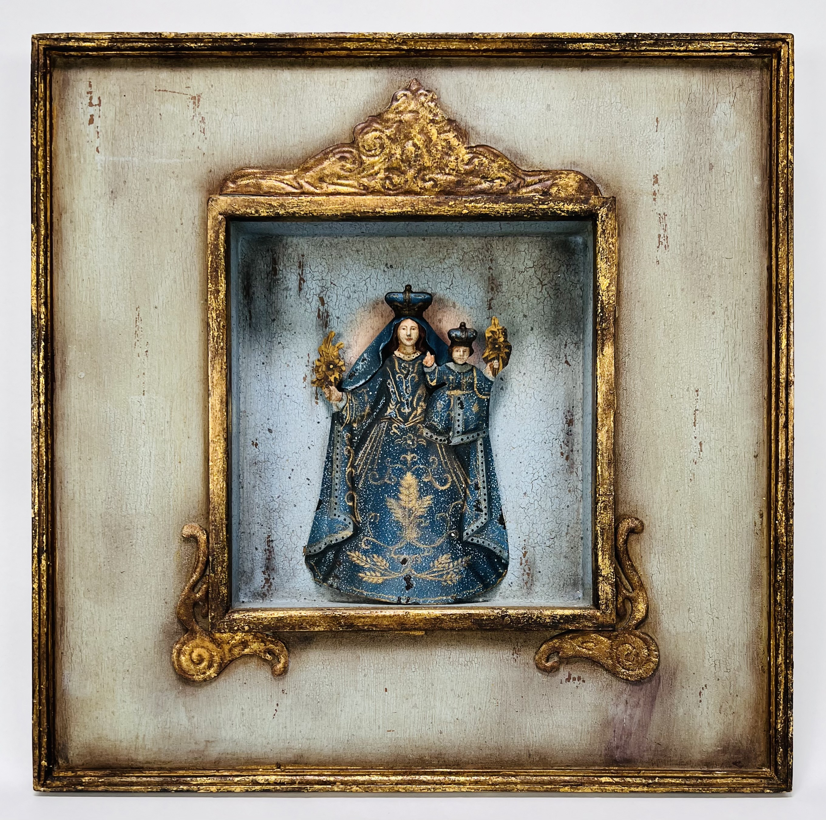 Metalen blauw beschilderde Madonna met kind in lijst uit de collectie van Flowerfeldt, 21e eeuw. |