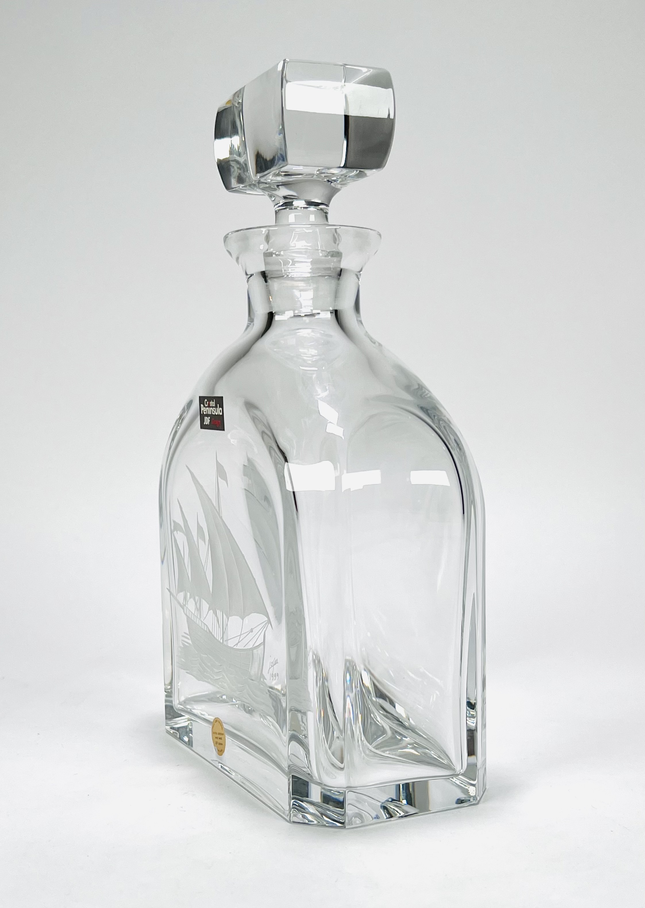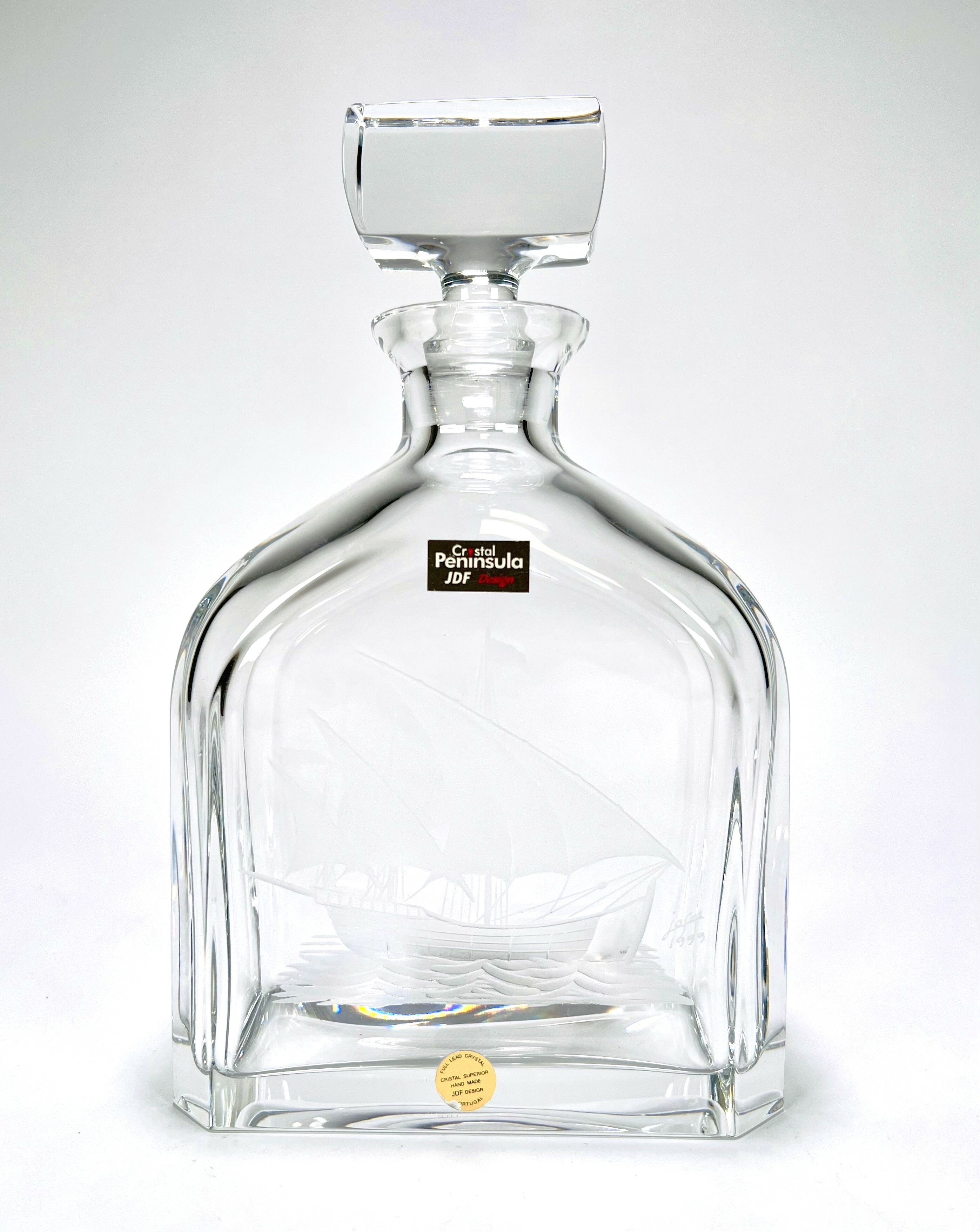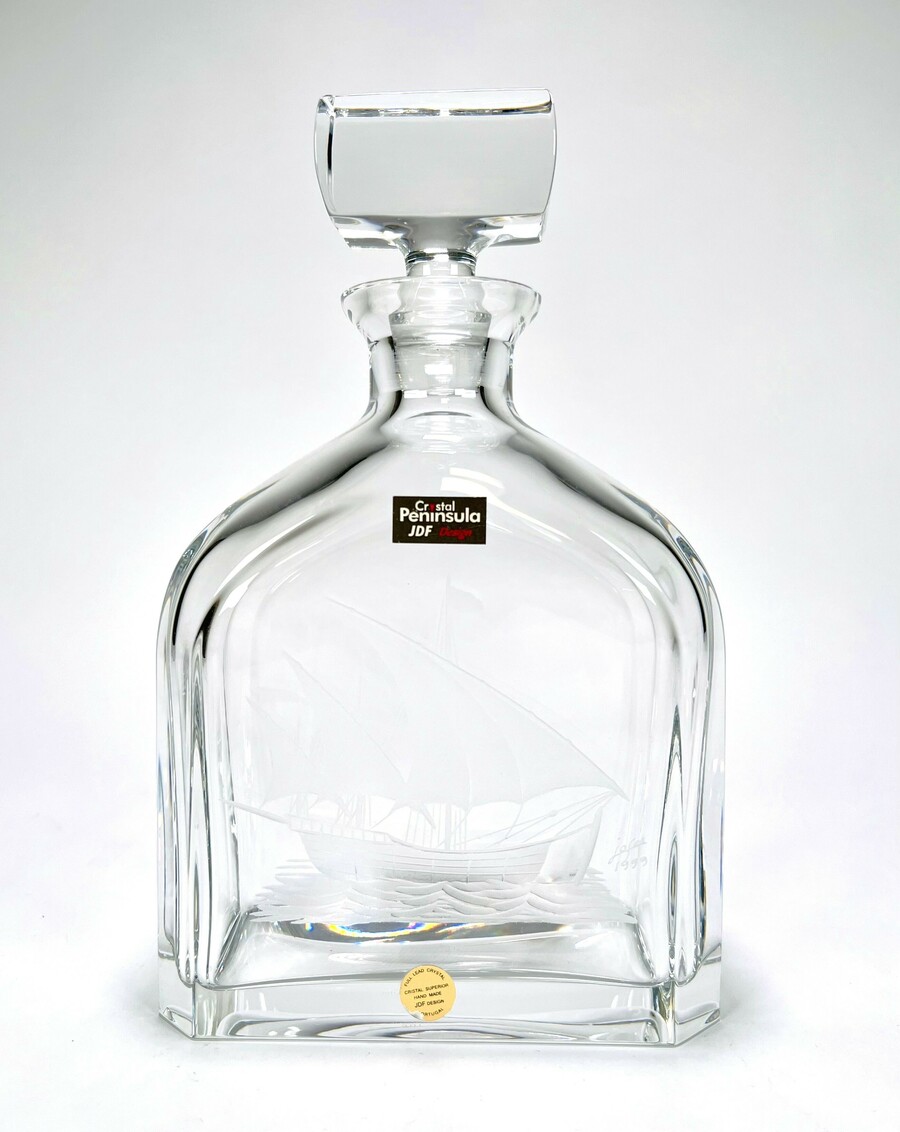 Kristallen karaf Peninsula JDF Design, Portugal met gegraveerde Portugese zeilboot. Gemerkt met sticker en onderzijde geëtst Peninsula, gravering gesigneerd door de graveur en gedateerd 1999. |
