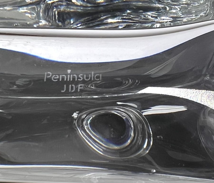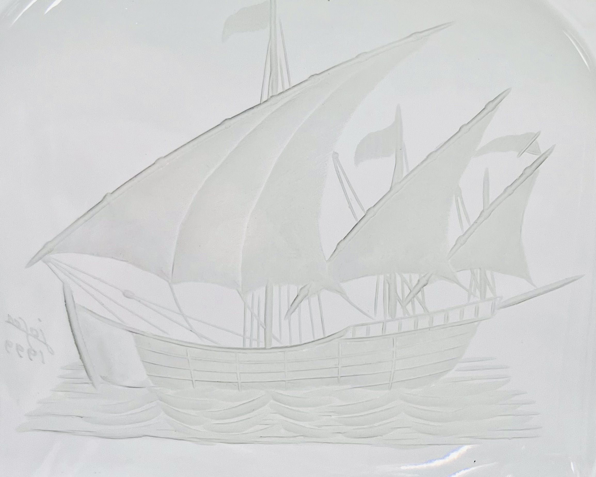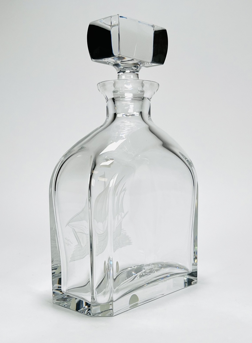 Kristallen karaf Peninsula JDF Design, Portugal met gegraveerde Portugese zeilboot. Gemerkt met sticker en onderzijde geëtst Peninsula, gravering gesigneerd door de graveur en gedateerd 1999. |