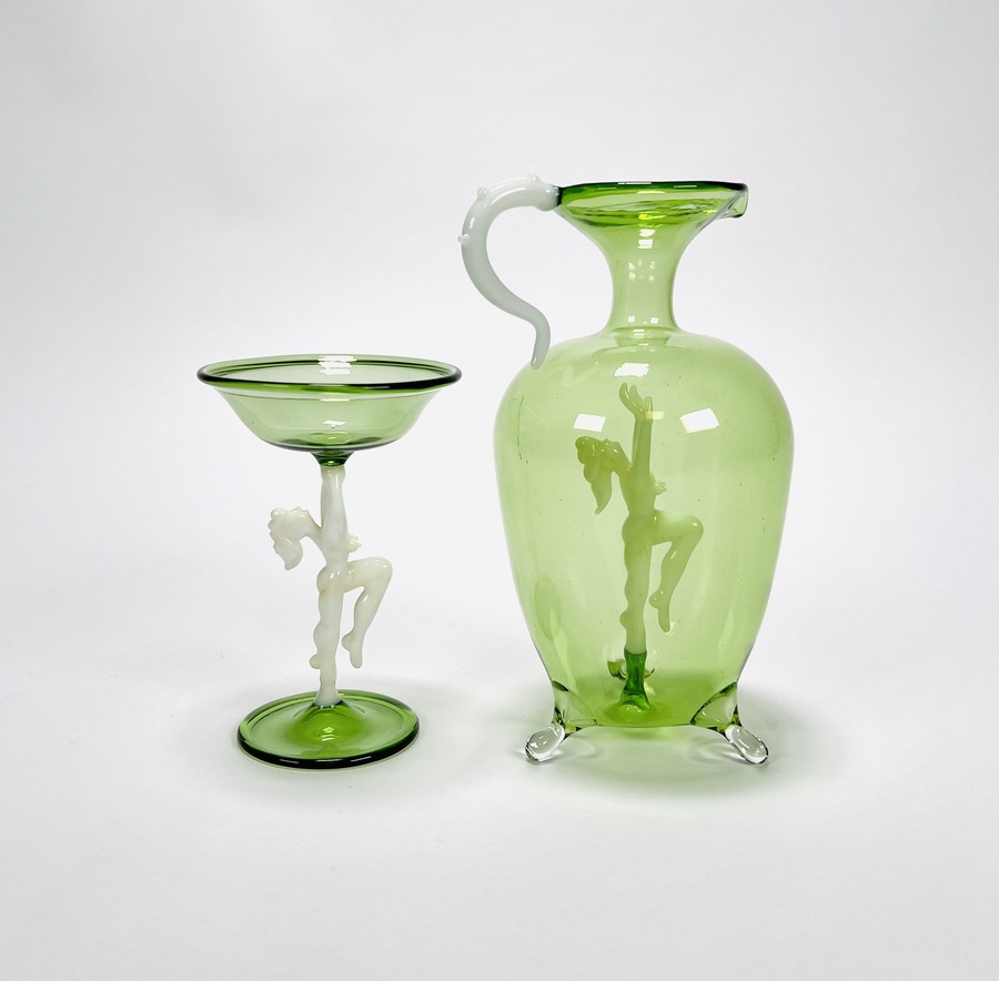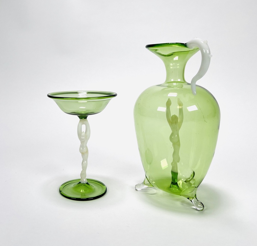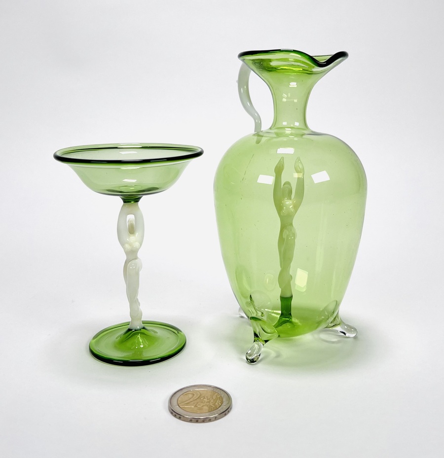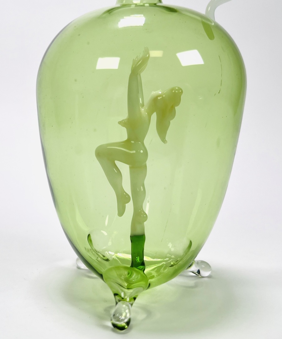 Groene glazen karaf met likeurglaasje voorzien van melkglazen dansend naakt door Bimini Laucha. Duitsland, jaren 30. |