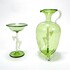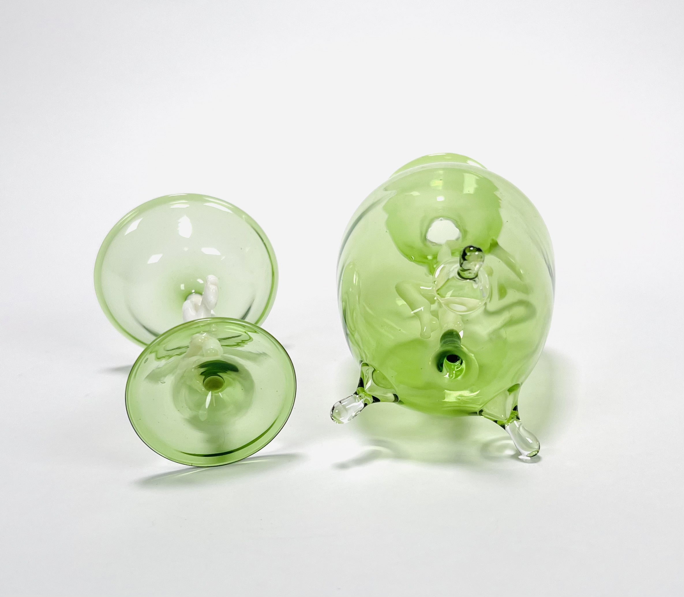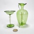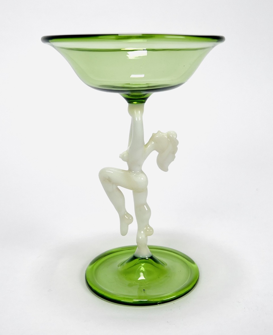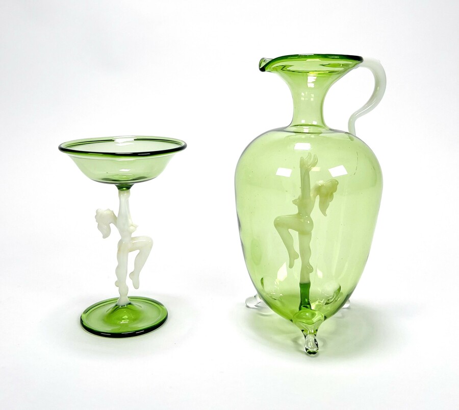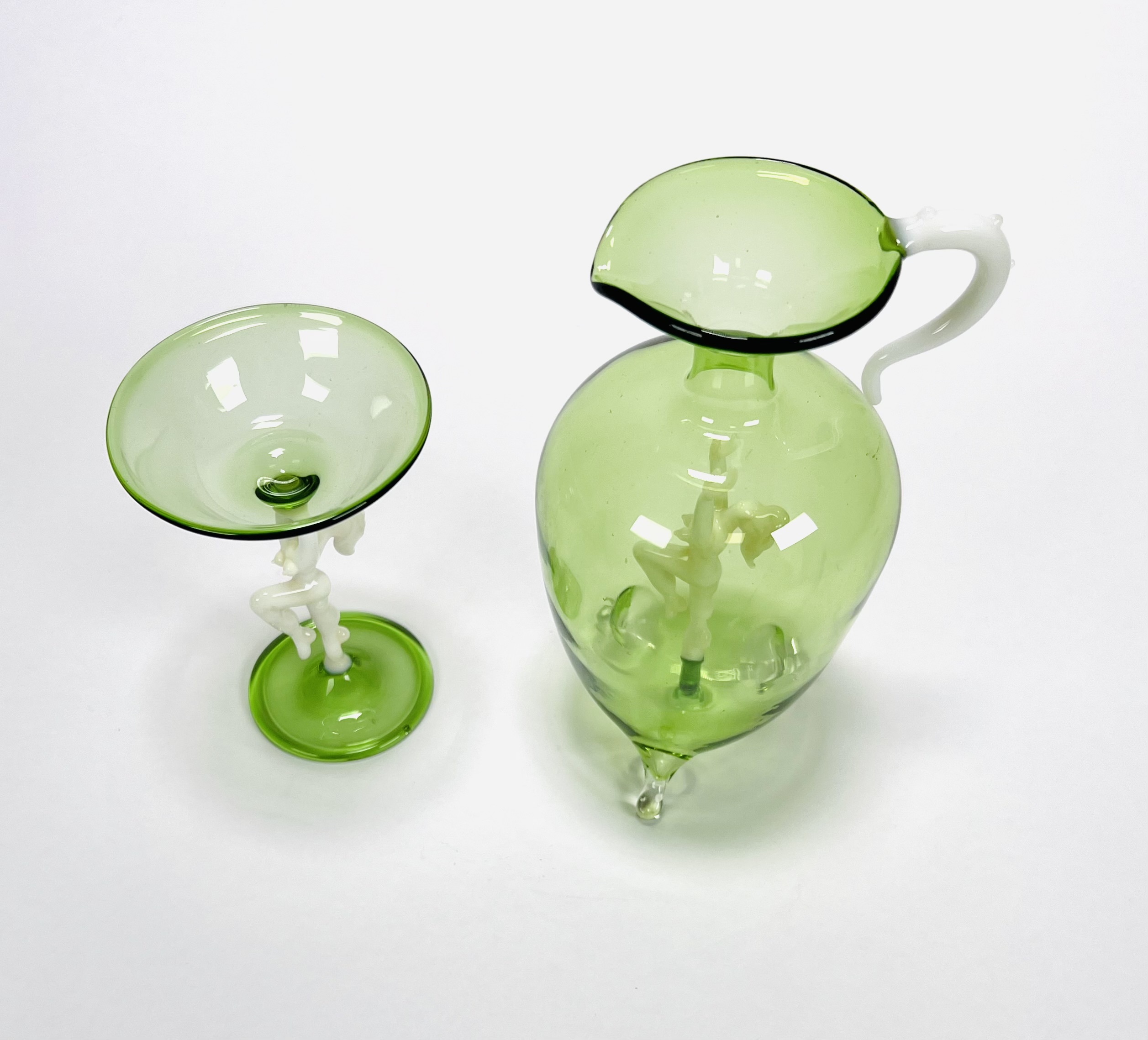 Groene glazen karaf met likeurglaasje voorzien van melkglazen dansend naakt door Bimini Laucha. Duitsland, jaren 30. |