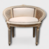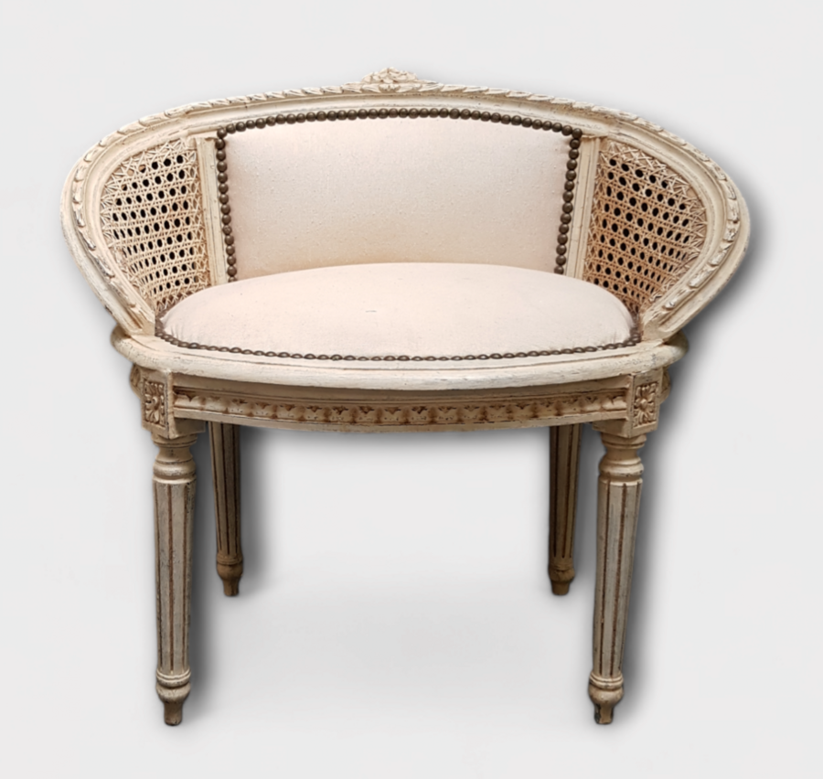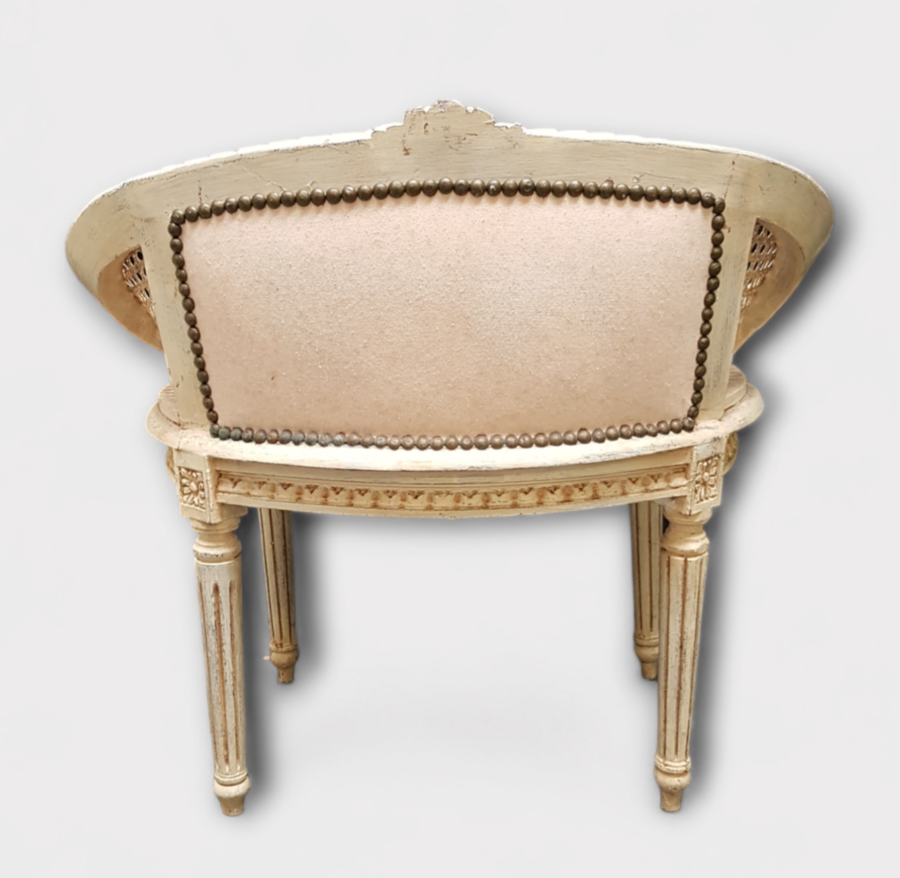 Houten kinderbank in Franse stijl met crèmekleurige bekleding en webbing leuning. 20e eeuw. |