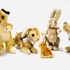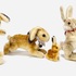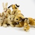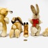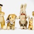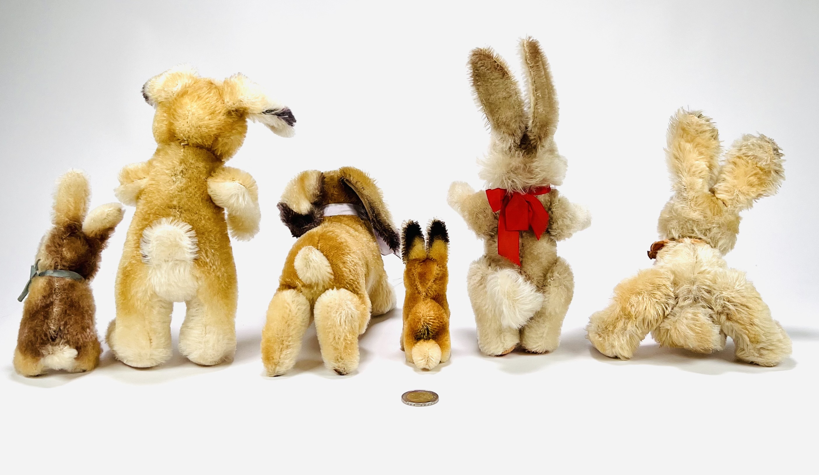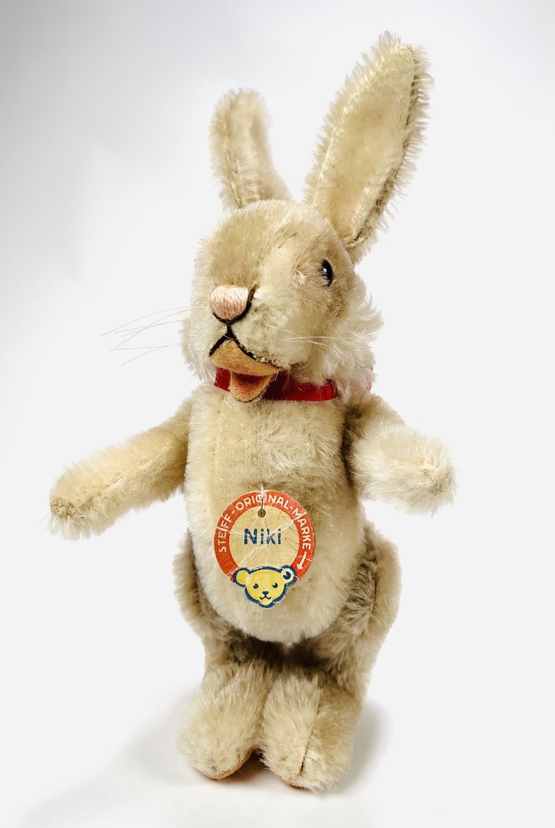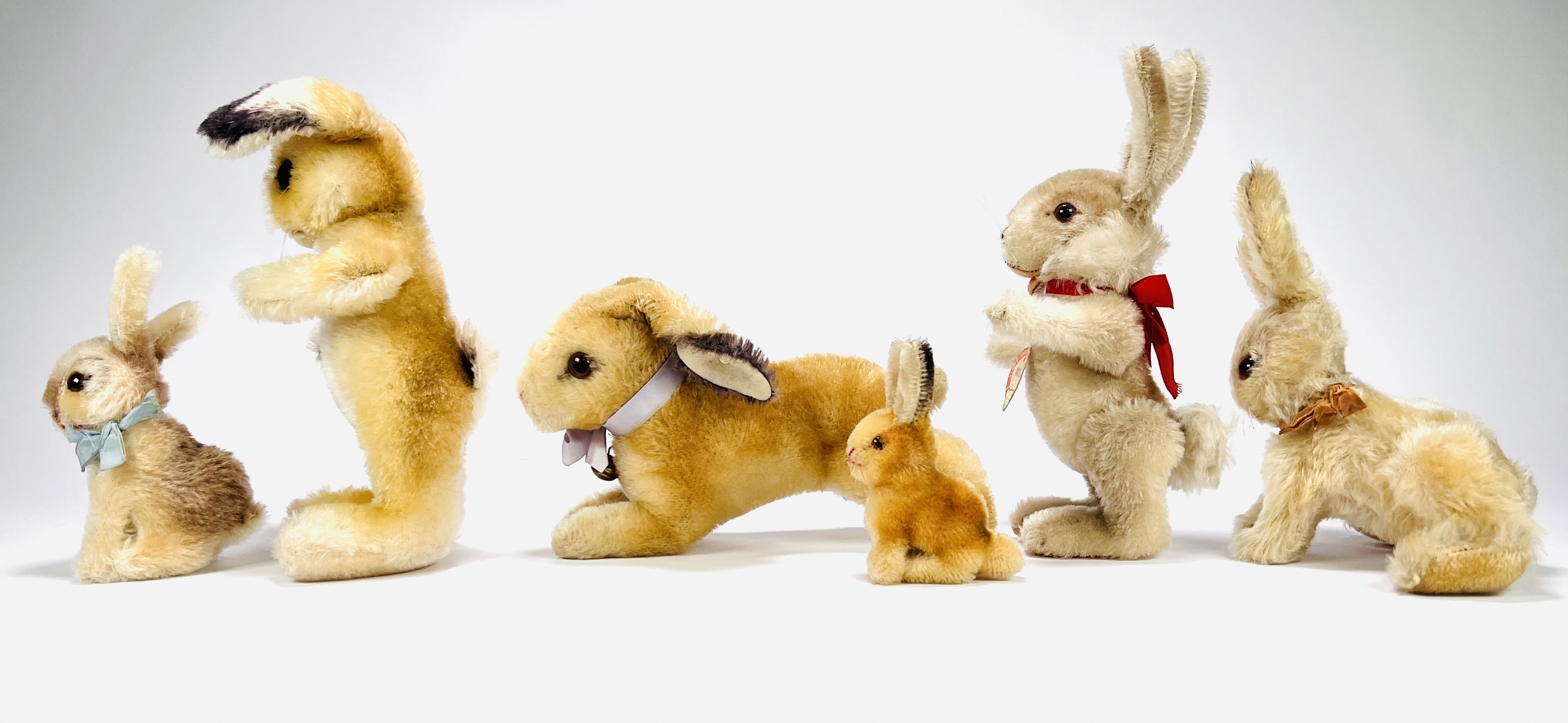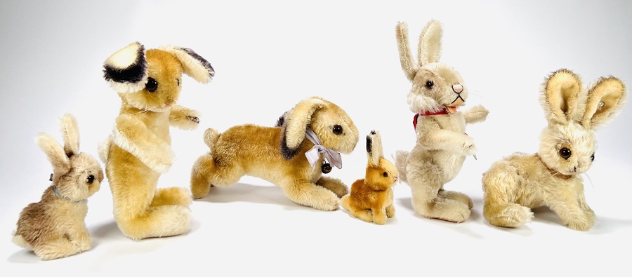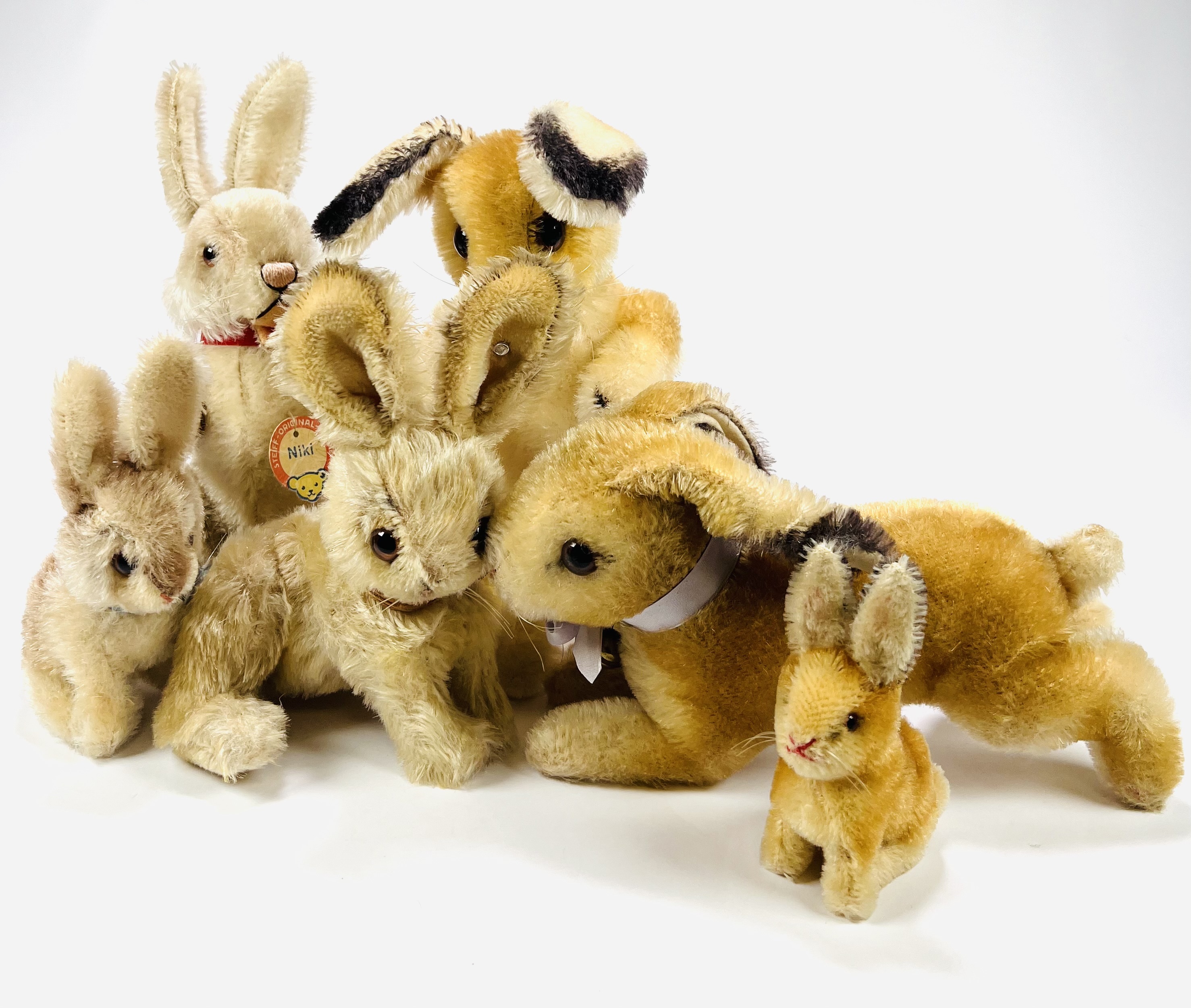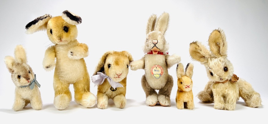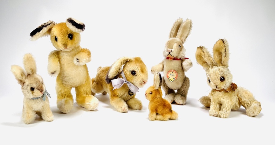 Zes pluche hazen van Steiff, meerdere dieren voorzien van Knopf in het oor en één haas voorzien van het originele papieren label met naamsvermelding Niki. Gefabriceerd in Duitsland, jaren 60-80. |