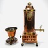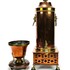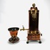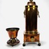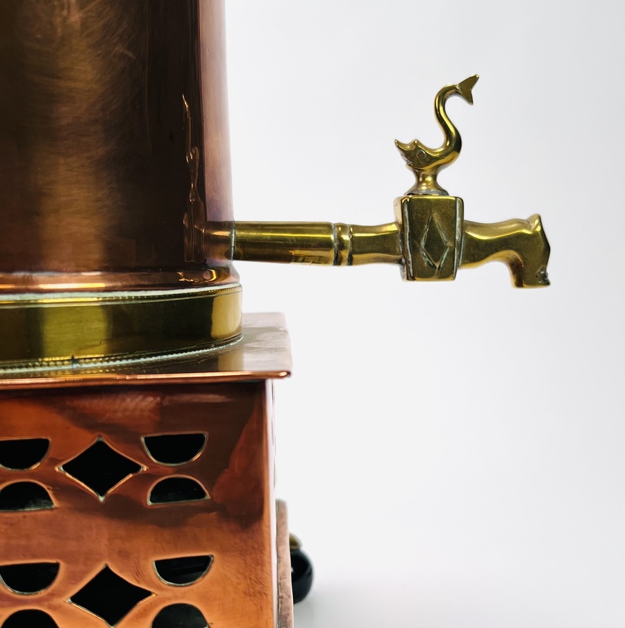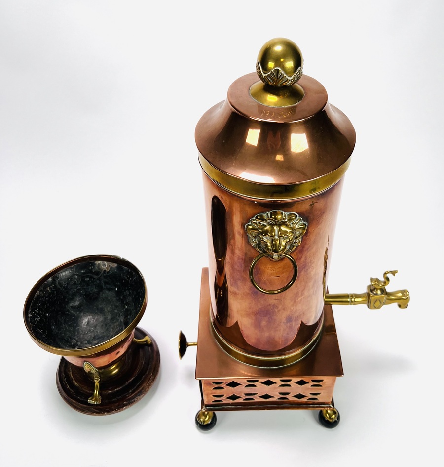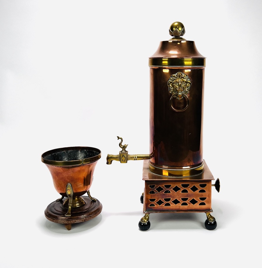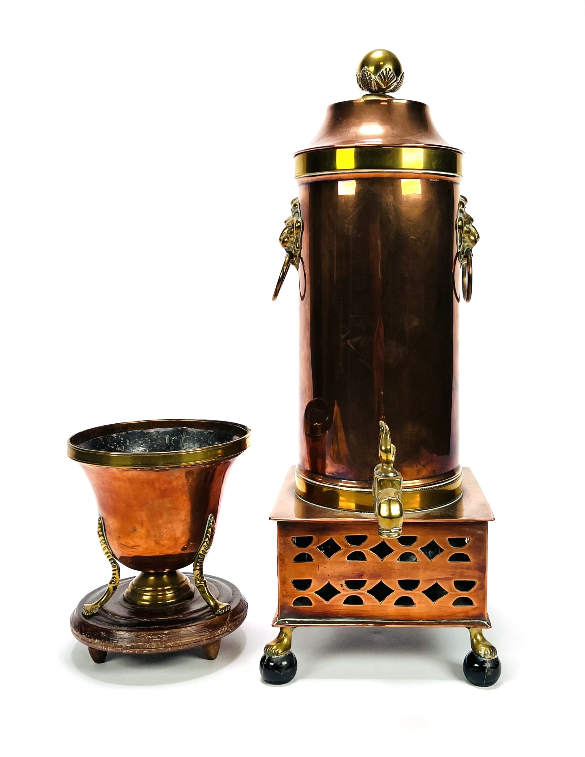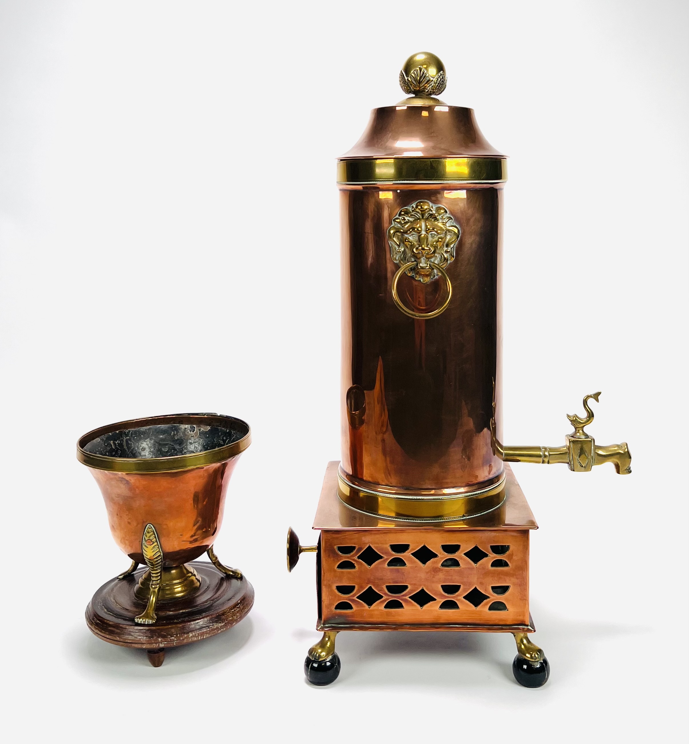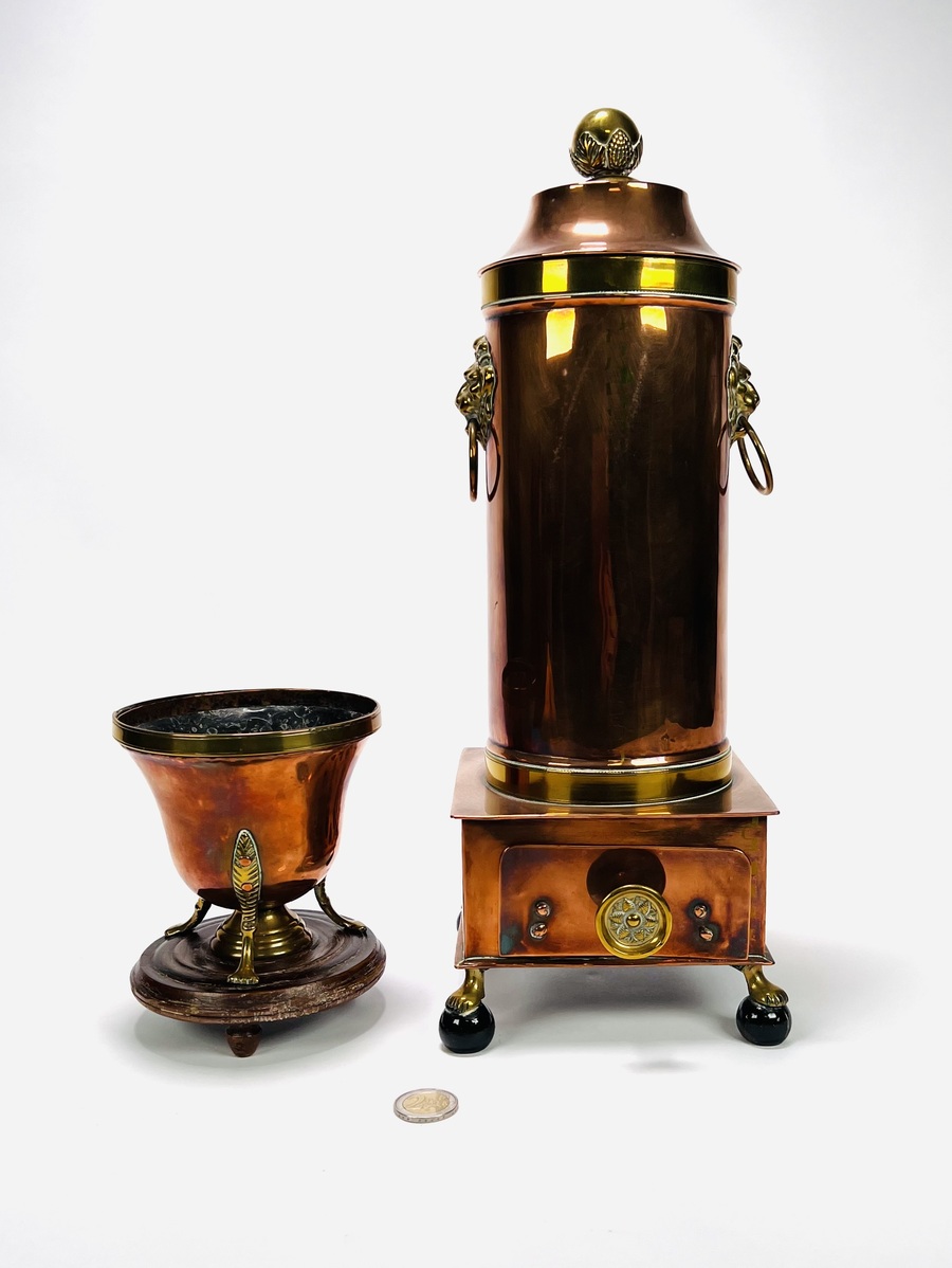Koperen kraantjespot met flankerend messing leeuwenkoppen, ring en kolenslede, geheel op bolpootjes met leeuwenklauwen. Tevens een koperen pijpkomfoor met messing elementen op houten basis. 19e eeuw. |
