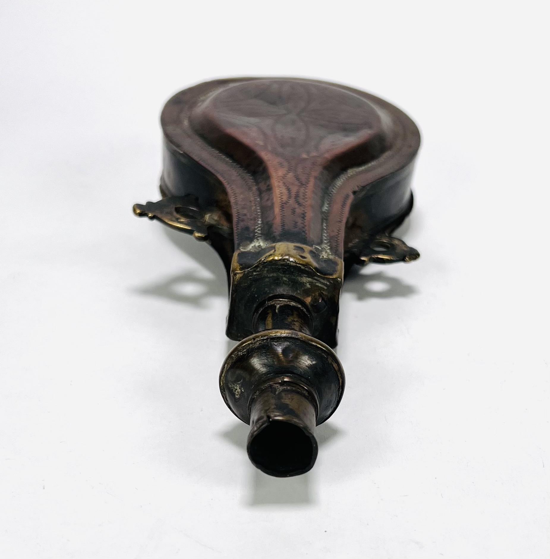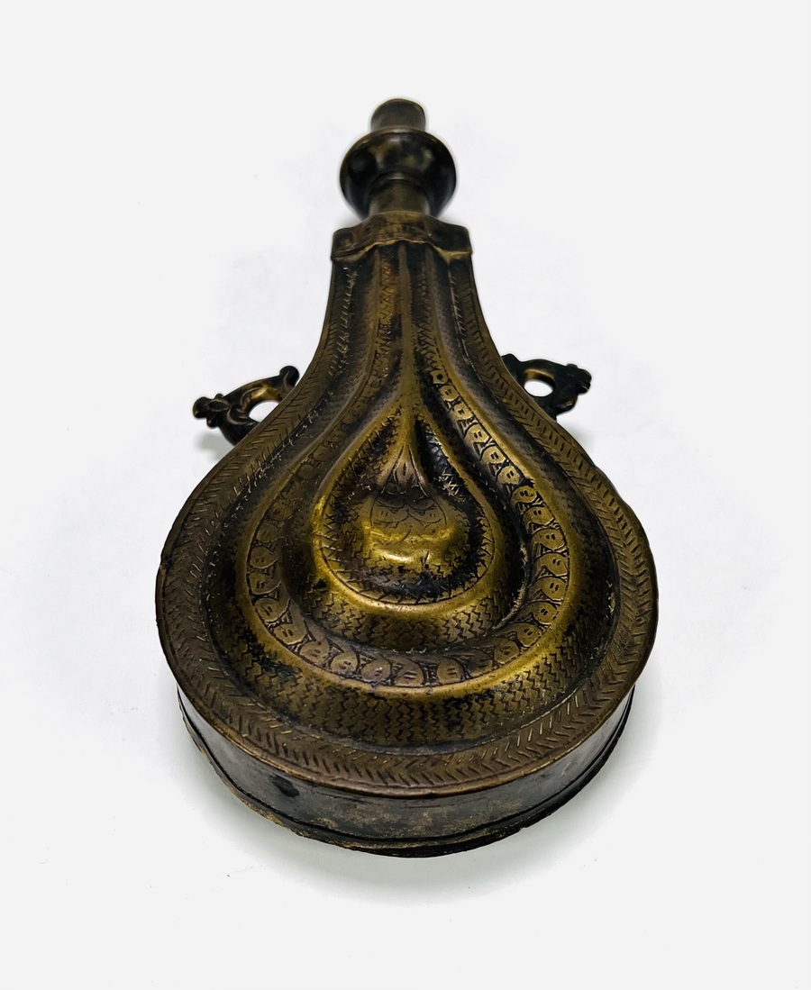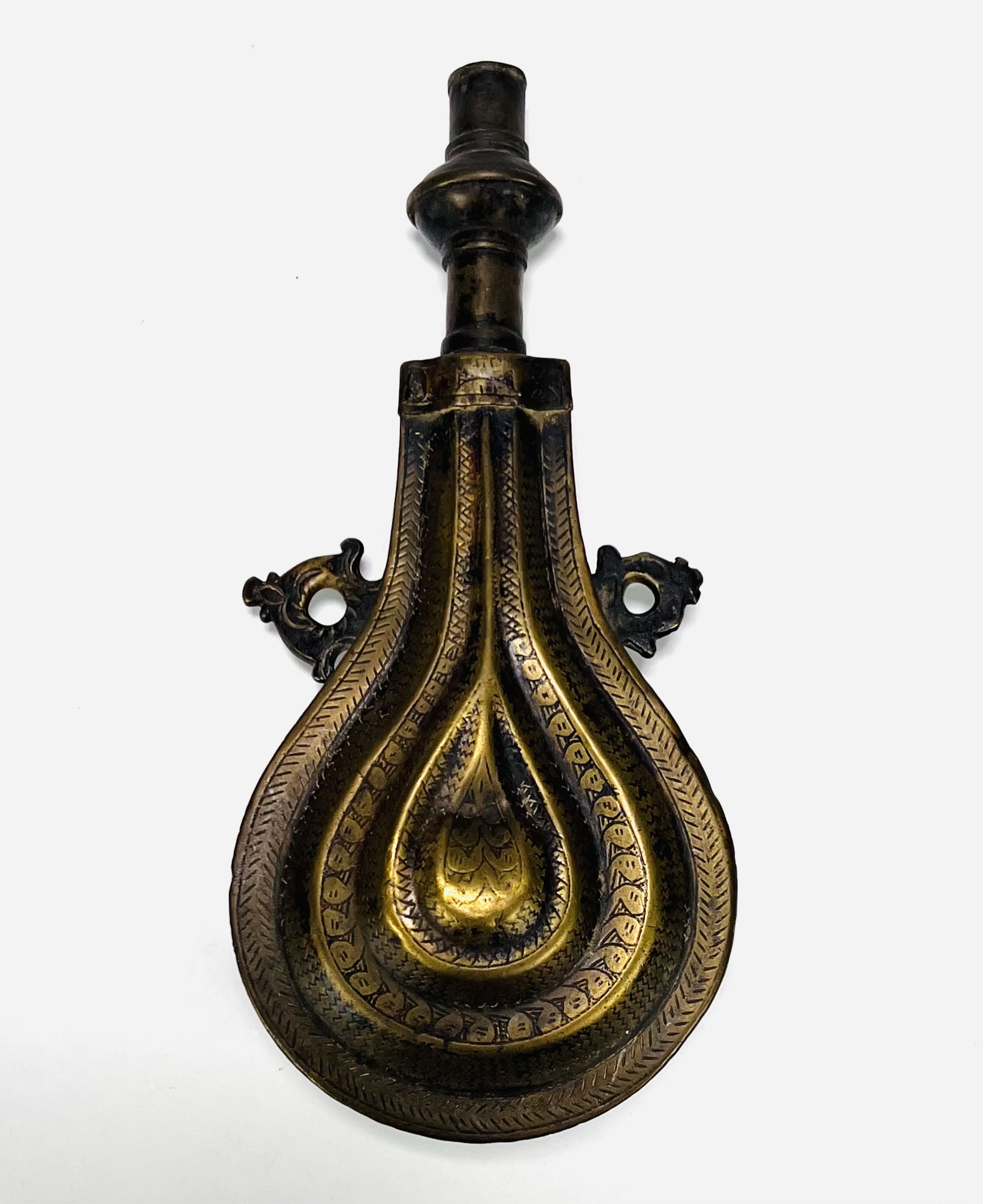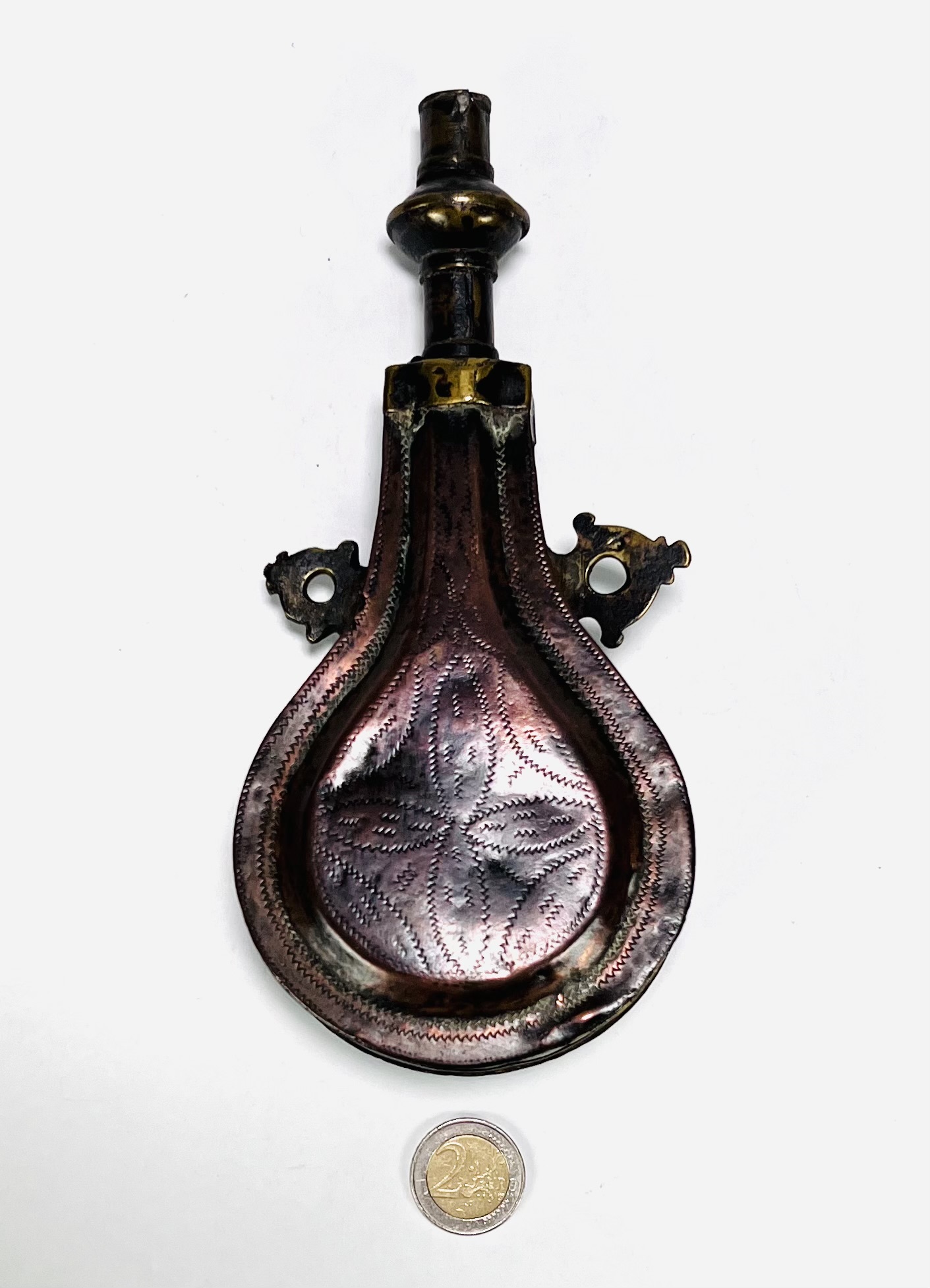 Oriëntaalse koperen en messing rijkelijk bewerkte kruitbus, 19e eeuw. |
