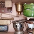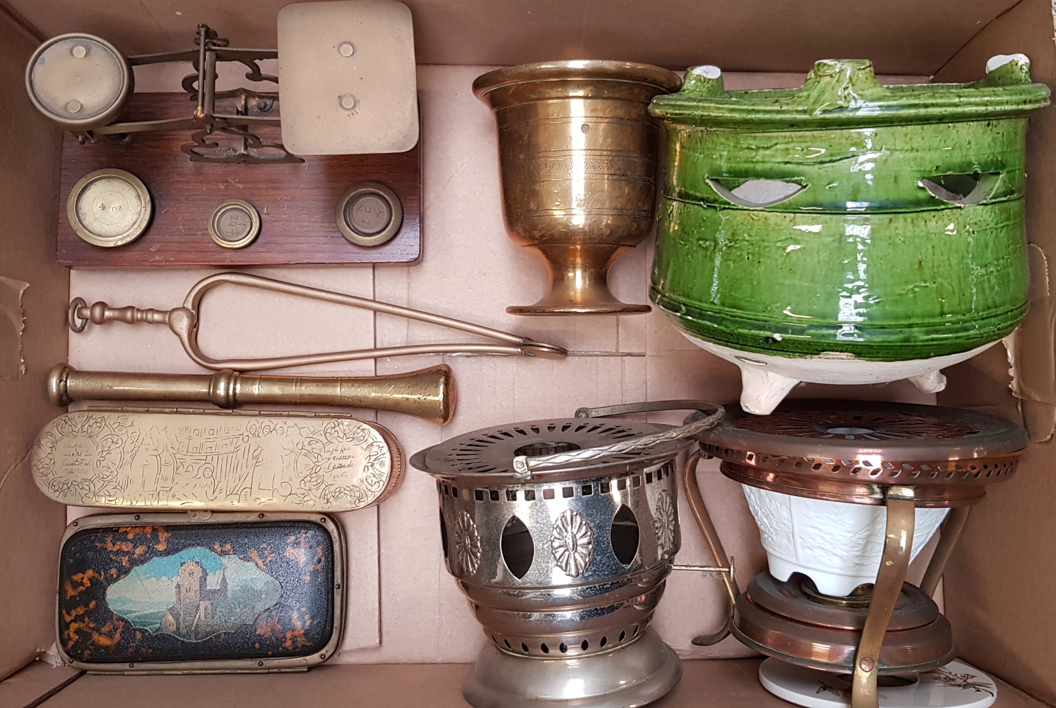 Lot curiosa met een weegschaal, messing tang, twee theelichten, messing stamper, vijzeltje en aardewerken vuurtest. 20e eeuw. |