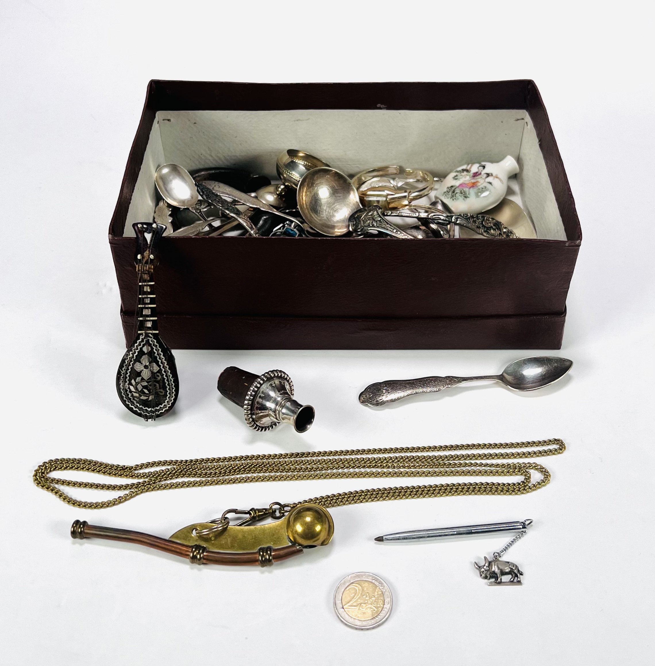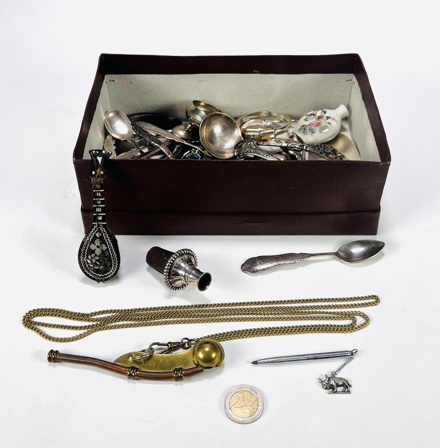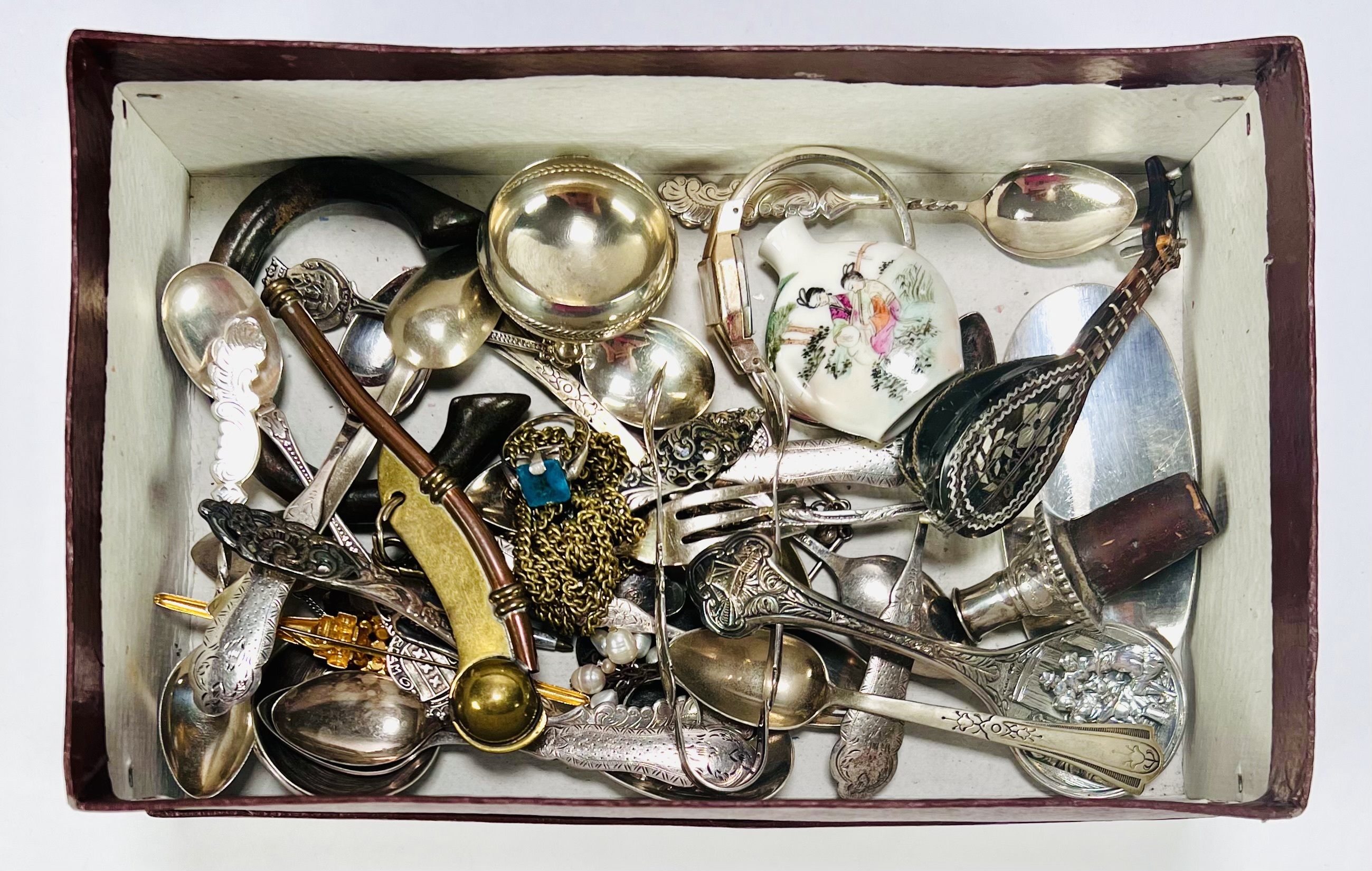 Lot curiosa met snuff bottle, armband, lepeltjes, flessenstop en meer. 20e eeuw. |