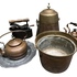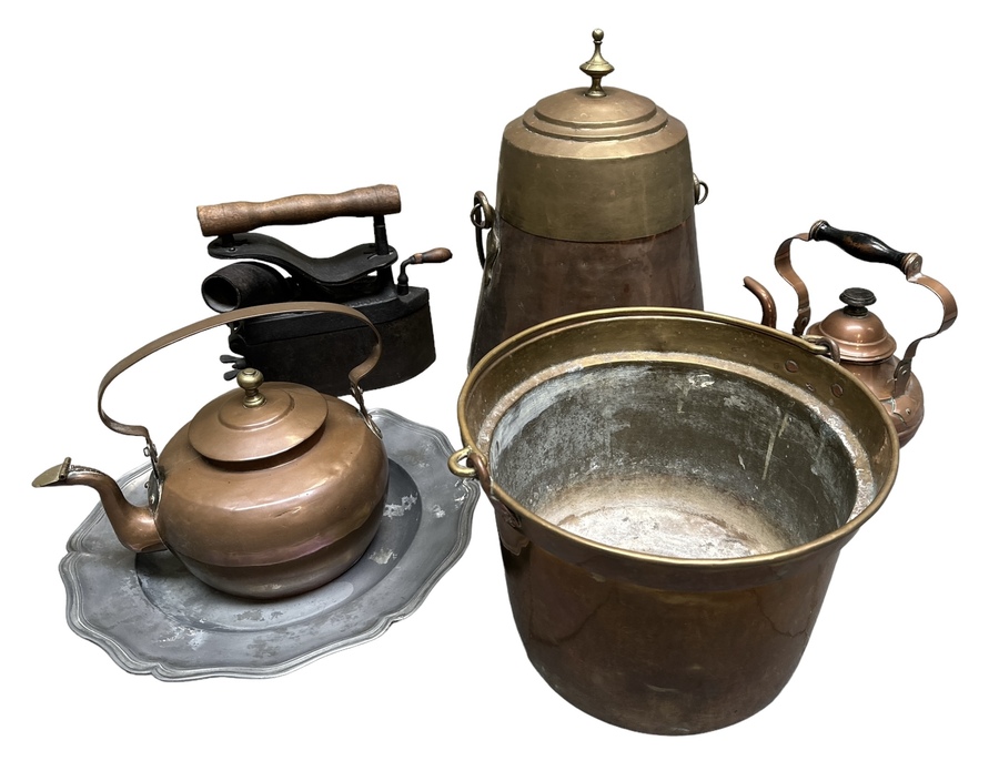 Divers lot koper en tin met ketel, akers, doofpot, strijkijzer en tinnen bord. 19e/20e eeuw. |