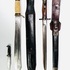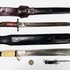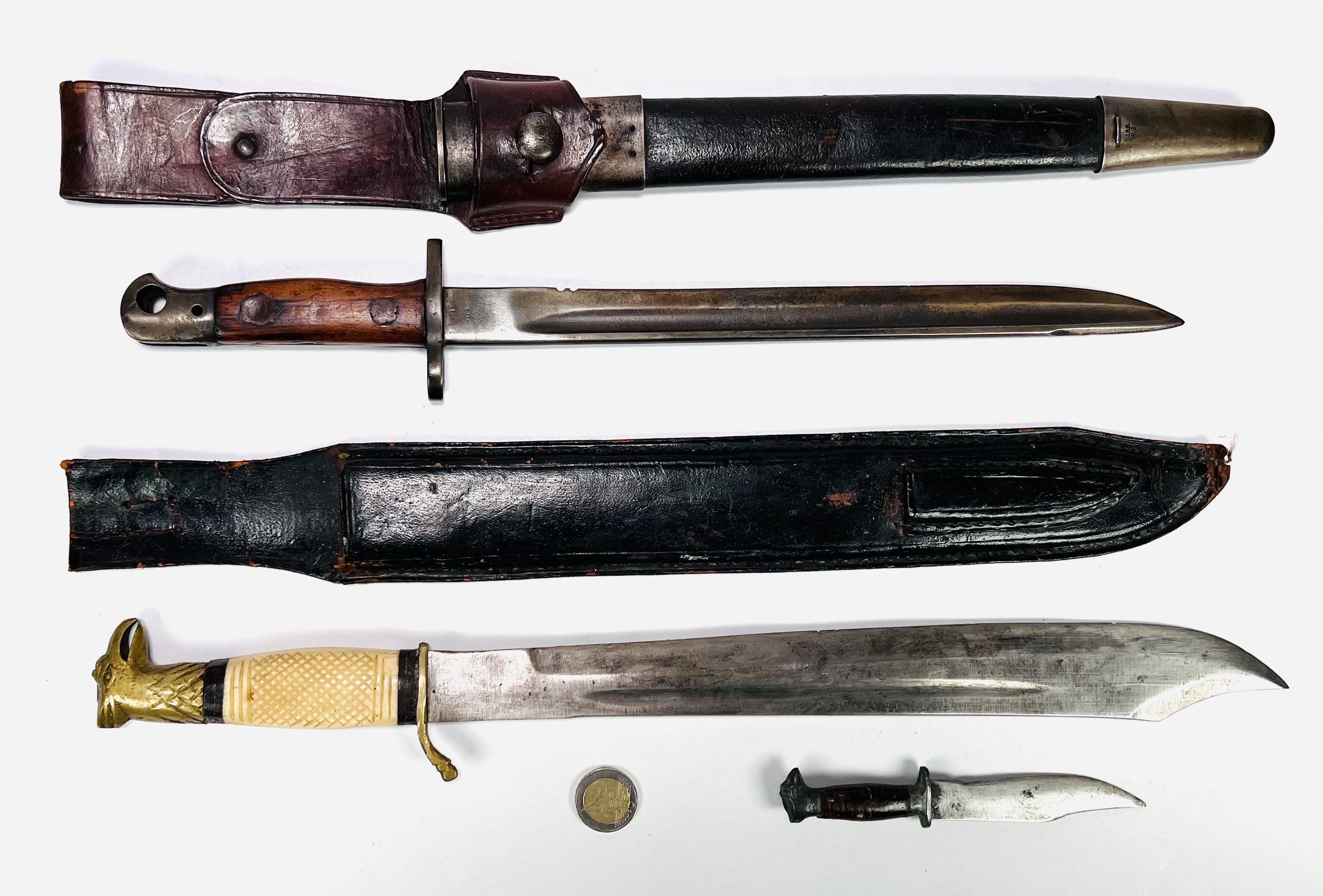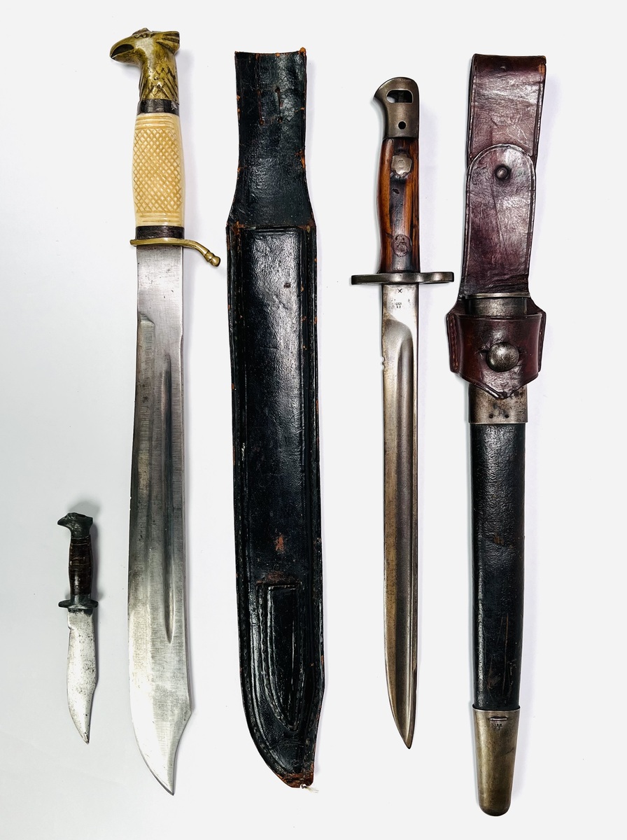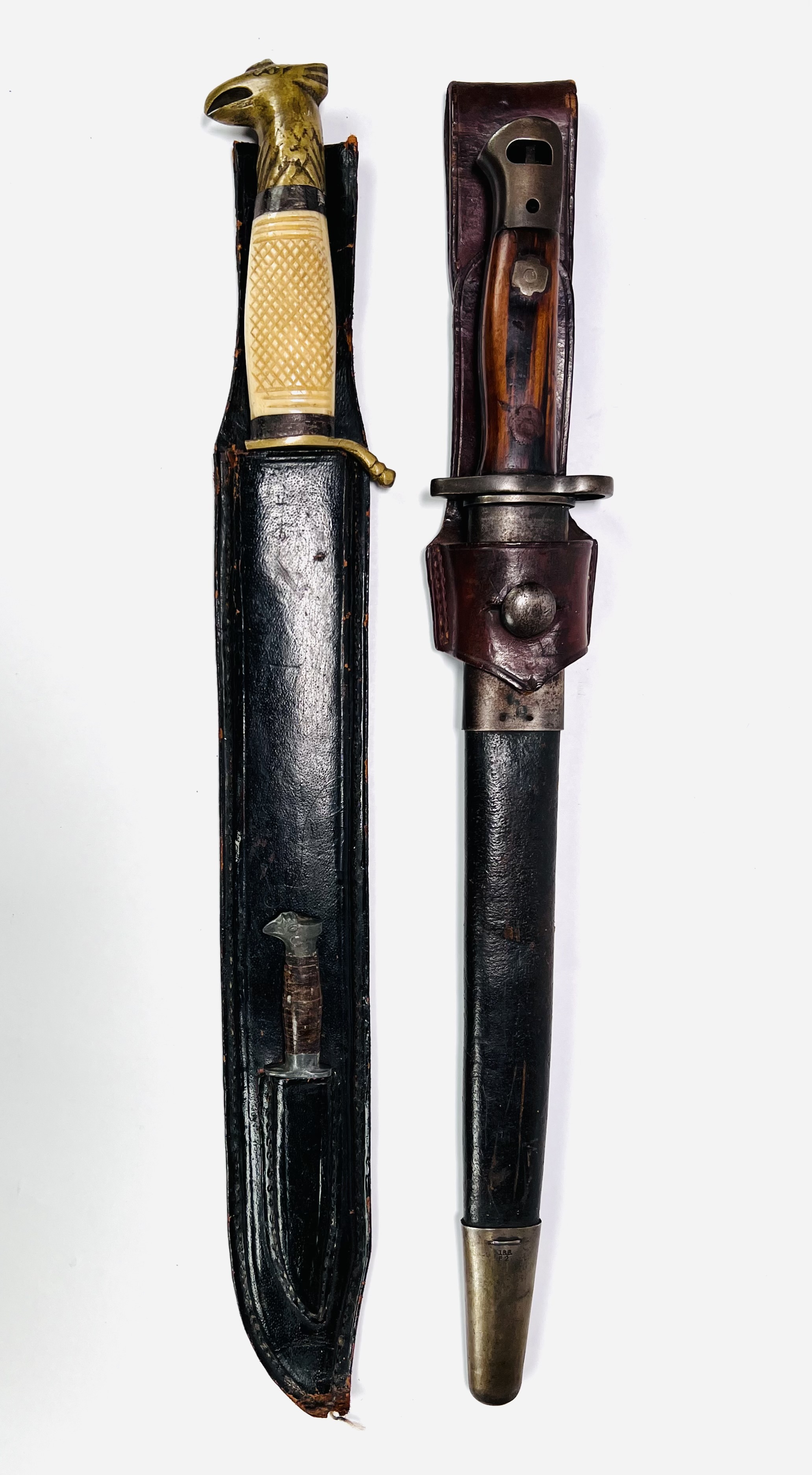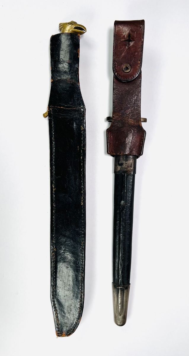 Bajonet met houten heft gemerkt F1 100, lederen schede voorzien van metalen elementen gemerkt JBB B2. Daarnaast een dolk met benen handvat en adelaarskop in lederen schede met kleinere dolk. 20e eeuw. |
