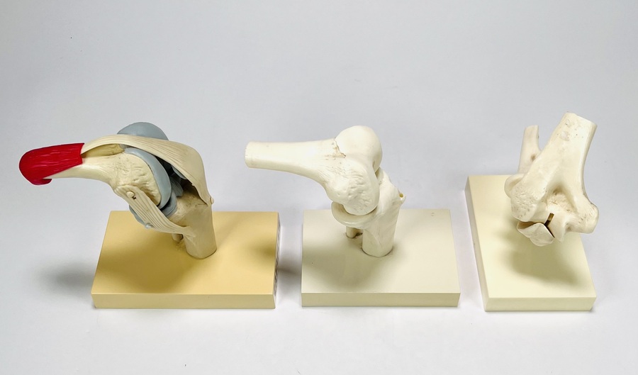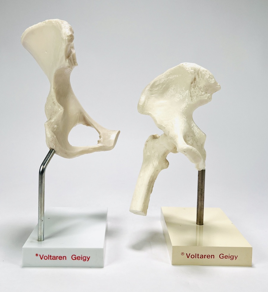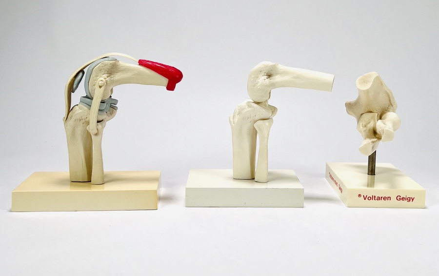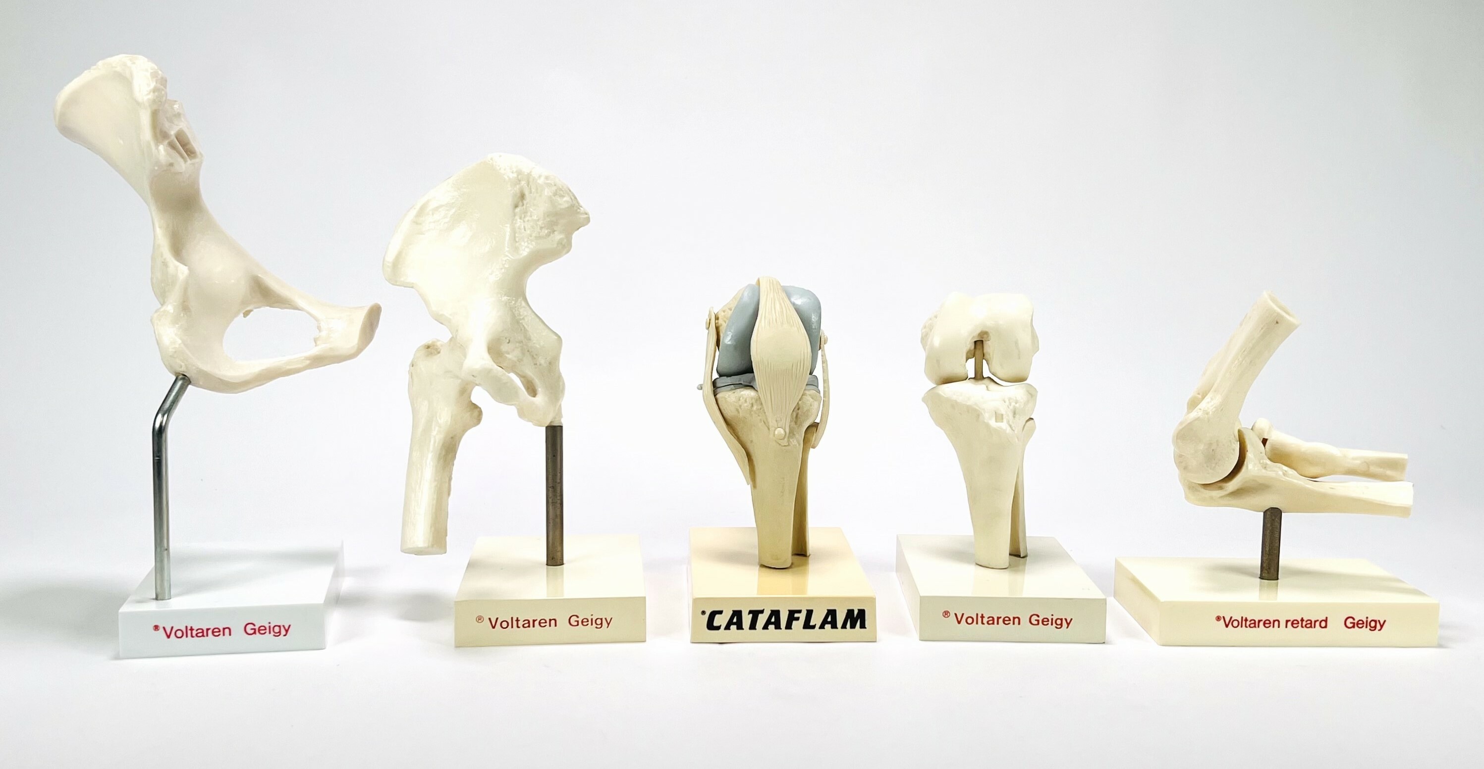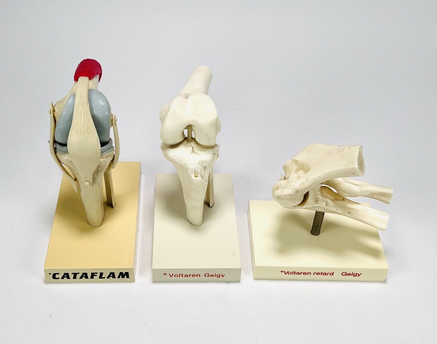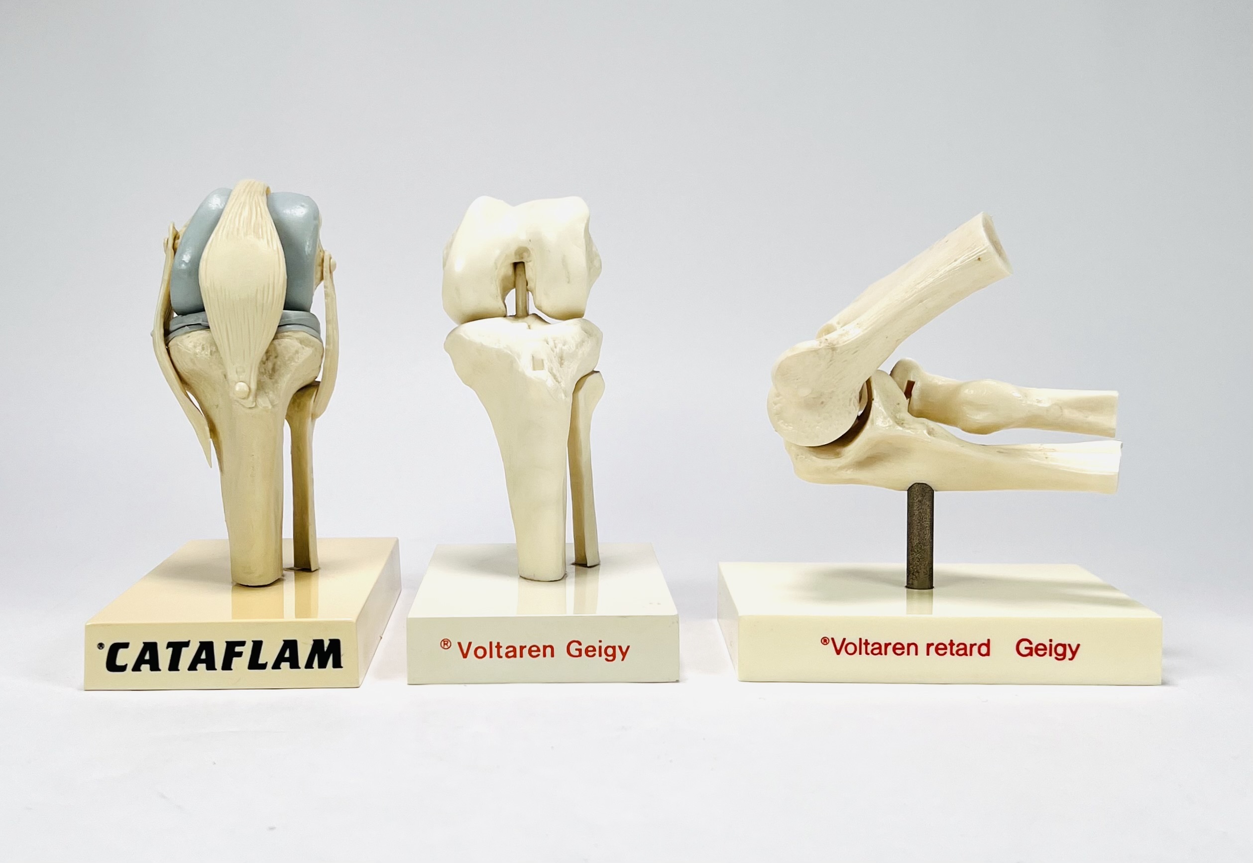 Vijf kunststoffen modellen van kniegewrichten, heupgewricht, bekkendeel en ellebooggewricht. Gemerkt Cataflam en Voltaren Geigy. Jaren 70/80. |