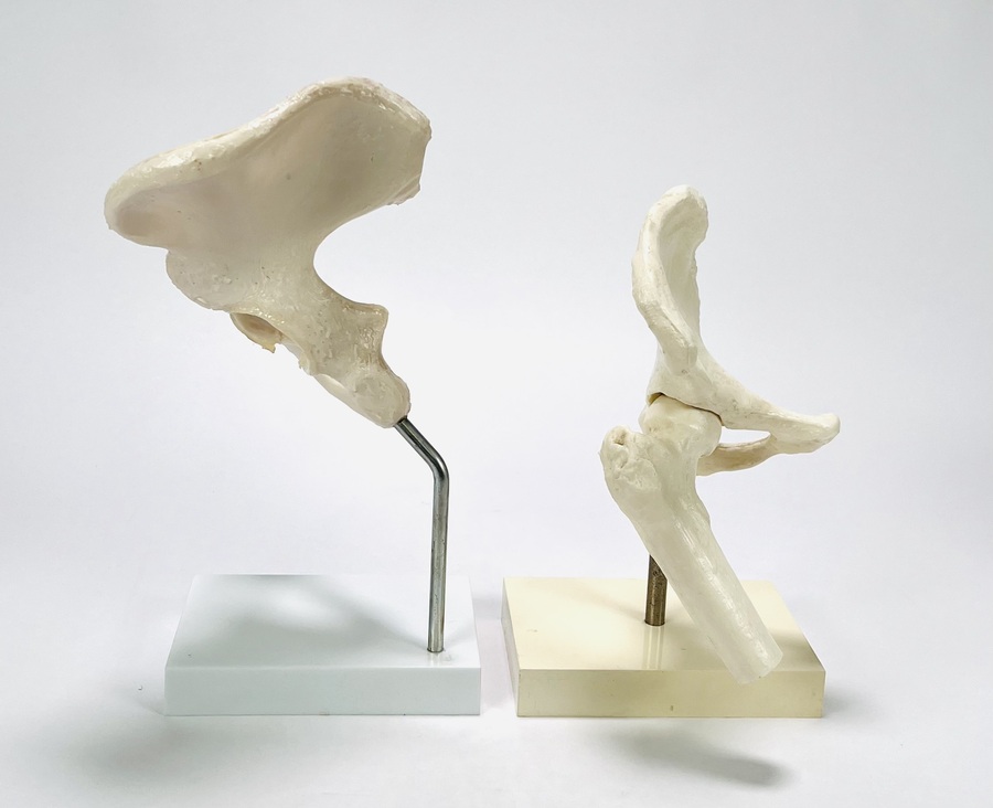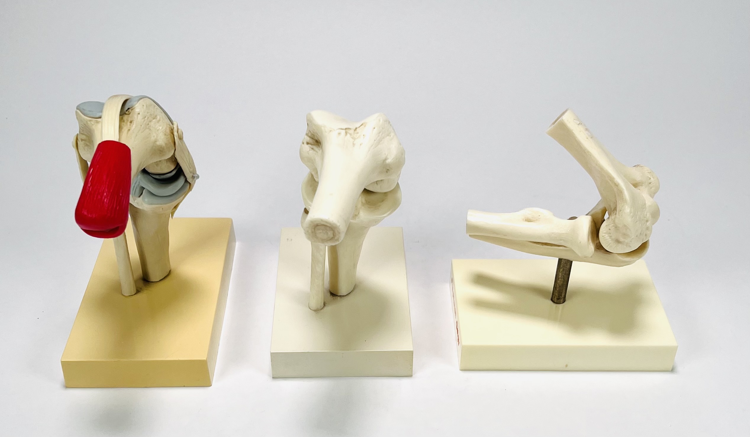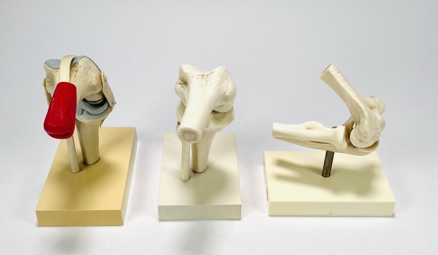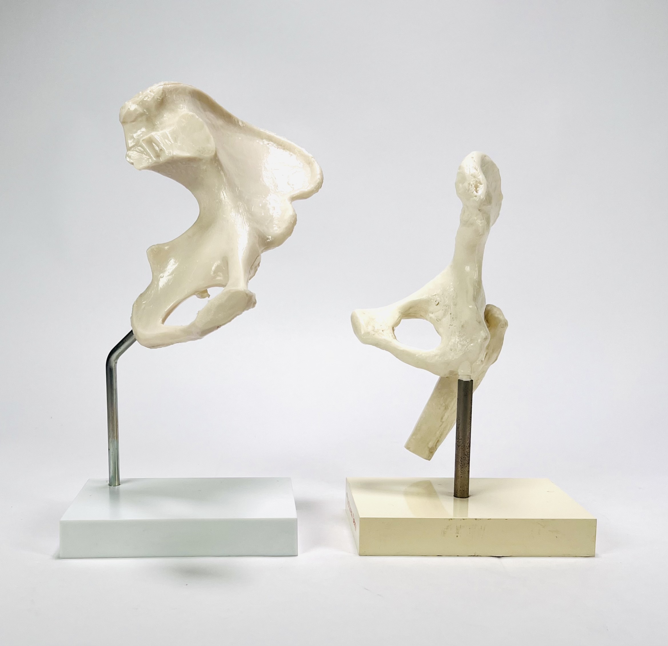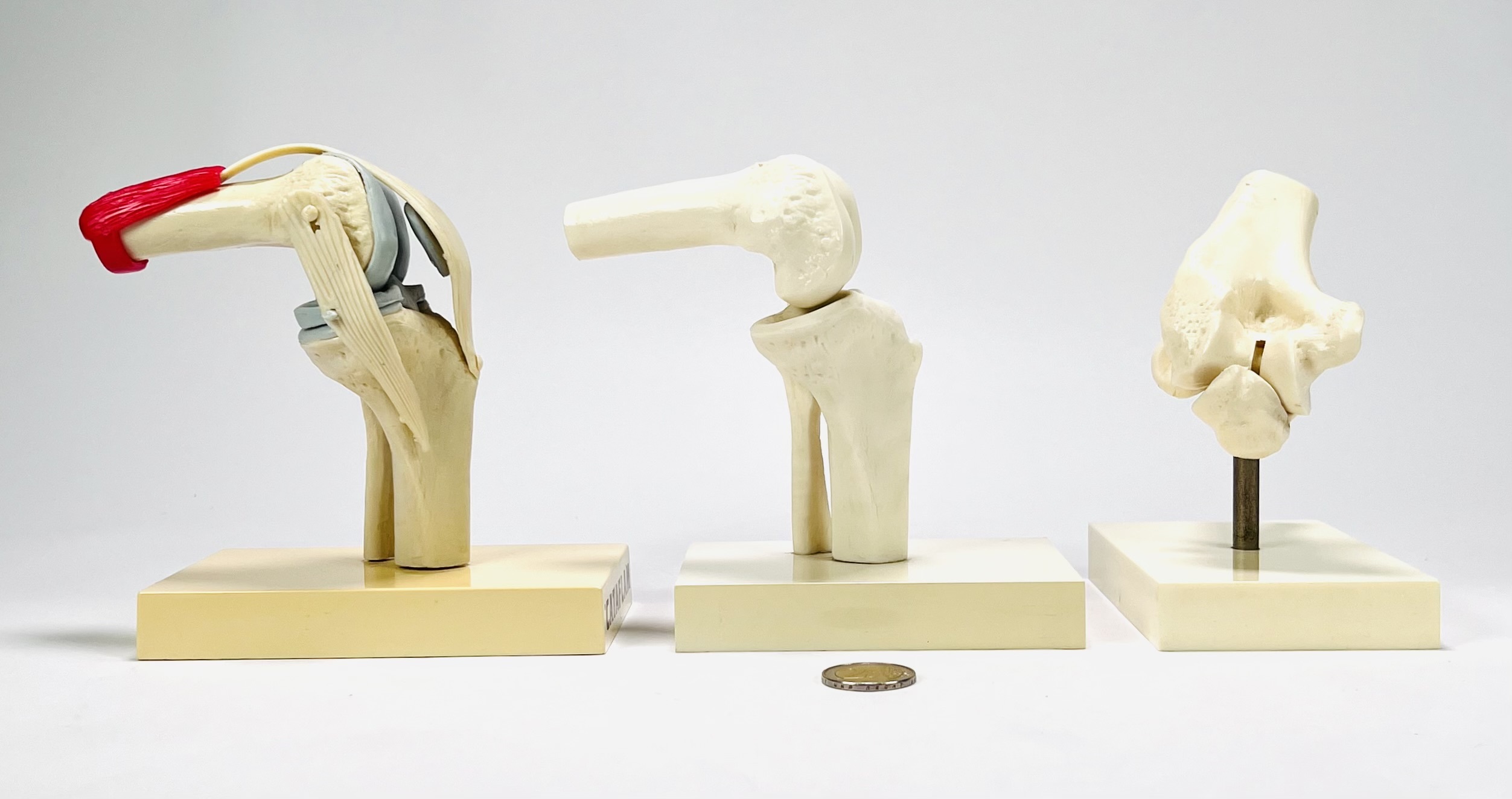 Vijf kunststoffen modellen van kniegewrichten, heupgewricht, bekkendeel en ellebooggewricht. Gemerkt Cataflam en Voltaren Geigy. Jaren 70/80. |