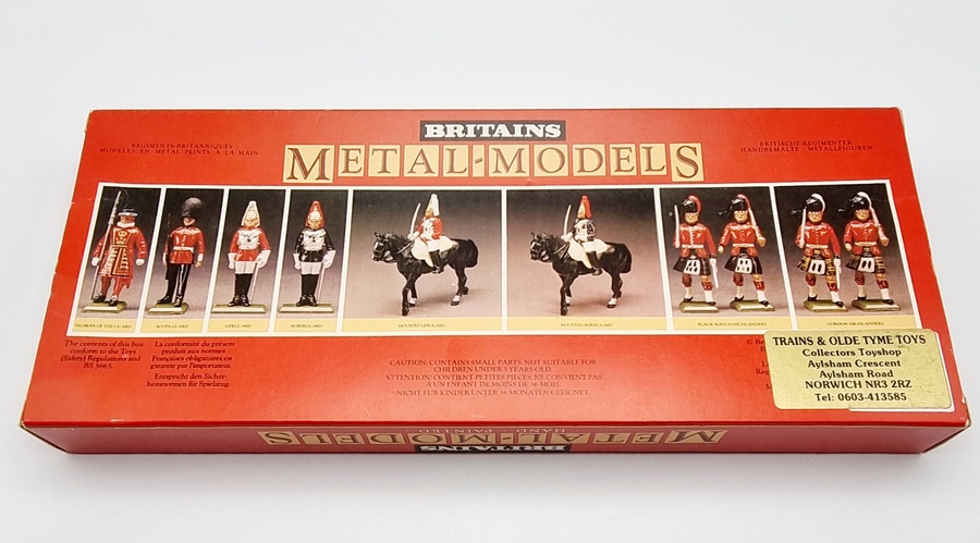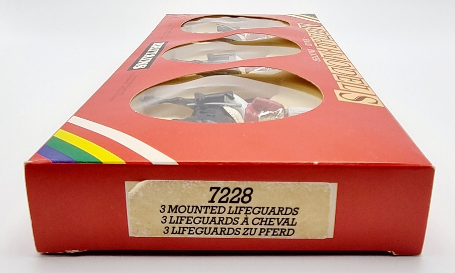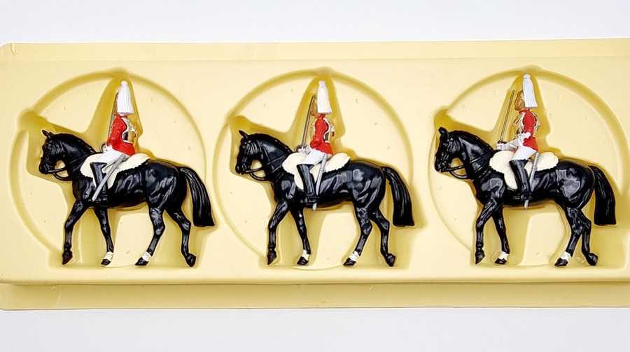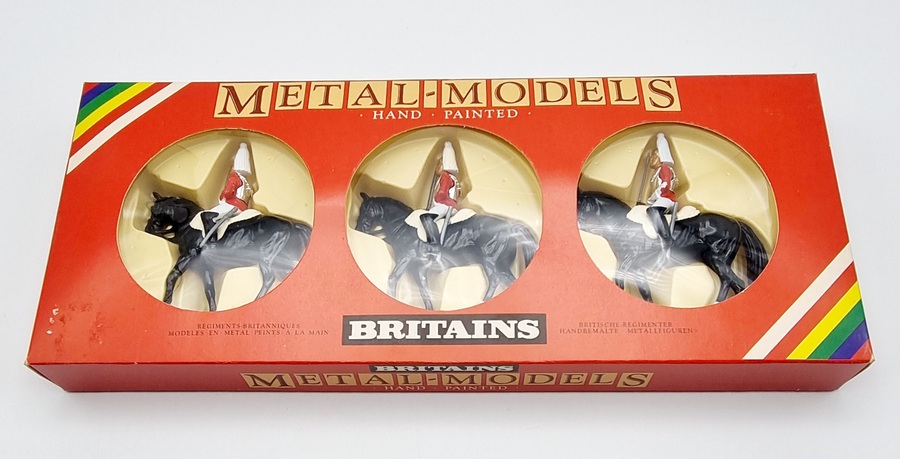 Uit de Britains Metal-Models serie drie handbeschilderde Mounted Lifeguards in originele rode vensterdoos. Catalogus nummer 7228 uit 1986. |