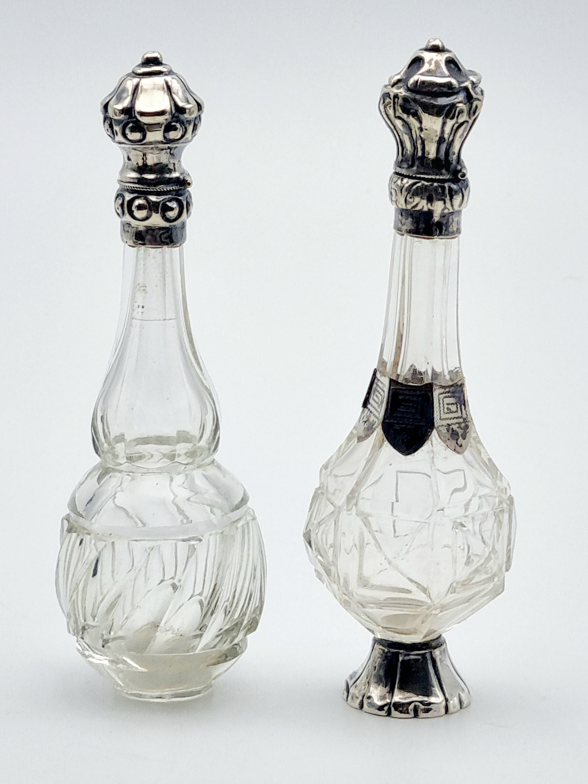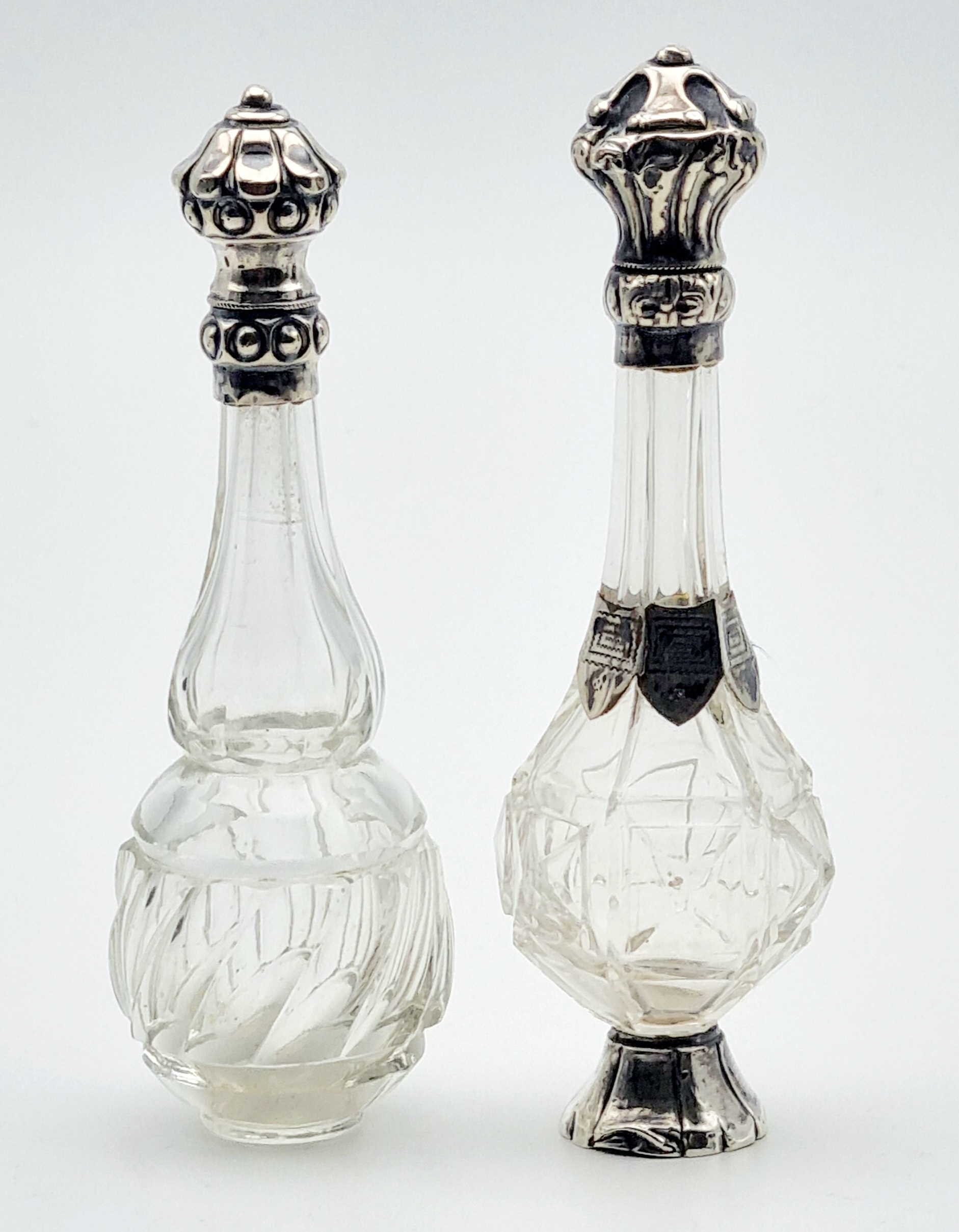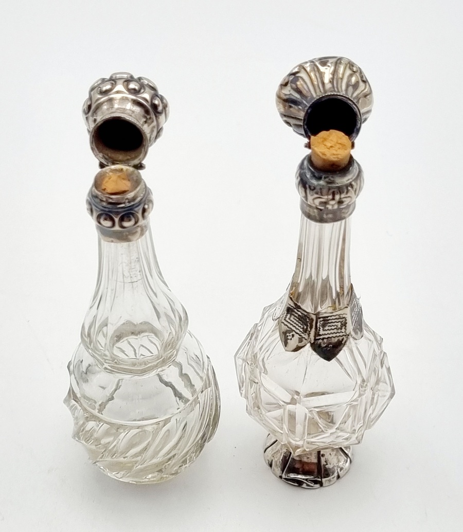 Twee glazen parfumflesjes met zilveren montuur en dop. Zilver gemerkt met zwaardjes, eind 19e eeuw. |
