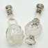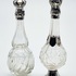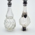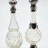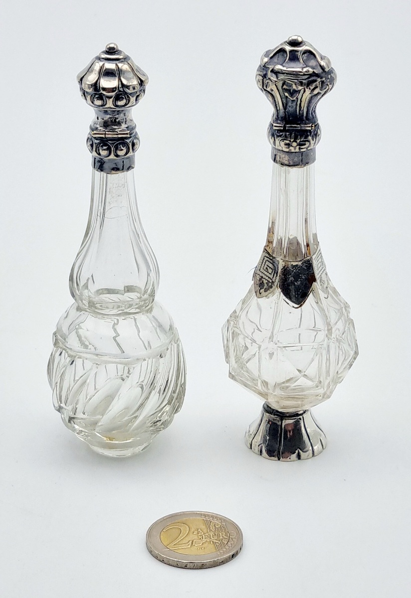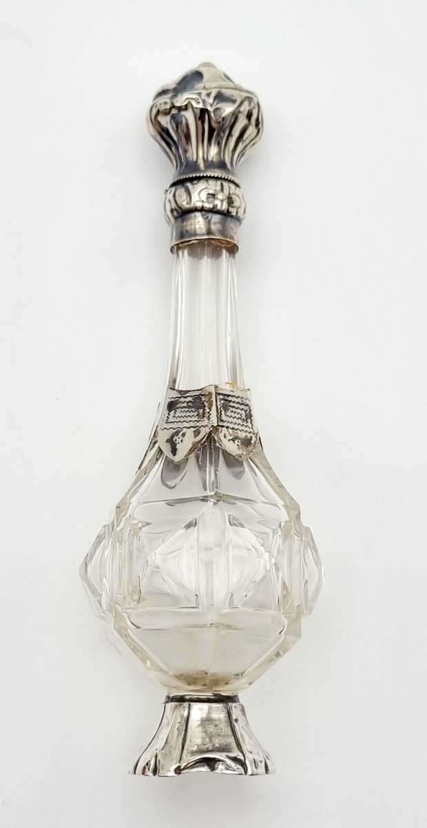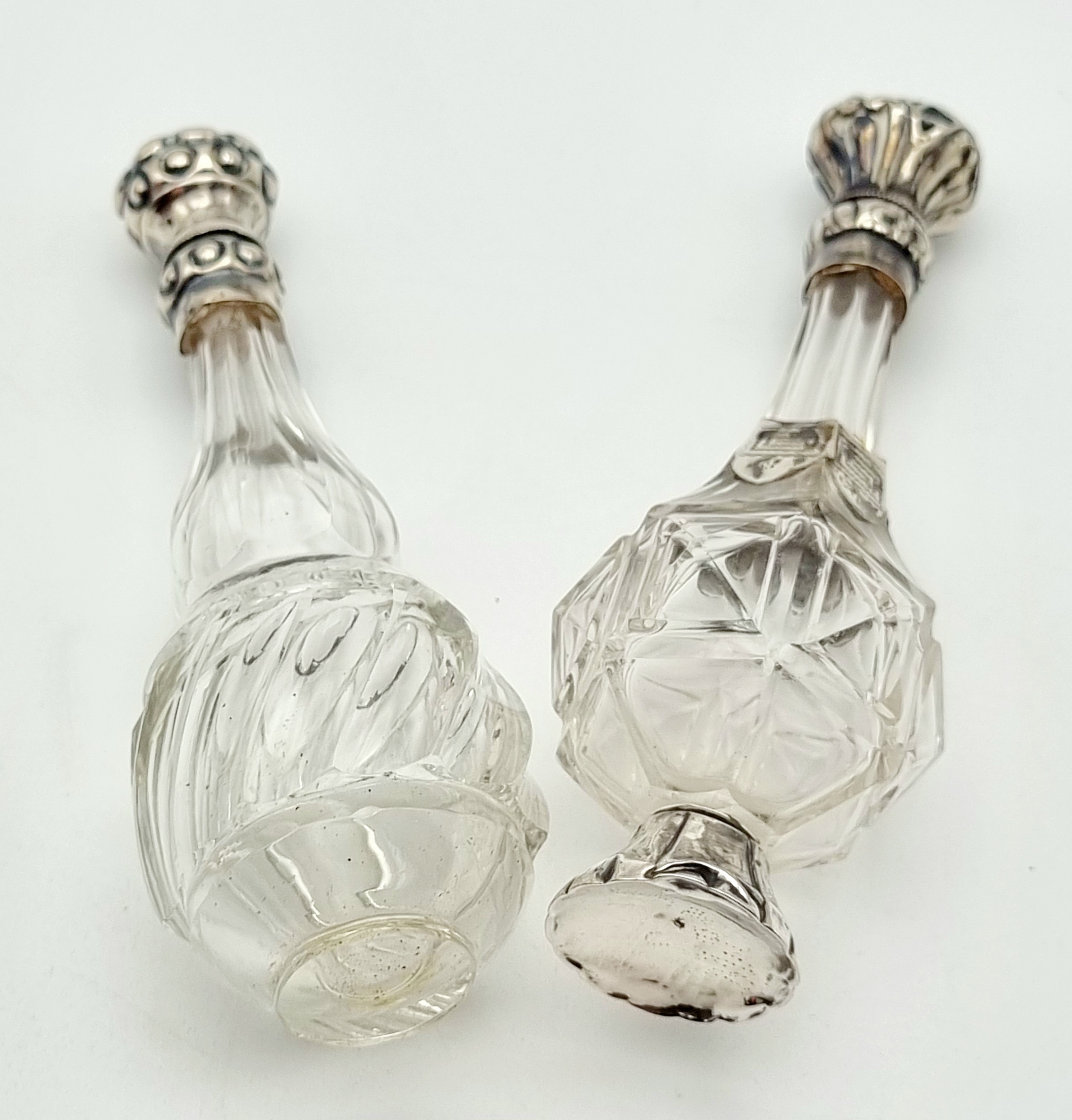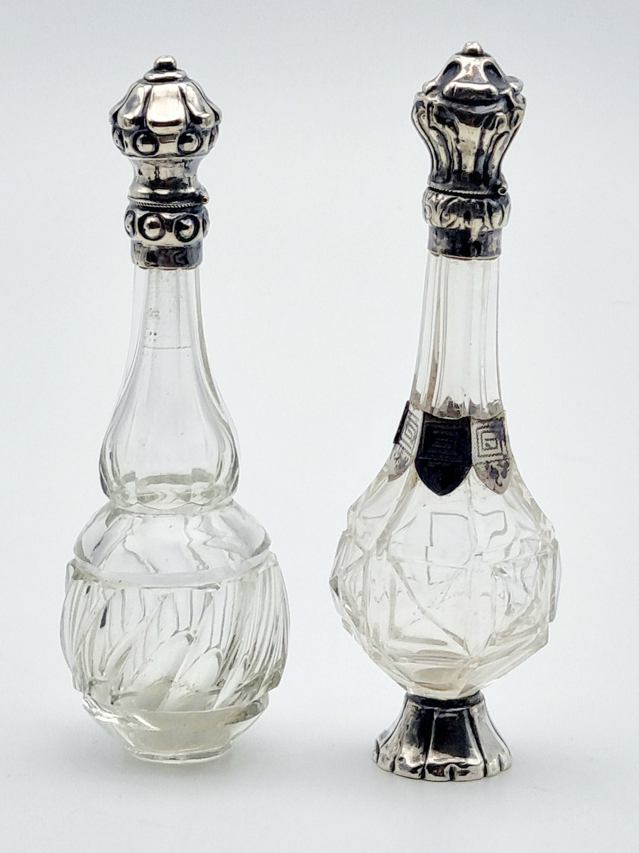 Twee glazen parfumflesjes met zilveren montuur en dop. Zilver gemerkt met zwaardjes, eind 19e eeuw. |
