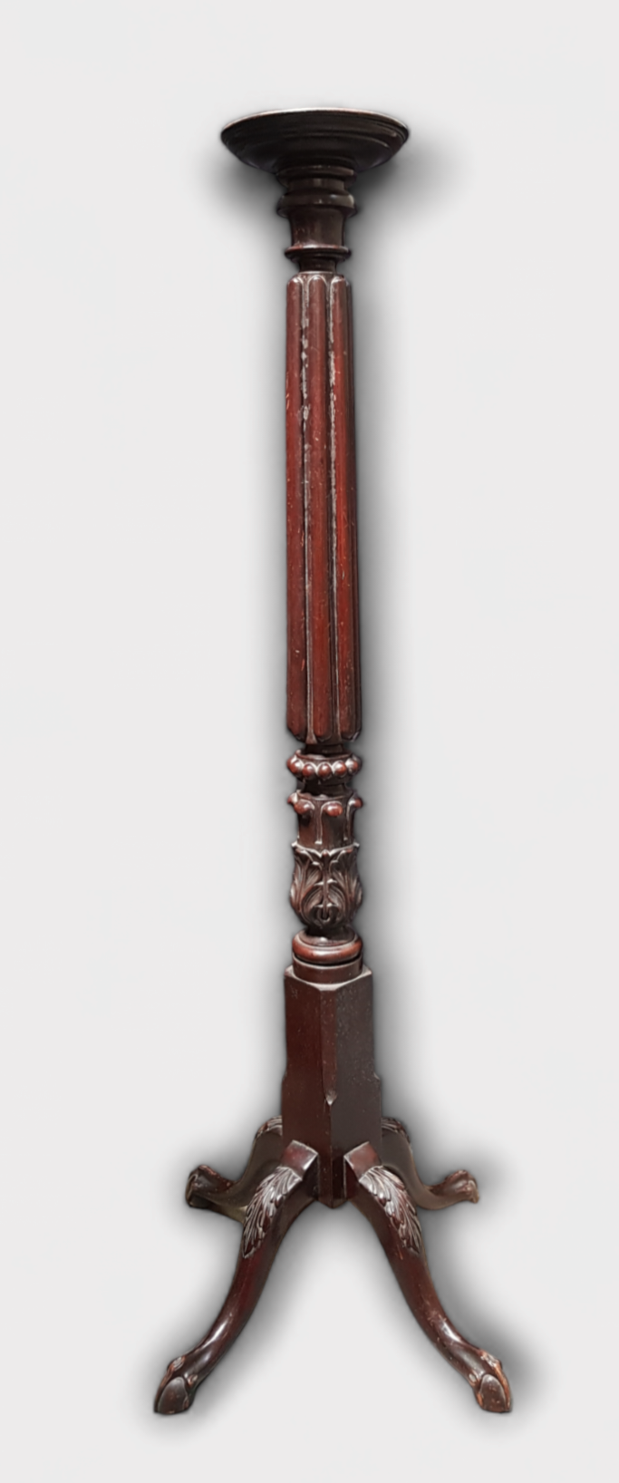 Mahoniehouten piëdestal op viersprant gedecoreerd met acanthusbladeren. betreft de hoog model. Omstreeks 1900. |